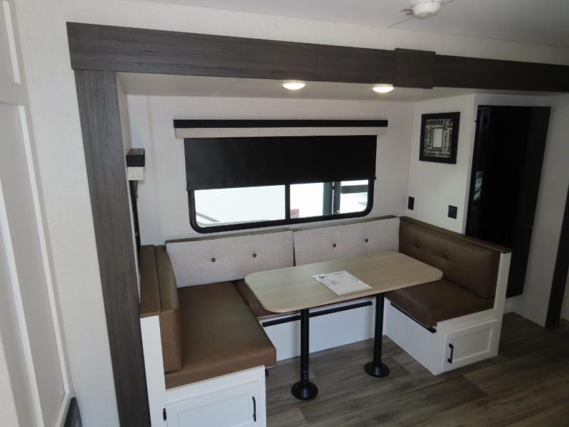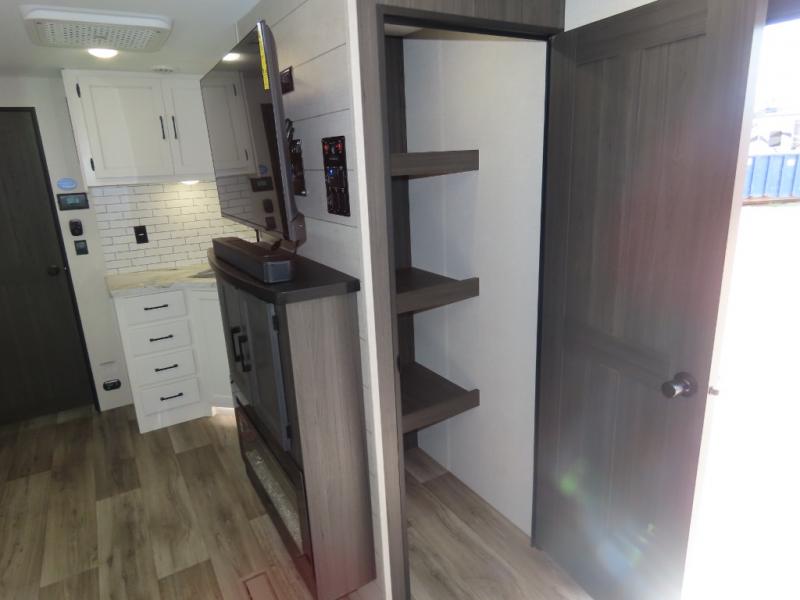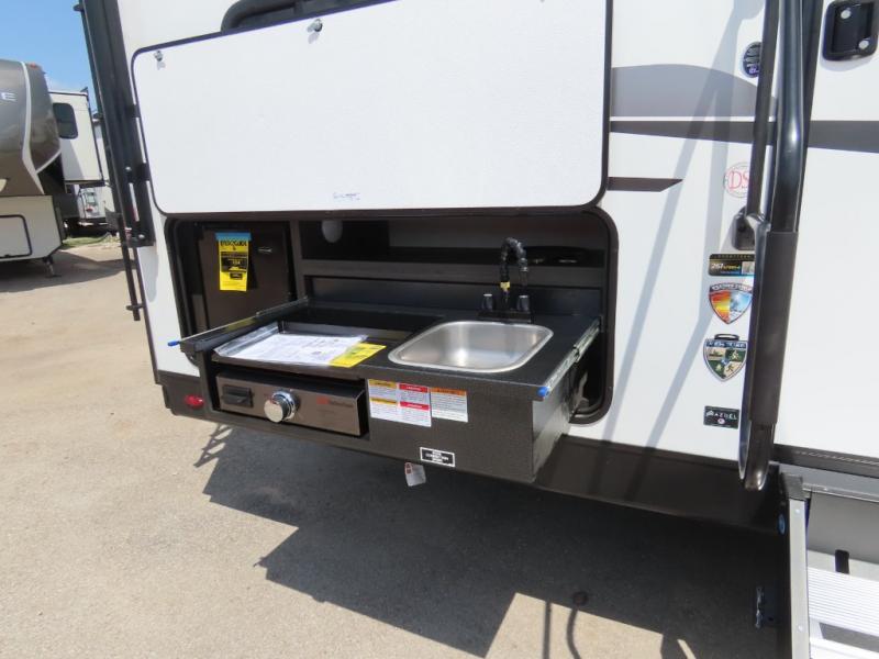 A front private bedroom with a Sleep Tight queen bed is sure to make you feel at home, while your guests take the double-size bunks in the back. There is a full bath right next to the bunks for easy nighttime use, and any other guests can sleep on the U-shaped dinette with flipside reversible cushions. There is plenty of storage space, including a walk-in pantry with coat hooks, dual bedside closets to keep clothes wrinkle-free, and an exterior pass-thru storage for camp gear! A full kitchen inside will let you cook in comfort when the weather isn't cooperating, and an exterior campfire cafe includes an outdoor refrigerator, sink, and griddle for a sunrise breakfast!