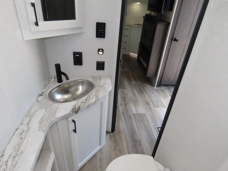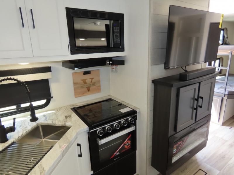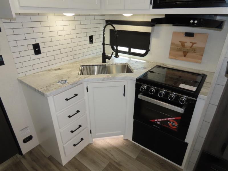 Every Venture RV SportTrek lightweight travel trailer is constructed to offer peace of mind and the comforts of home! Their purposeful residential kitchens are packed with handy features like a Furrion oven and three burner cooktop, a large stainless steel sink with a cover and dish drying rack, plus a 12V refrigerator. You will find plenty of storage throughout, including Safe-Tek hidden storage with a charging center and StorMore nightstands on either side of the bed behind the full-length closets. And the magnetic slam-latch baggage doors and spacious pass-through storage area will hold your outdoor gear in place. They even come with a hot and cold exterior shower and SporTrek's Weather Shield which includes a forced air heated and enclosed underbelly, high output A/C ducting, and more features that will let you extend your camping season. You will also love the new residential upgraded furniture, Serta memory foam mattress, barn style passage doors, and many more comforts!