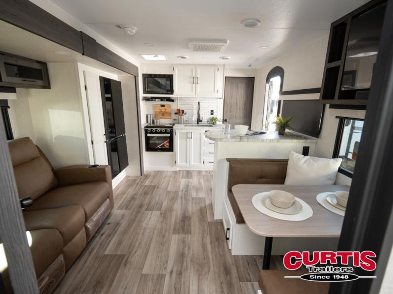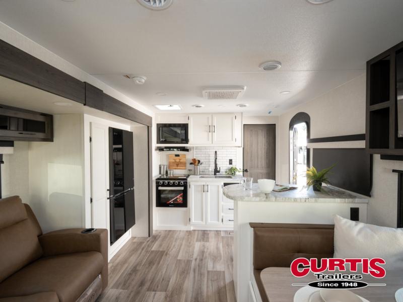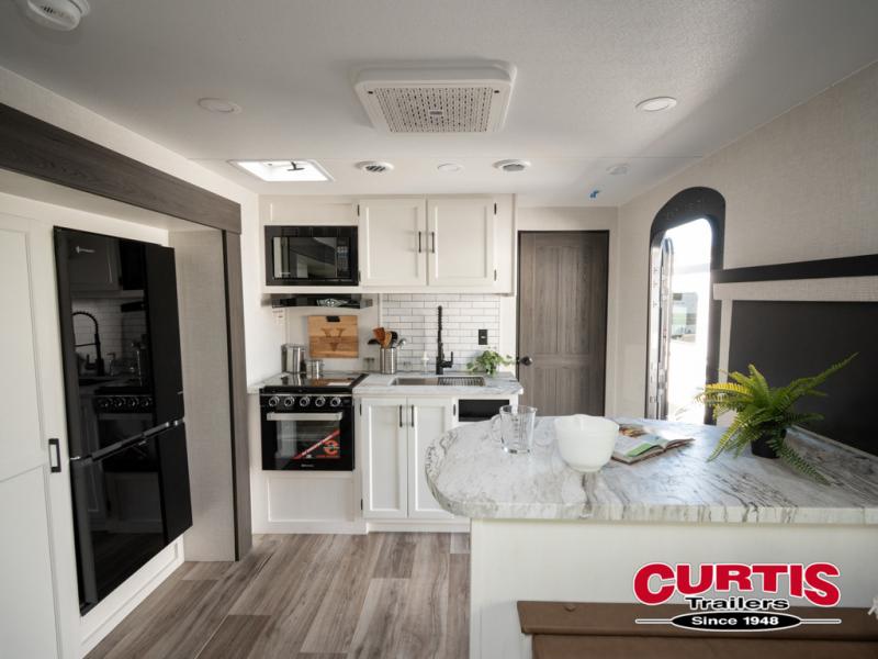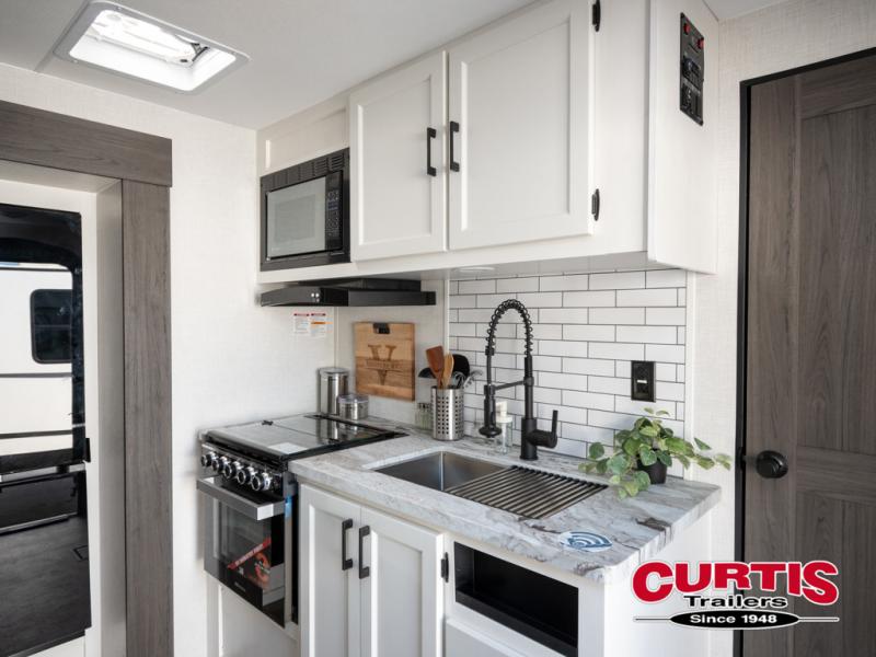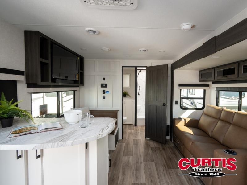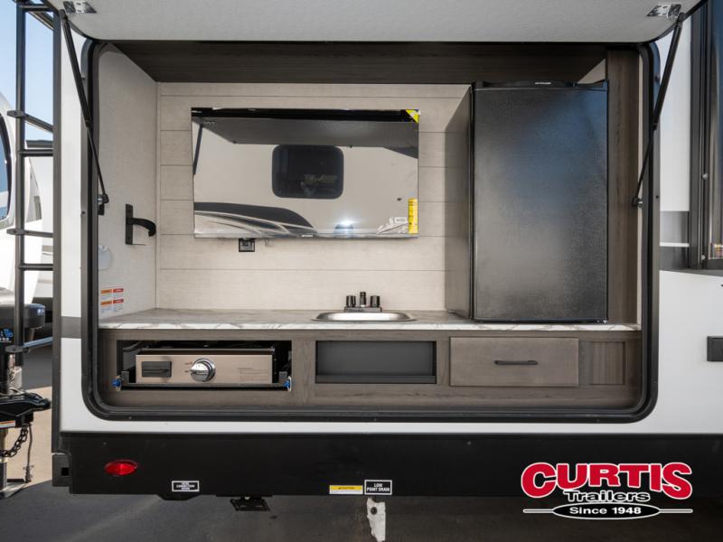 It won't be hard to find comfort in this travel trailer for three to four. Once you arrive at the campground, you can put out the 14' power awning, unload your camp chairs from the pass-thru storage, then start lunch on the exterior kitchen with a griddle. There is also an exterior 40" Smart TV to watch the big game outdoors! If the weather isn't cooperating, you can head inside to relax on the 70" sofa, or play a game at the Sit N' Slide table. You can also choose optional theater seats or a tri-fold sofa in place of the sofa if you prefer this seating arrangements. The kitchen includes appliances to make home-cooked meals, including a 27" oven with a air fryer. The Sleep Tight queen bed in the front private bedroom is sure to bring a great night's rest after you've played all day, and don't overlook the full rear bath, complete with an optional washer and dryer!