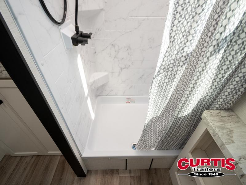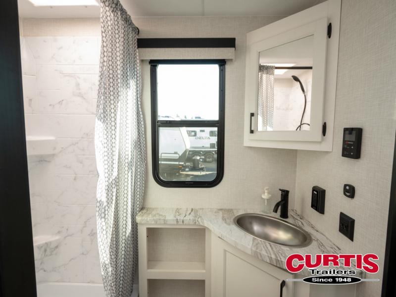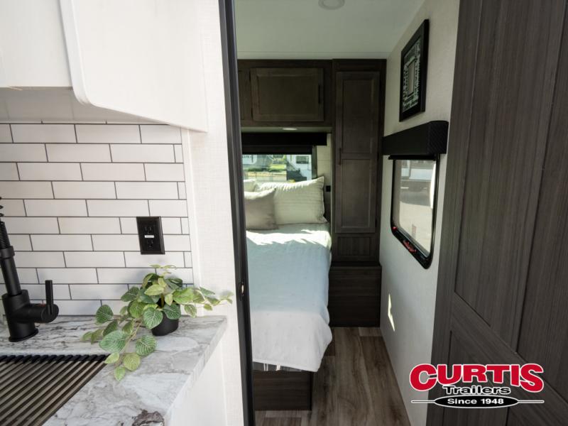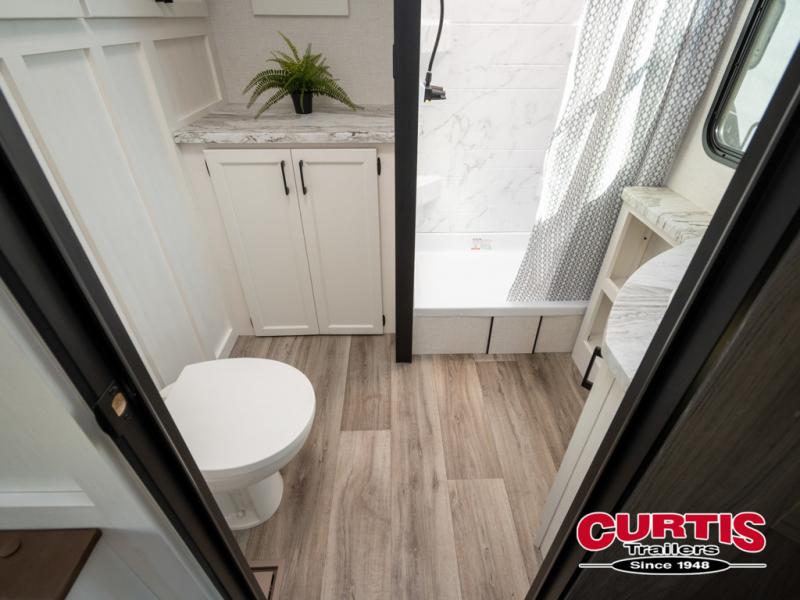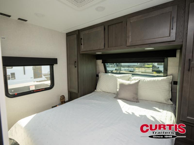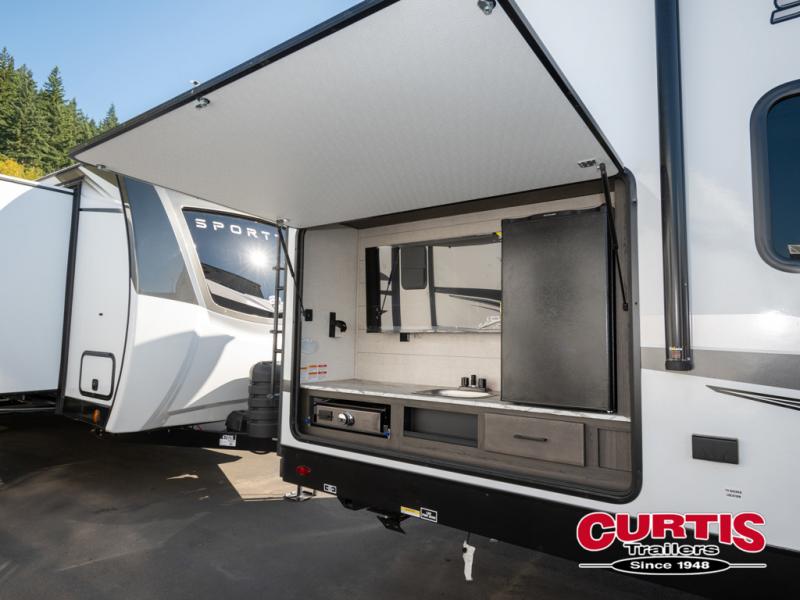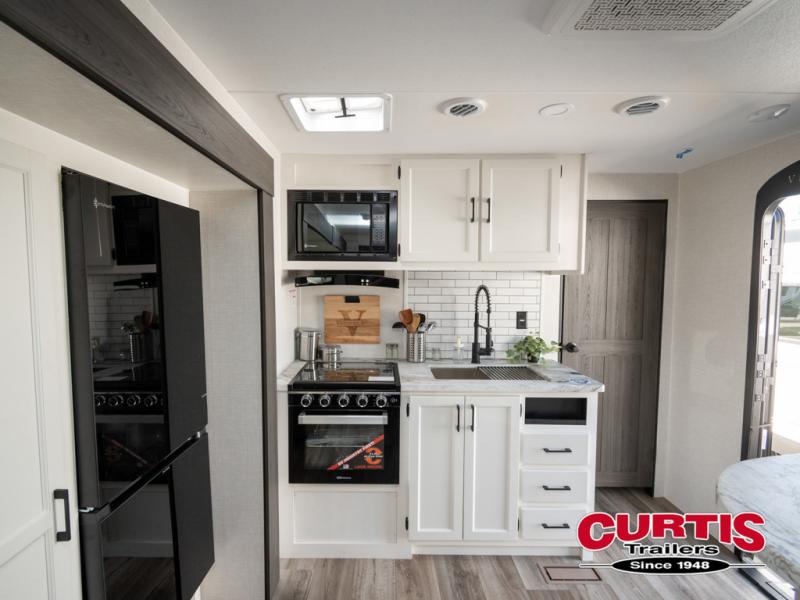 It won't be hard to find comfort in this travel trailer for three to four. Once you arrive at the campground, you can put out the 14' power awning, unload your camp chairs from the pass-thru storage, then start lunch on the exterior kitchen with a griddle. There is also an exterior 40" Smart TV to watch the big game outdoors! If the weather isn't cooperating, you can head inside to relax on the 70" sofa, or play a game at the Sit N' Slide table. You can also choose optional theater seats or a tri-fold sofa in place of the sofa if you prefer this seating arrangements. The kitchen includes appliances to make home-cooked meals, including a 27" oven with a air fryer. The Sleep Tight queen bed in the front private bedroom is sure to bring a great night's rest after you've played all day, and don't overlook the full rear bath, complete with an optional washer and dryer!