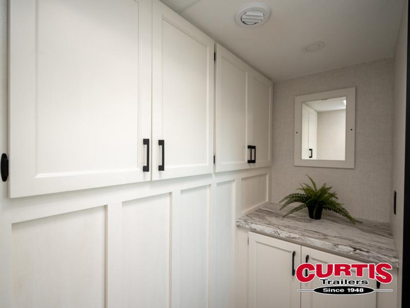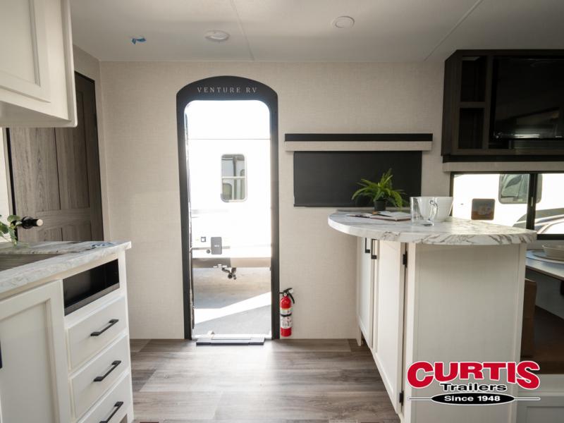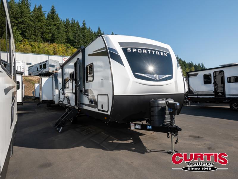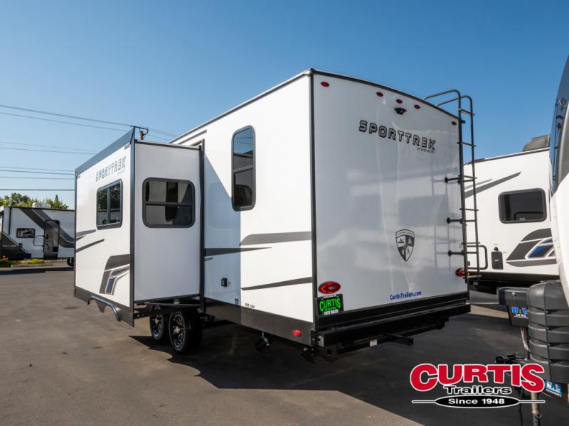 Every Venture RV SportTrek lightweight travel trailer is constructed to offer peace of mind and the comforts of home! Their purposeful residential kitchens are packed with handy features like a Furrion oven and three burner cooktop, a large stainless steel sink with a cover and dish drying rack, plus a 12V refrigerator. You will find plenty of storage throughout, including Safe-Tek hidden storage with a charging center and StorMore nightstands on either side of the bed behind the full-length closets. And the magnetic slam-latch baggage doors and spacious pass-through storage area will hold your outdoor gear in place. They even come with a hot and cold exterior shower and SporTrek's Weather Shield which includes a forced air heated and enclosed underbelly, high output A/C ducting, and more features that will let you extend your camping season. You will also love the new residential upgraded furniture, Serta memory foam mattress, barn style passage doors, and many more comforts!