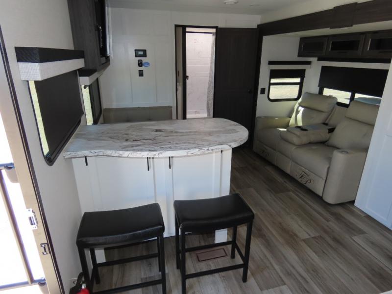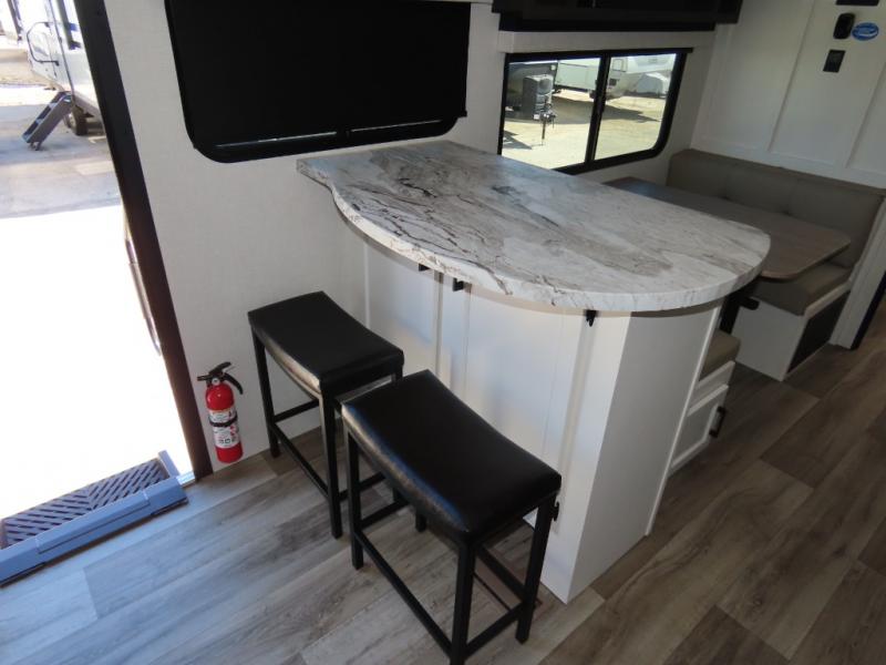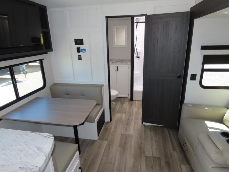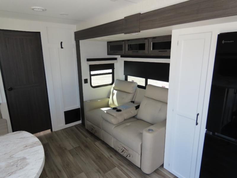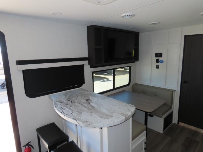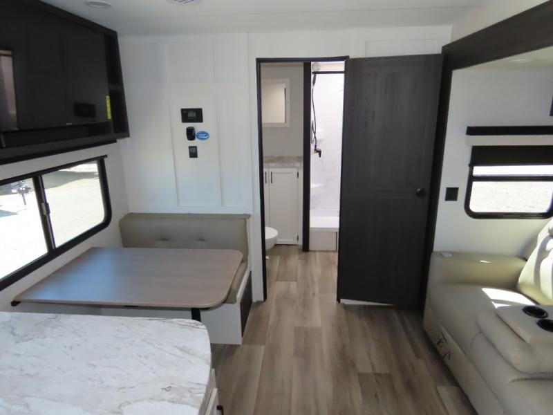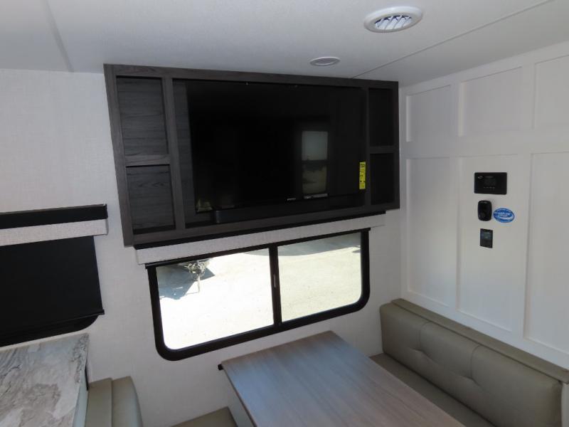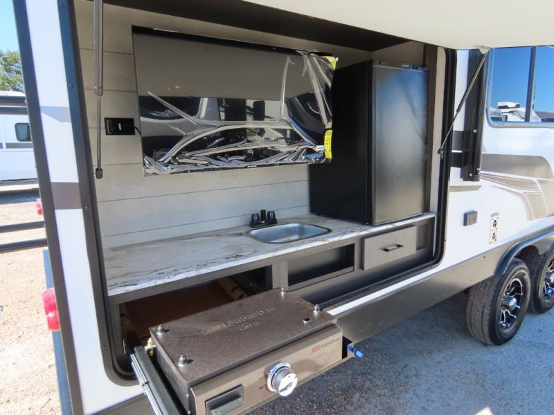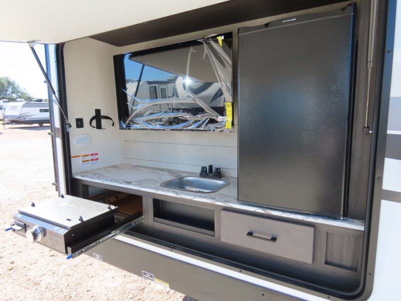 It won't be hard to find comfort in this travel trailer for three to four. Once you arrive at the campground, you can put out the 14' power awning, unload your camp chairs from the pass-thru storage, then start lunch on the exterior kitchen with a griddle. There is also an exterior 40" Smart TV to watch the big game outdoors! If the weather isn't cooperating, you can head inside to relax on the 70" sofa, or play a game at the Sit N' Slide table. You can also choose optional theater seats or a tri-fold sofa in place of the sofa if you prefer this seating arrangements. The kitchen includes appliances to make home-cooked meals, including a 27" oven with a air fryer. The Sleep Tight queen bed in the front private bedroom is sure to bring a great night's rest after you've played all day, and don't overlook the full rear bath, complete with an optional washer and dryer!