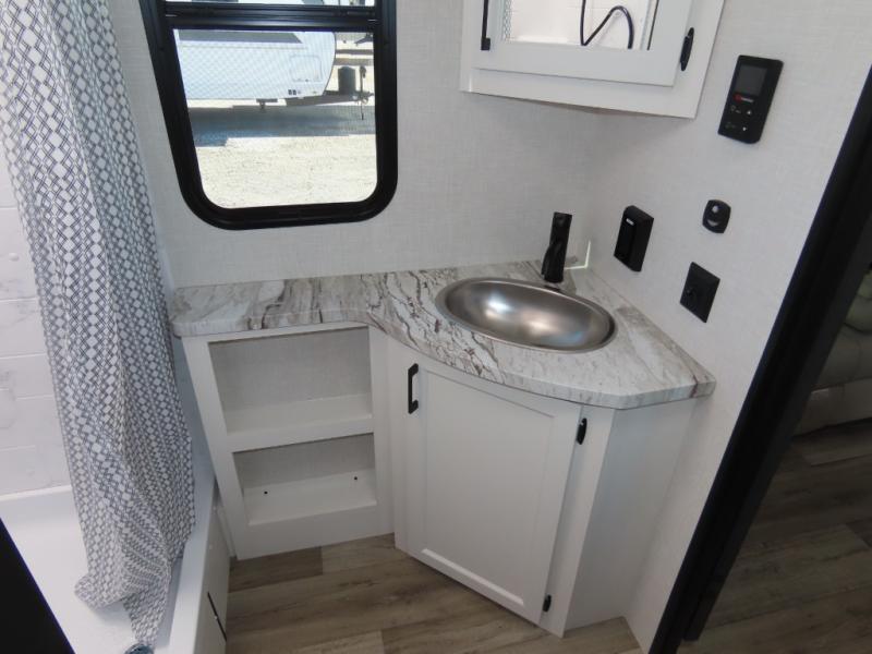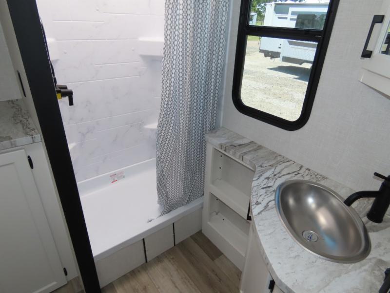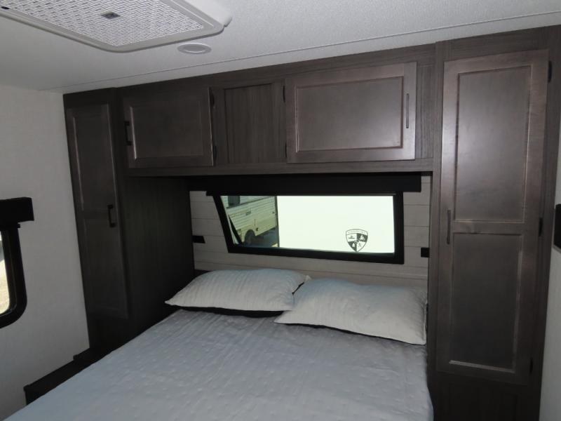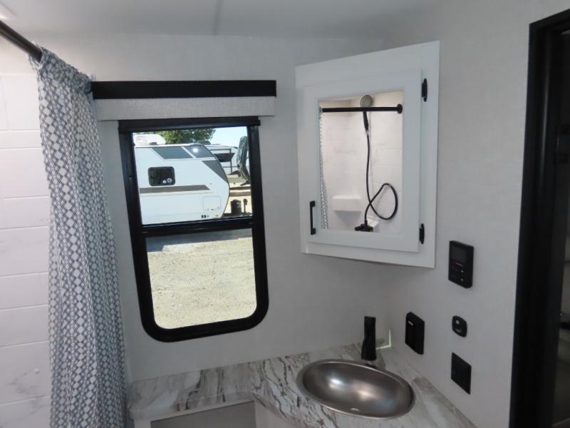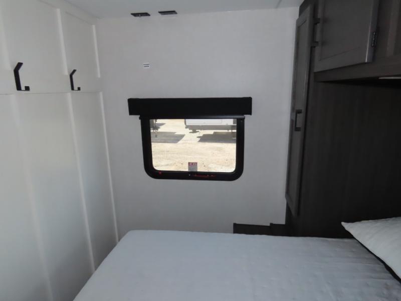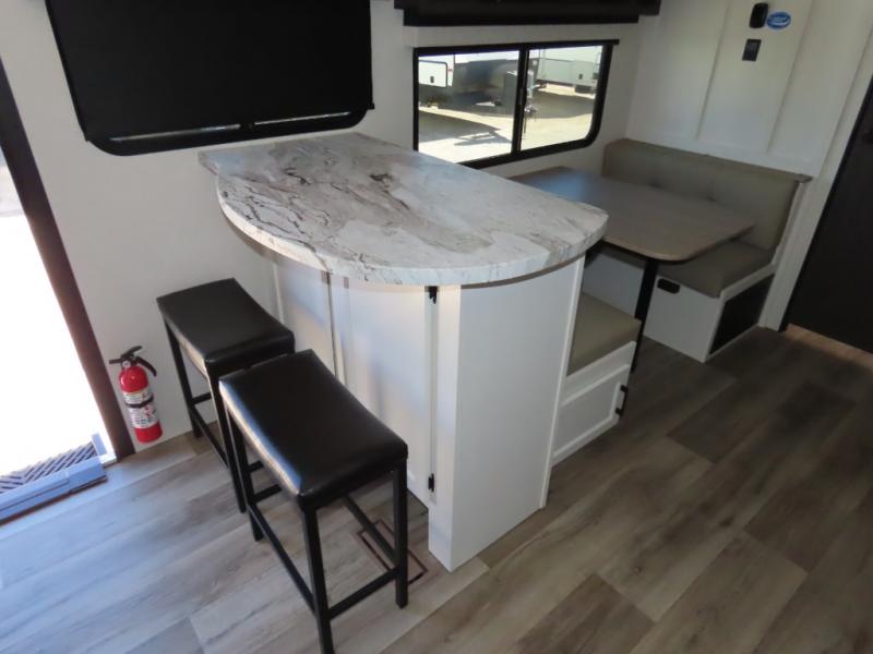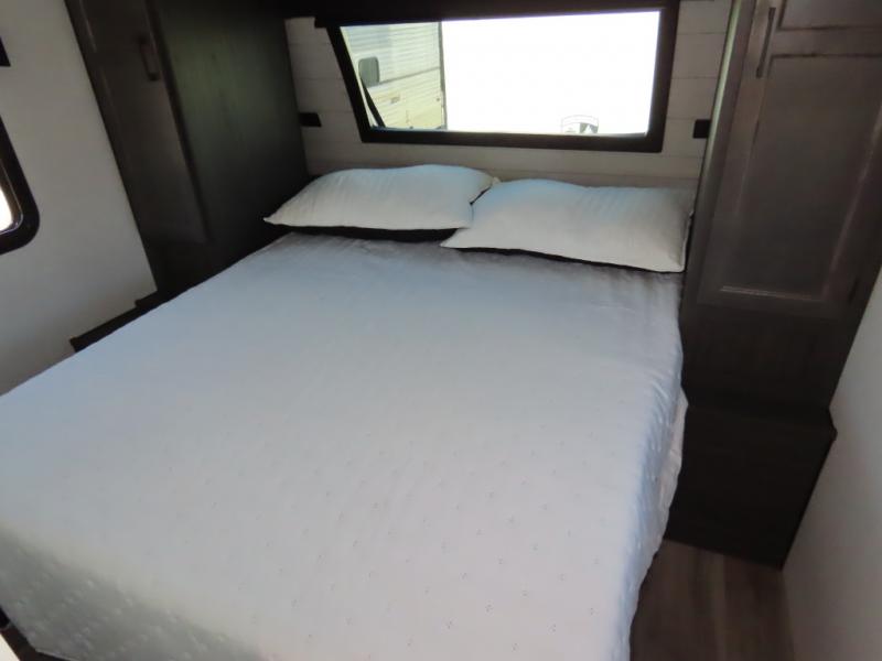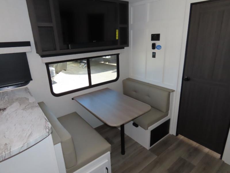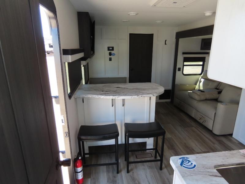 It won't be hard to find comfort in this travel trailer for three to four. Once you arrive at the campground, you can put out the 14' power awning, unload your camp chairs from the pass-thru storage, then start lunch on the exterior kitchen with a griddle. There is also an exterior 40" Smart TV to watch the big game outdoors! If the weather isn't cooperating, you can head inside to relax on the 70" sofa, or play a game at the Sit N' Slide table. You can also choose optional theater seats or a tri-fold sofa in place of the sofa if you prefer this seating arrangements. The kitchen includes appliances to make home-cooked meals, including a 27" oven with a air fryer. The Sleep Tight queen bed in the front private bedroom is sure to bring a great night's rest after you've played all day, and don't overlook the full rear bath, complete with an optional washer and dryer!