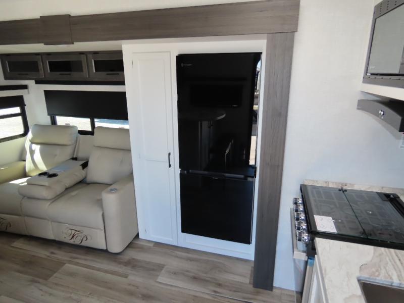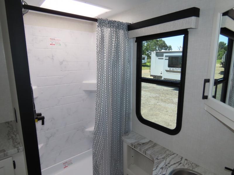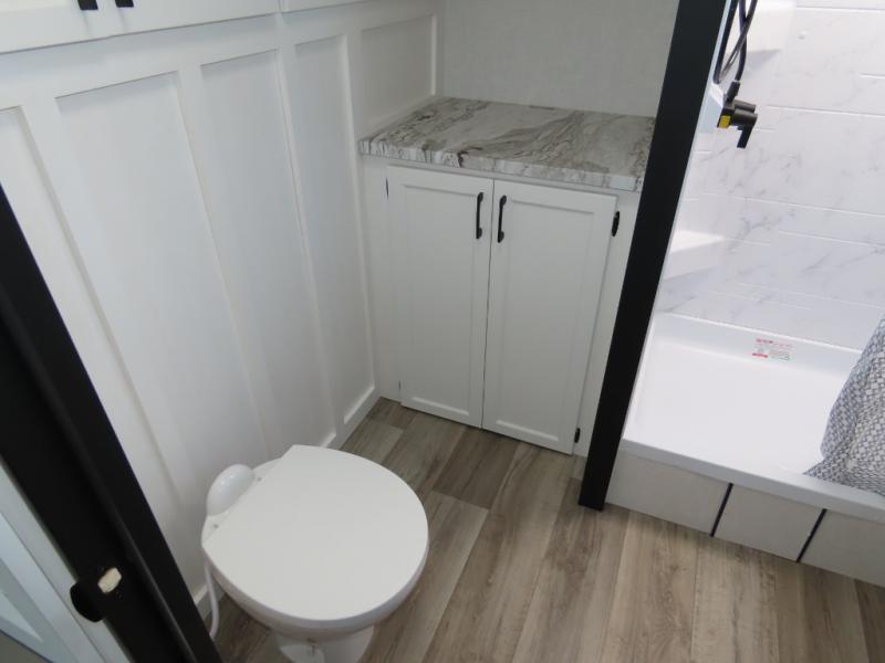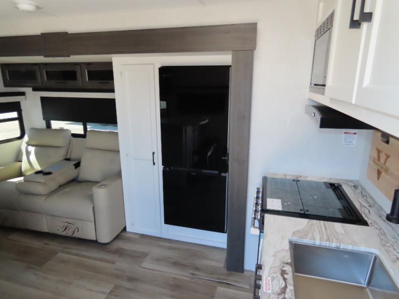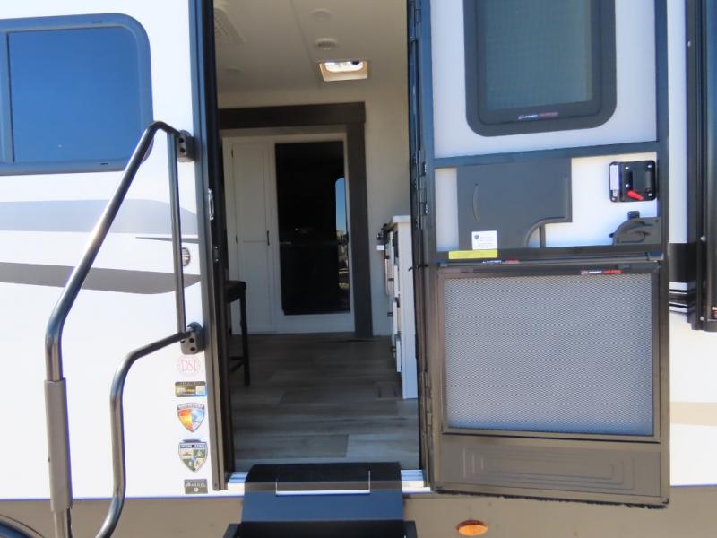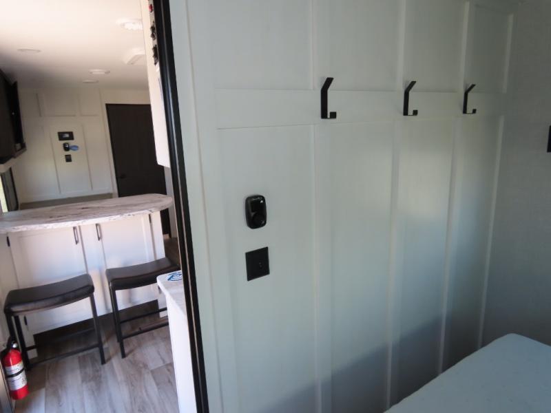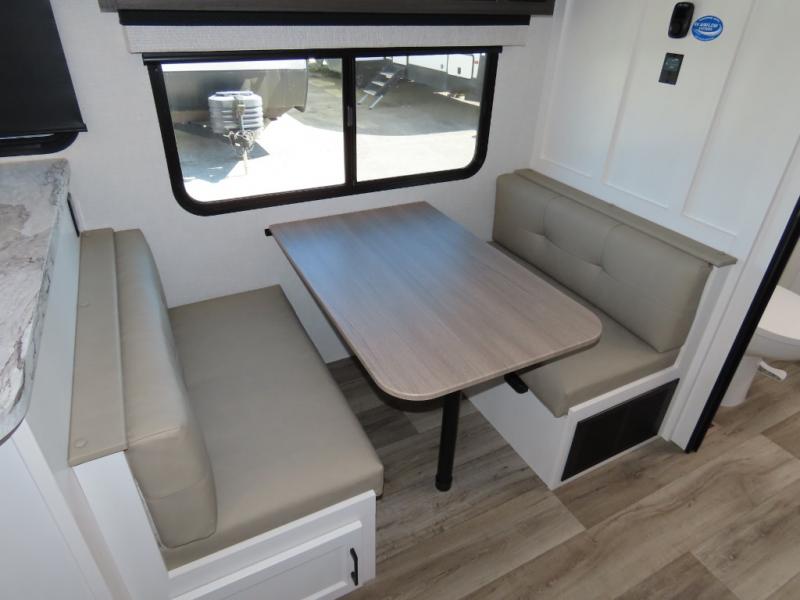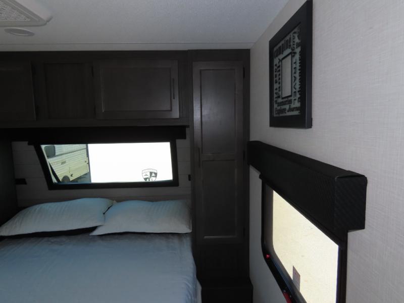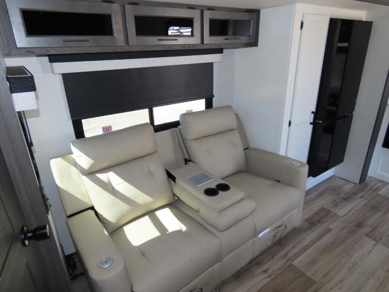 It won't be hard to find comfort in this travel trailer for three to four. Once you arrive at the campground, you can put out the 14' power awning, unload your camp chairs from the pass-thru storage, then start lunch on the exterior kitchen with a griddle. There is also an exterior 40" Smart TV to watch the big game outdoors! If the weather isn't cooperating, you can head inside to relax on the 70" sofa, or play a game at the Sit N' Slide table. You can also choose optional theater seats or a tri-fold sofa in place of the sofa if you prefer this seating arrangements. The kitchen includes appliances to make home-cooked meals, including a 27" oven with a air fryer. The Sleep Tight queen bed in the front private bedroom is sure to bring a great night's rest after you've played all day, and don't overlook the full rear bath, complete with an optional washer and dryer!