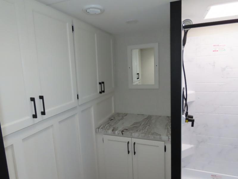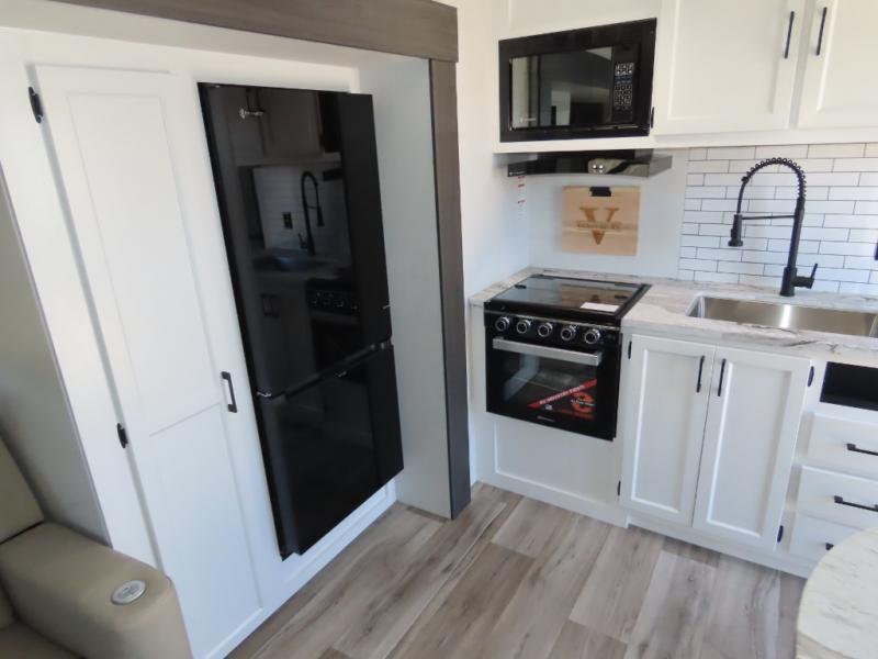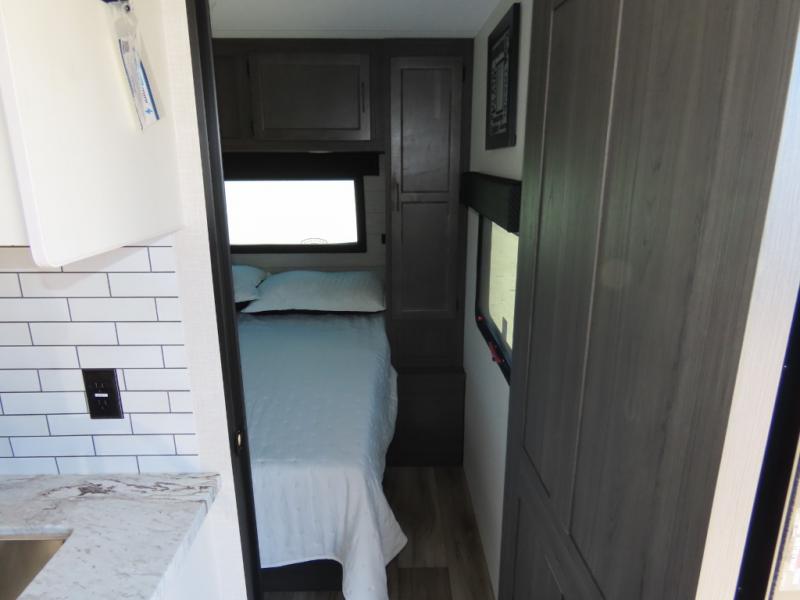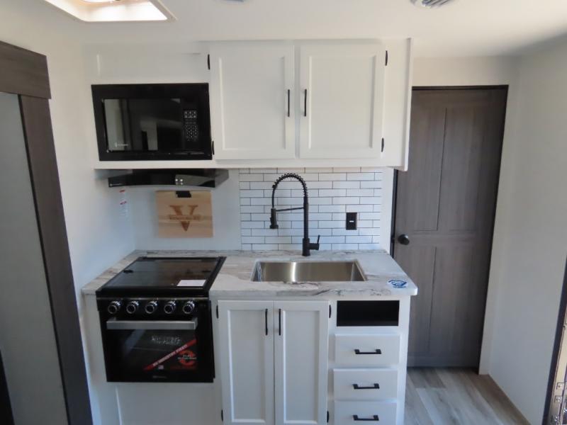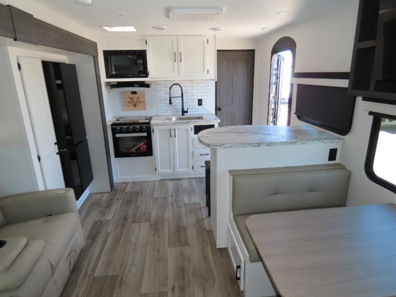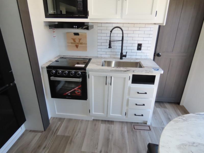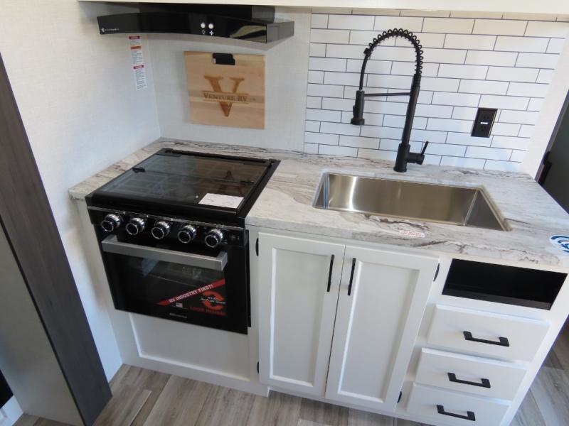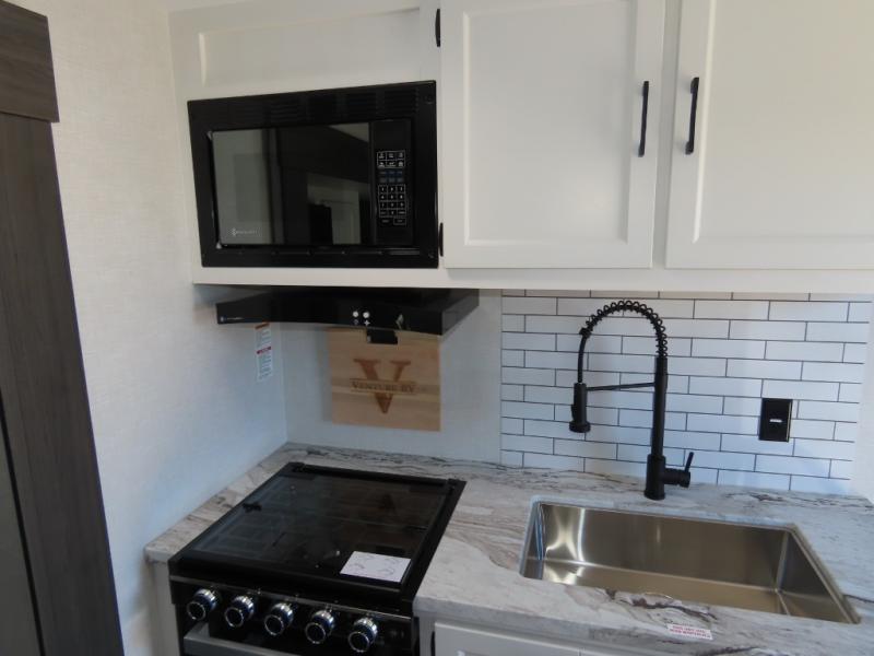 Every Venture RV SportTrek lightweight travel trailer is constructed to offer peace of mind and the comforts of home! Their purposeful residential kitchens are packed with handy features like a Furrion oven and three burner cooktop, a large stainless steel sink with a cover and dish drying rack, plus a 12V refrigerator. You will find plenty of storage throughout, including Safe-Tek hidden storage with a charging center and StorMore nightstands on either side of the bed behind the full-length closets. And the magnetic slam-latch baggage doors and spacious pass-through storage area will hold your outdoor gear in place. They even come with a hot and cold exterior shower and SporTrek's Weather Shield which includes a forced air heated and enclosed underbelly, high output A/C ducting, and more features that will let you extend your camping season. You will also love the new residential upgraded furniture, Serta memory foam mattress, barn style passage doors, and many more comforts!