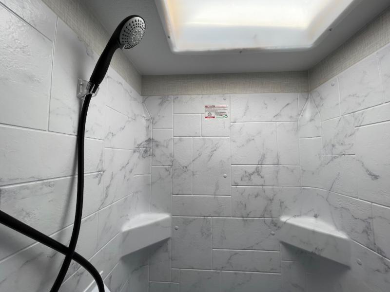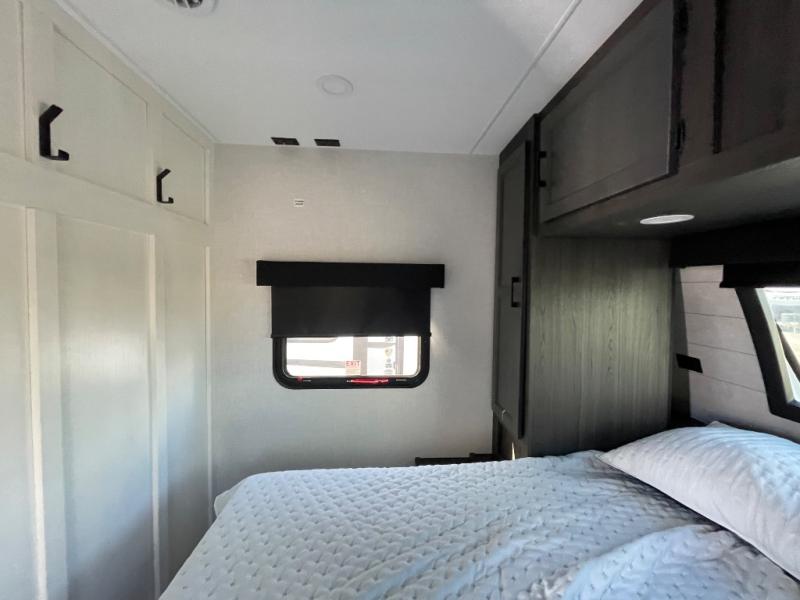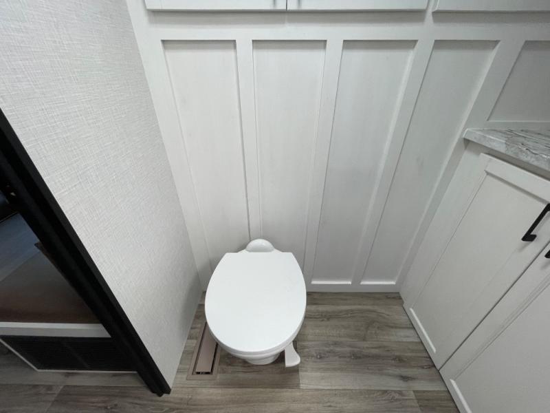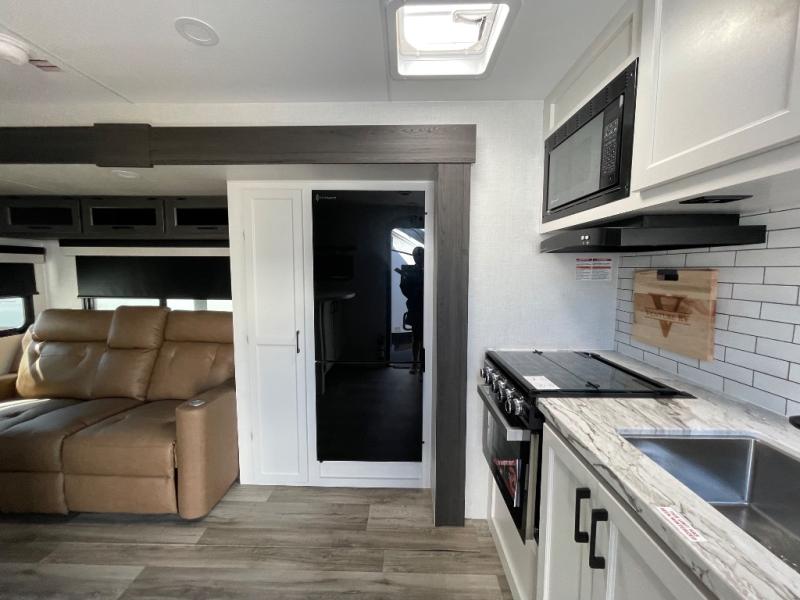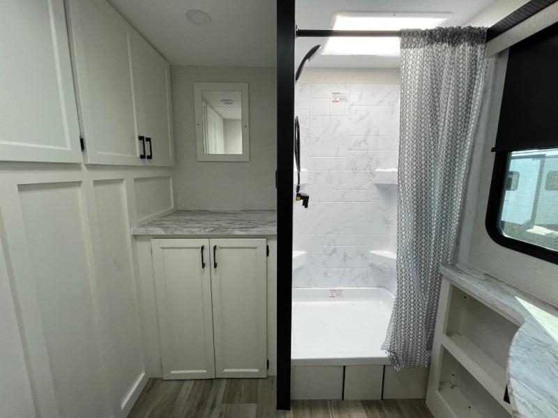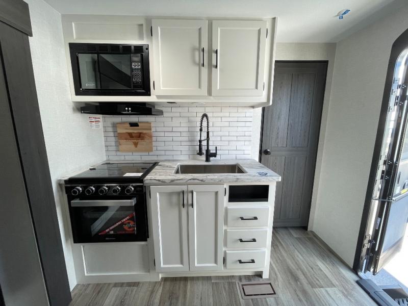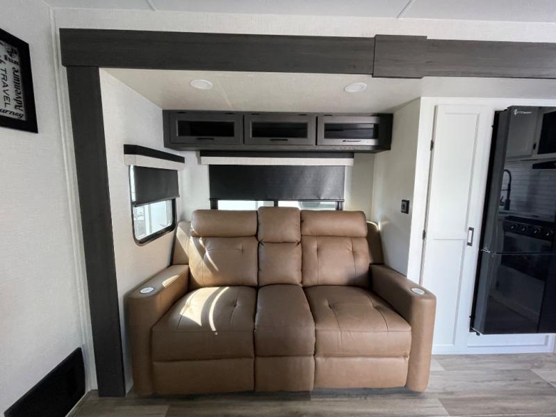 It won't be hard to find comfort in this travel trailer for three to four. Once you arrive at the campground, you can put out the 14' power awning, unload your camp chairs from the pass-thru storage, then start lunch on the exterior kitchen with a griddle. There is also an exterior 40" Smart TV to watch the big game outdoors! If the weather isn't cooperating, you can head inside to relax on the 70" sofa, or play a game at the Sit N' Slide table. You can also choose optional theater seats or a tri-fold sofa in place of the sofa if you prefer this seating arrangements. The kitchen includes appliances to make home-cooked meals, including a 27" oven with a air fryer. The Sleep Tight queen bed in the front private bedroom is sure to bring a great night's rest after you've played all day, and don't overlook the full rear bath, complete with an optional washer and dryer!