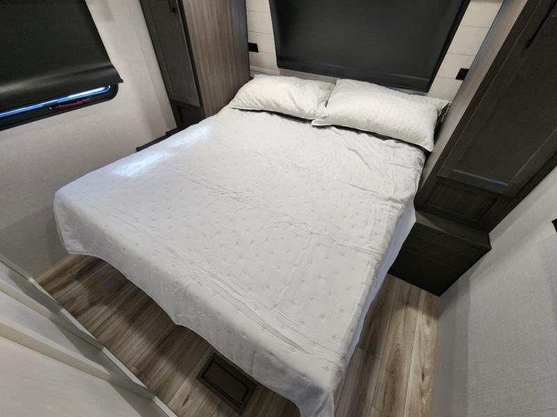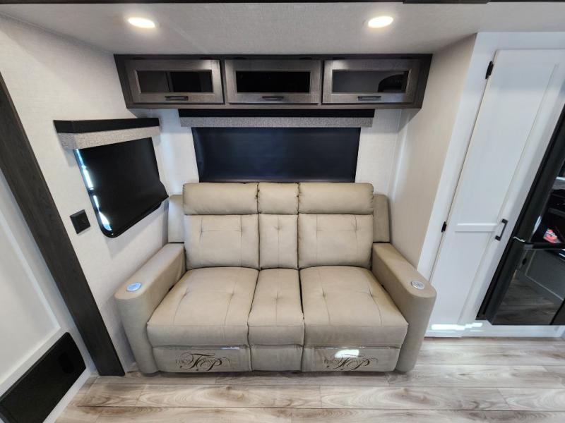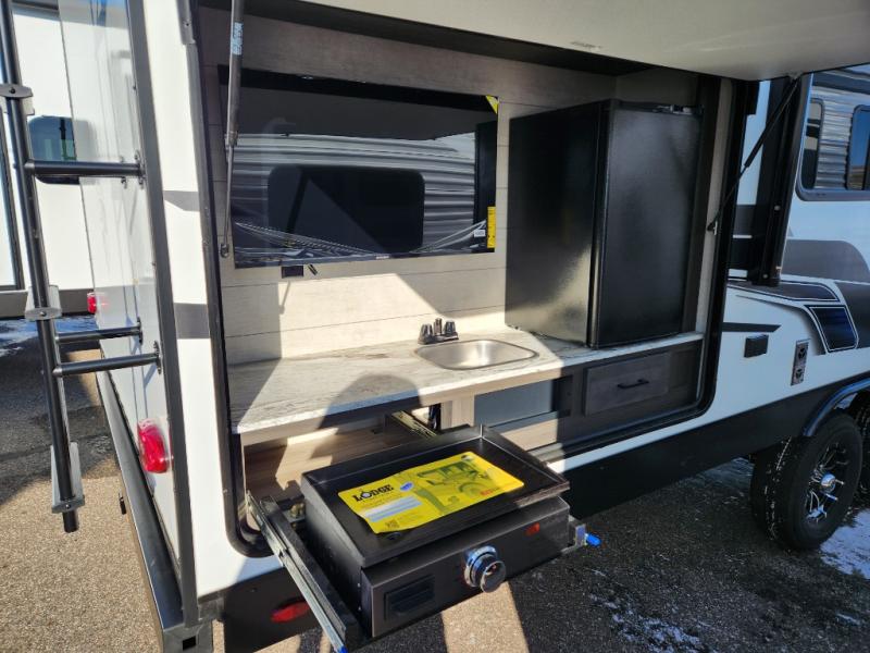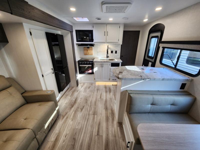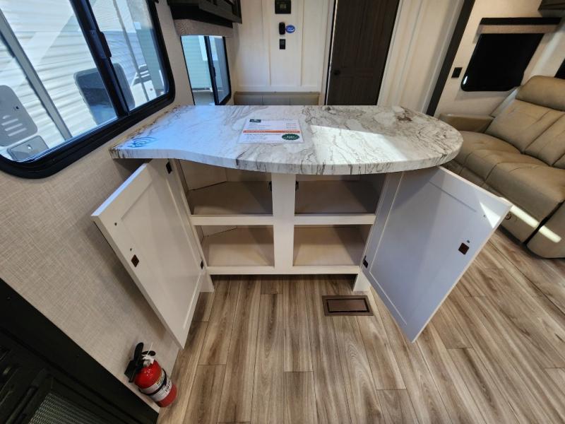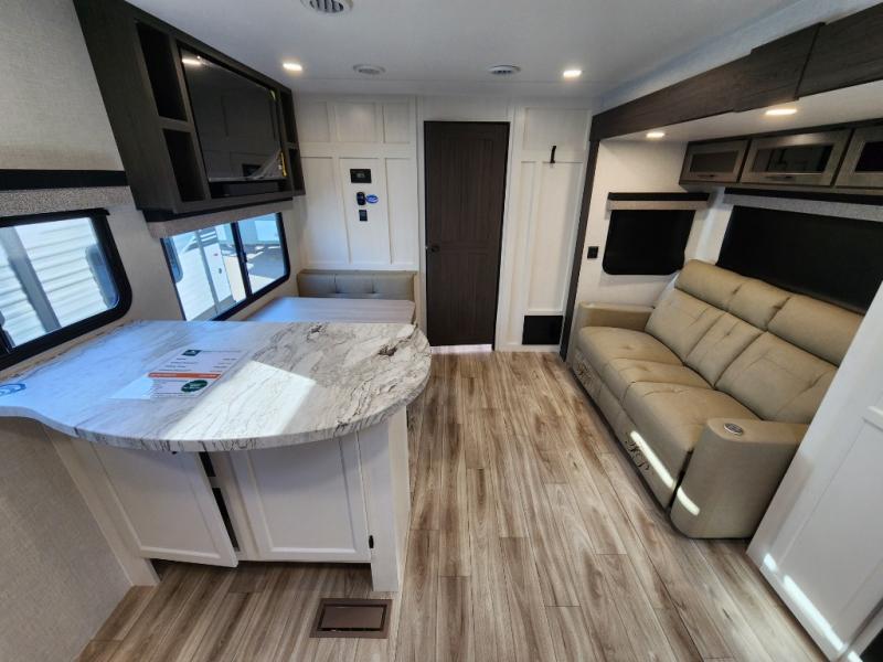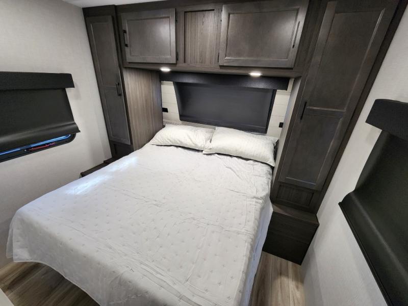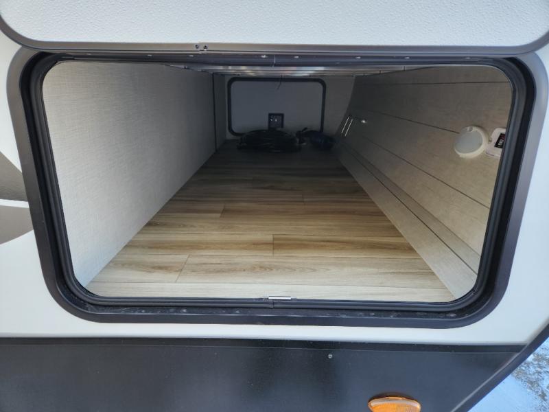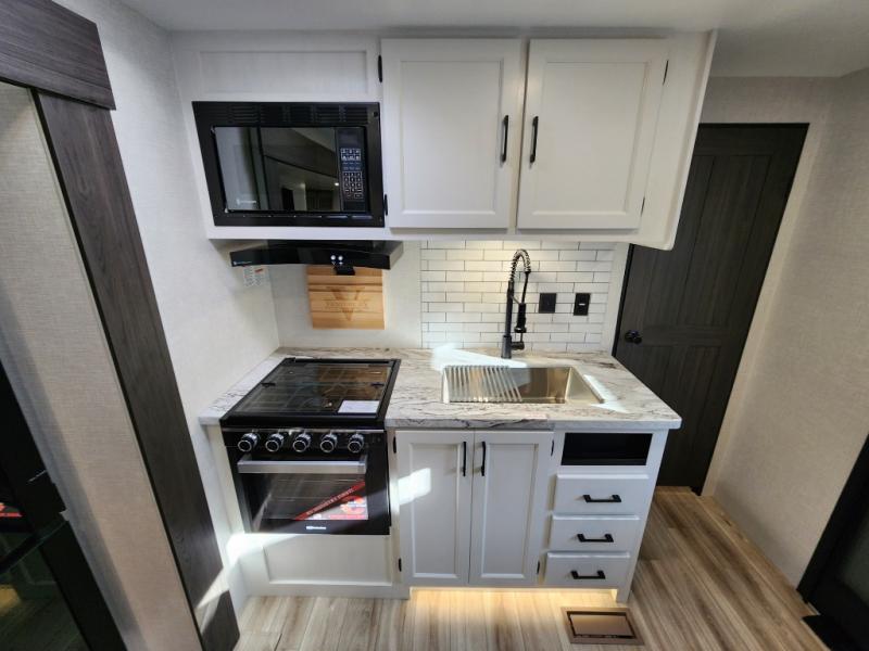 It won't be hard to find comfort in this travel trailer for three to four. Once you arrive at the campground, you can put out the 14' power awning, unload your camp chairs from the pass-thru storage, then start lunch on the exterior kitchen with a griddle. There is also an exterior 40" Smart TV to watch the big game outdoors! If the weather isn't cooperating, you can head inside to relax on the 70" sofa, or play a game at the Sit N' Slide table. You can also choose optional theater seats or a tri-fold sofa in place of the sofa if you prefer this seating arrangements. The kitchen includes appliances to make home-cooked meals, including a 21" oven with a air fryer. The Sleep Tight queen bed in the front private bedroom is sure to bring a great night's rest after you've played all day, and don't overlook the full rear bath, complete with an optional washer and dryer!