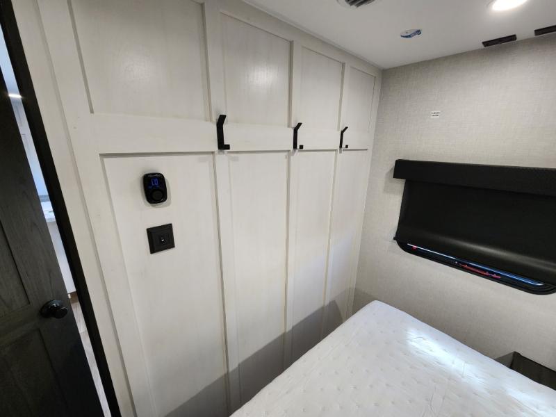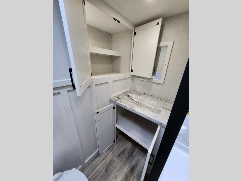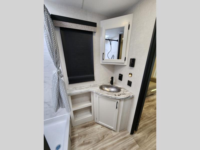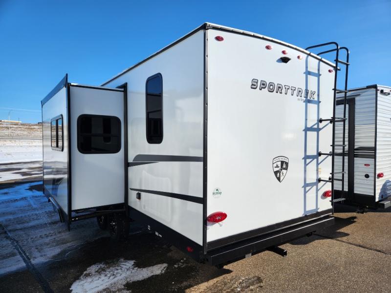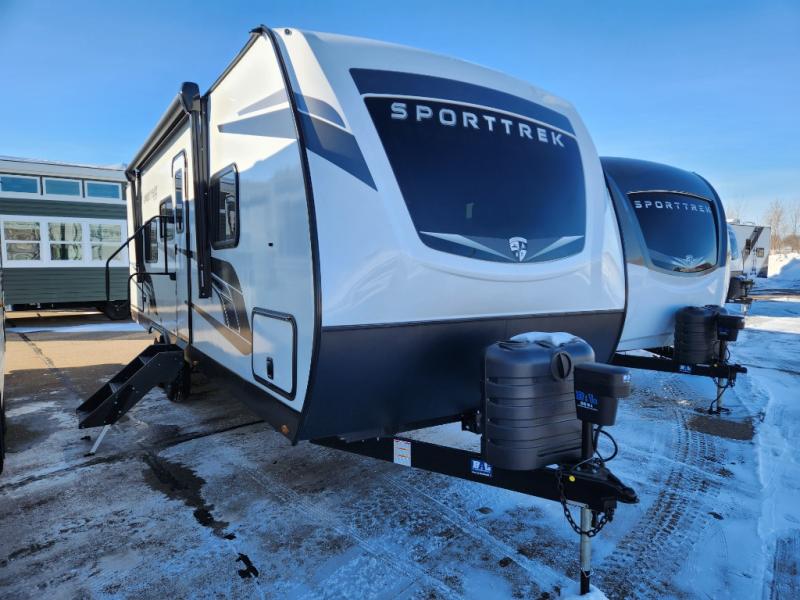 Every Venture RV SportTrek lightweight travel trailer is constructed to offer peace of mind and the comforts of home! Their purposeful residential kitchens are packed with handy features like a Furrion oven and three burner cooktop, a large stainless steel sink with a cover and dish drying rack, plus a 12V refrigerator. You will find plenty of storage throughout, including Safe-Tek hidden storage with a charging center and StorMore nightstands on either side of the bed behind the full-length closets. And the magnetic slam-latch baggage doors and spacious pass-through storage area will hold your outdoor gear in place. They even come with a hot and cold exterior shower and SporTrek's Weather Shield which includes a forced air heated and enclosed underbelly, radiant foil insulation wrapped tanks, and more features that will let you extend your camping season. You will also love the new residential upgraded furniture, Serta memory foam mattress, barn style passage doors, and many more comforts!