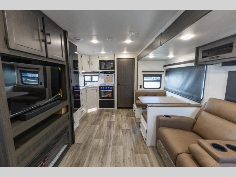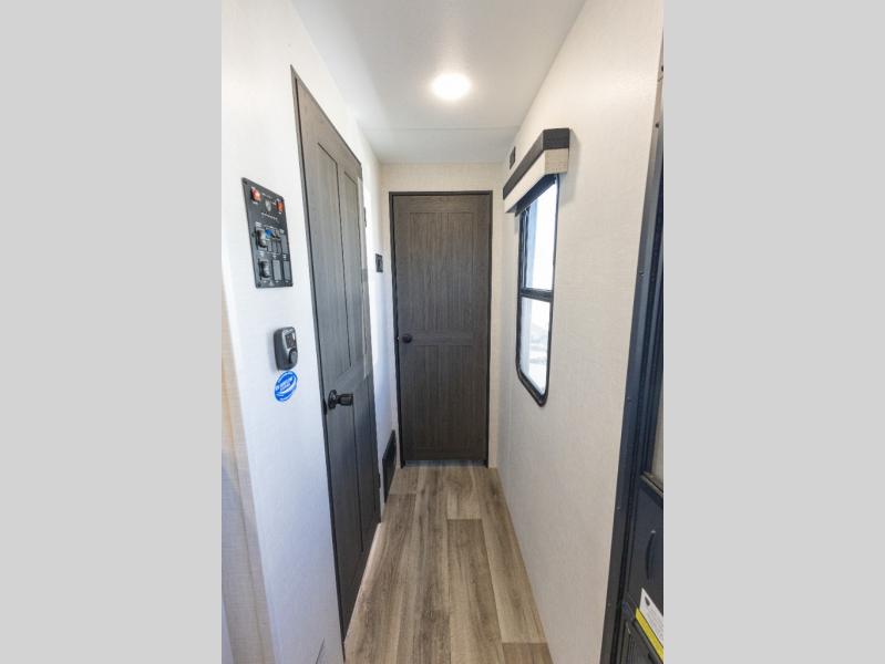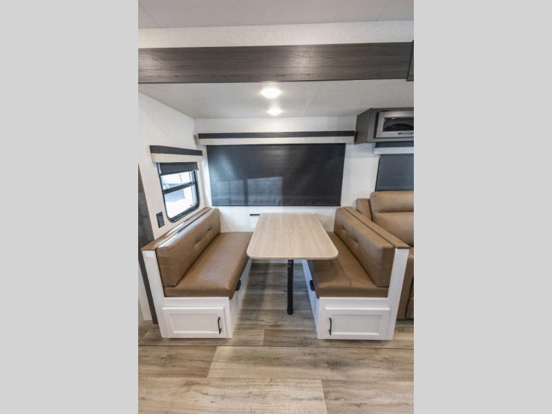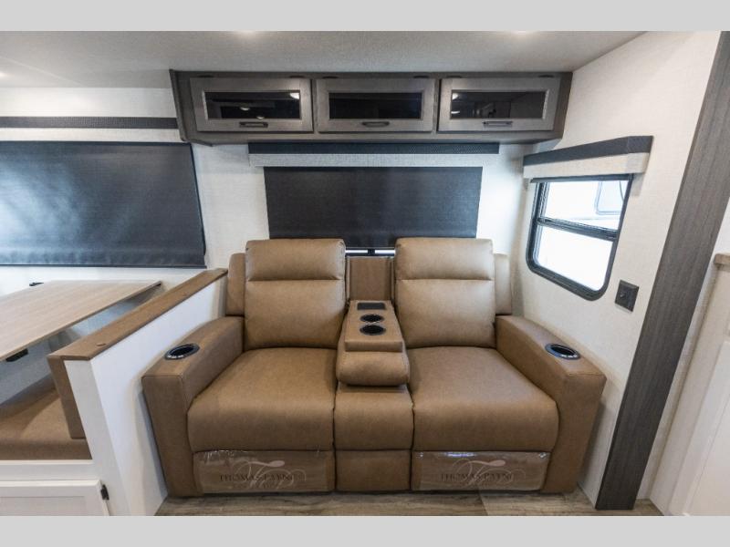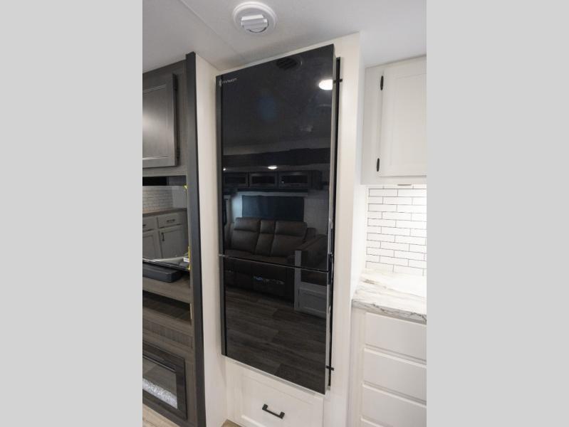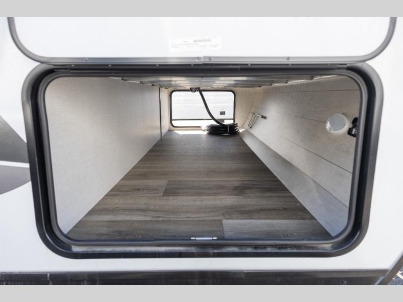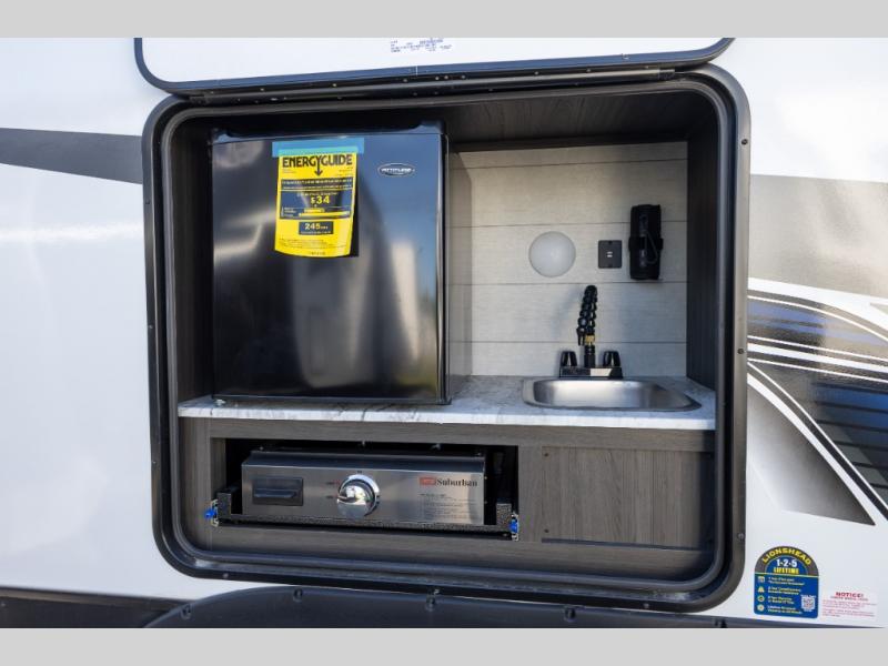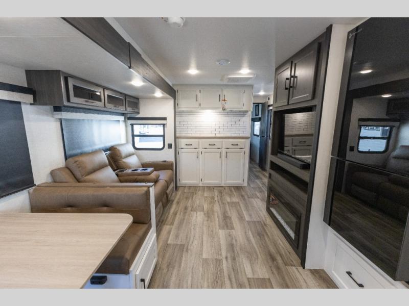 A rear kitchen makes it easy to prepare meals in this travel trailer! The kitchen has a three burner cooktop with a Furrion oven, a 10 cu. ft. 12V refrigerator to keep your perishables fresh, overhead cabinets keep cooking essentials nearby, and a walk-in pantry big enough for all of your snacks and canned goods, plus a hutch for your dishes. You could even prepare meals outside with the campfire café which has a sink, a refrigerator, and a griddle. The bench seat gives you a spot to sit while you put on your shoes and the coat hooks above makes it easy to grab and go. Enjoy your meals and card games at the Sit N' Slide table and relax on the 70" sofa across from the entertainment center with a 40" TV and a frameless electric fireplace. The front private bedroom has a Sleep Tight queen bed to lay your head on at night and a closet with drawers to keep your clothes looking their best!