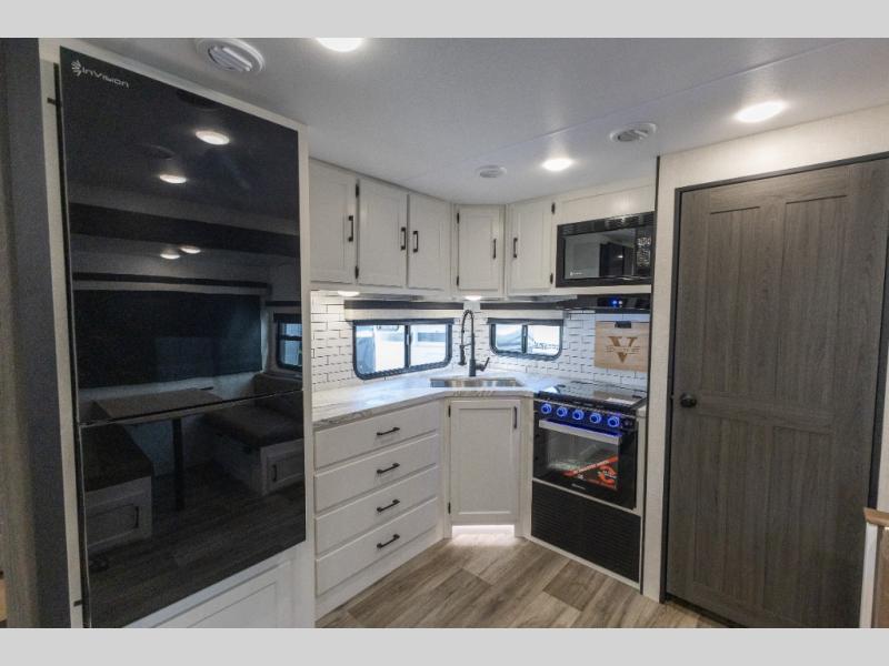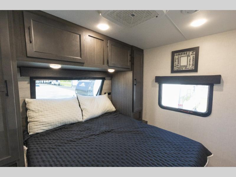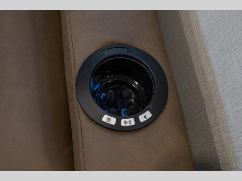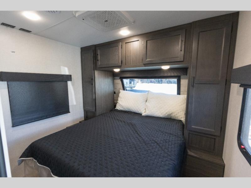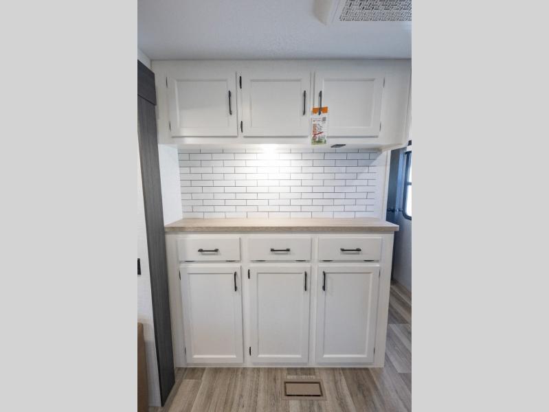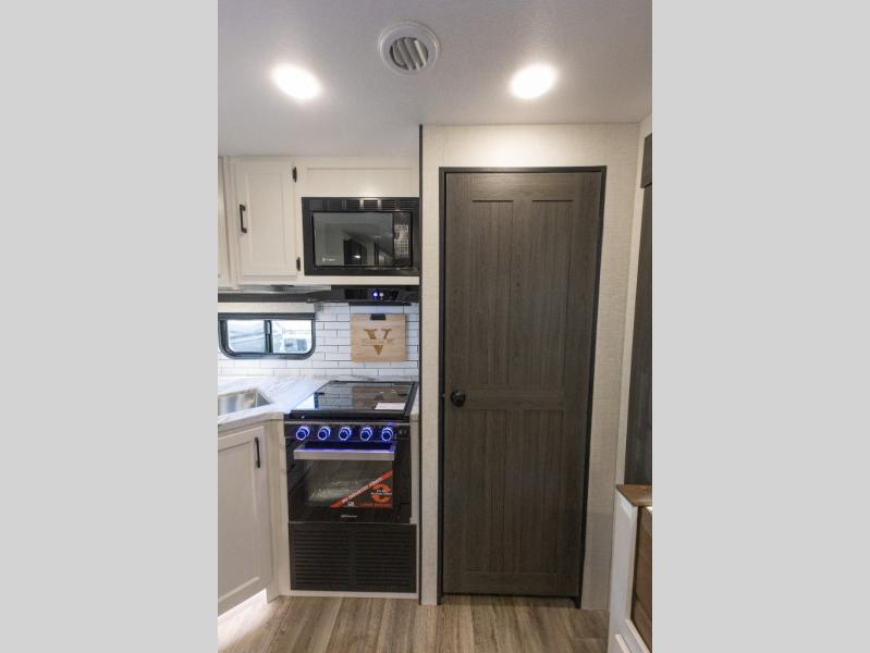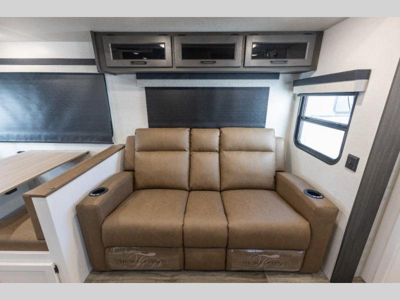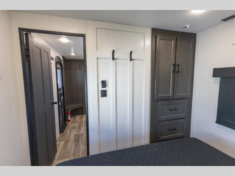 A rear kitchen makes it easy to prepare meals in this travel trailer! The kitchen has a three burner cooktop with a Furrion oven, a 10 cu. ft. 12V refrigerator to keep your perishables fresh, overhead cabinets keep cooking essentials nearby, and a walk-in pantry big enough for all of your snacks and canned goods, plus a hutch for your dishes. You could even prepare meals outside with the campfire café which has a sink, a refrigerator, and a griddle. The bench seat gives you a spot to sit while you put on your shoes and the coat hooks above makes it easy to grab and go. Enjoy your meals and card games at the Sit N' Slide table and relax on the 70" sofa across from the entertainment center with a 40" TV and a frameless electric fireplace. The front private bedroom has a Sleep Tight queen bed to lay your head on at night and a closet with drawers to keep your clothes looking their best!