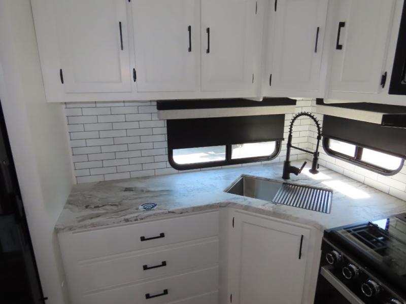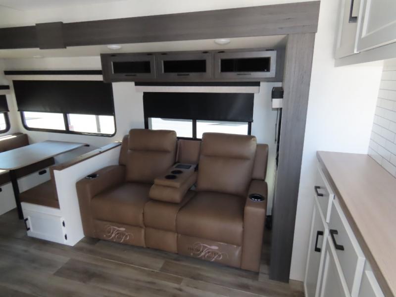A rear kitchen makes it easy to prepare meals in this travel trailer! The kitchen has a three burner cooktop with a Furrion oven, a 10 cu. ft. 12V refrigerator to keep your perishables fresh, overhead cabinets keep cooking essentials nearby, and a walk-in pantry big enough for all of your snacks and canned goods, plus a hutch for your dishes. You could even prepare meals outside with the campfire café which has a sink, a refrigerator, and a griddle. The bench seat gives you a spot to sit while you put on your shoes and the coat hooks above makes it easy to grab and go. Enjoy your meals and card games at the Sit N' Slide table and relax on the 70" sofa across from the entertainment center with a 40" TV and a frameless electric fireplace. The front private bedroom has a Sleep Tight queen bed to lay your head on at night and a closet with drawers to keep your clothes looking their best!