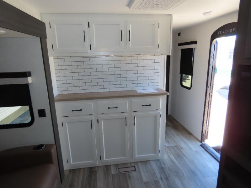Every Venture RV SportTrek lightweight travel trailer is constructed to offer peace of mind and the comforts of home! Their purposeful residential kitchens are packed with handy features like a Furrion oven and three burner cooktop, a large stainless steel sink with a cover and dish drying rack, plus a 12V refrigerator. You will find plenty of storage throughout, including Safe-Tek hidden storage with a charging center and StorMore nightstands on either side of the bed behind the full-length closets. And the magnetic slam-latch baggage doors and spacious pass-through storage area will hold your outdoor gear in place. They even come with a hot and cold exterior shower and SporTrek's Weather Shield which includes a forced air heated and enclosed underbelly, high output A/C ducting, and more features that will let you extend your camping season. You will also love the new residential upgraded furniture, Serta memory foam mattress, barn style passage doors, and many more comforts!
