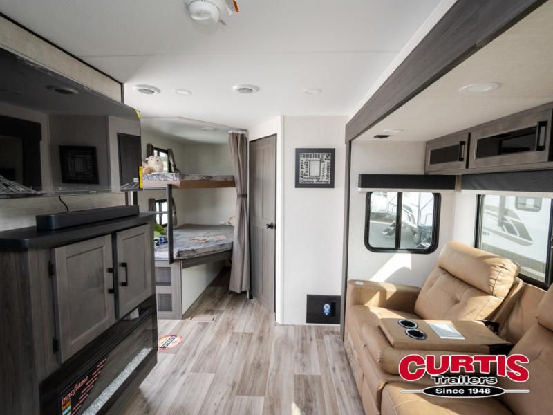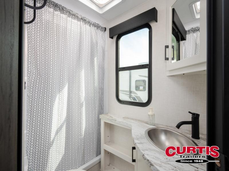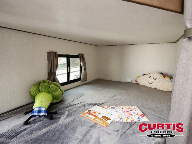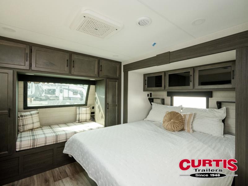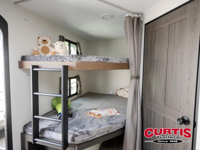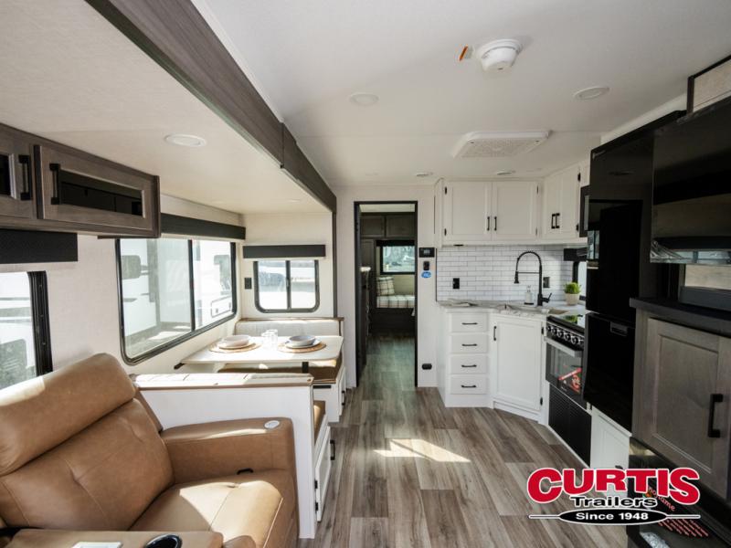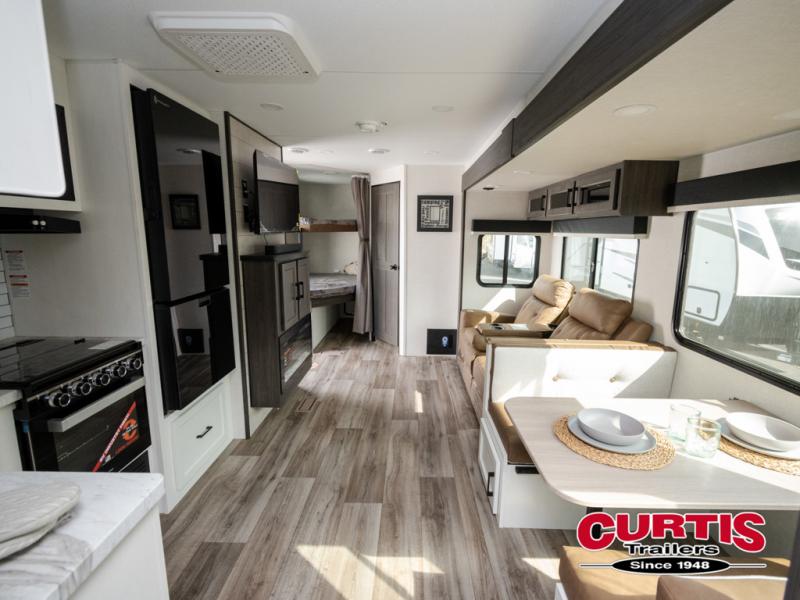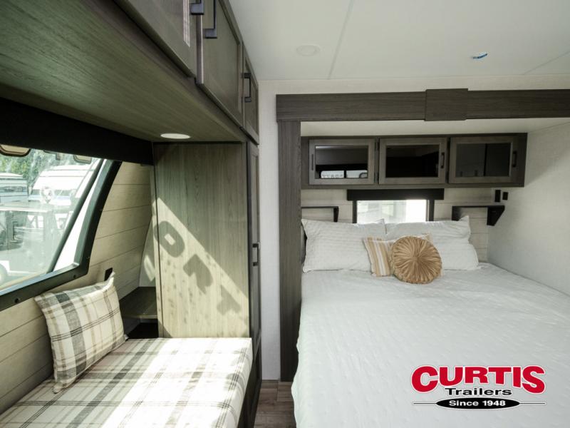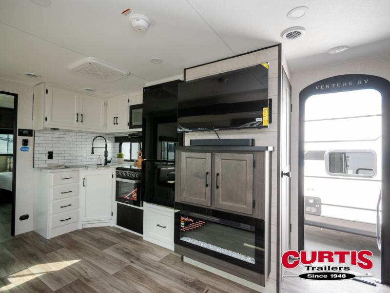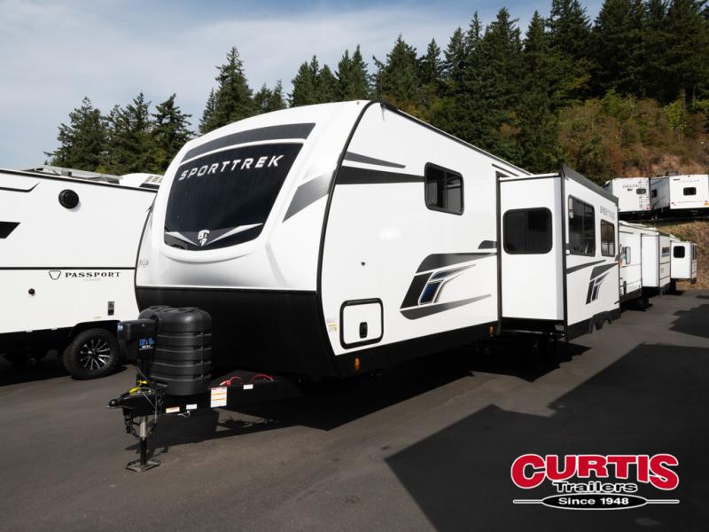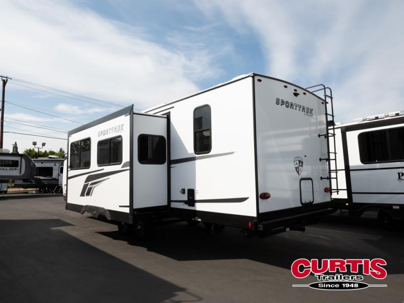 Every Venture RV SportTrek lightweight travel trailer is constructed to offer peace of mind and the comforts of home! Their purposeful residential kitchens are packed with handy features like a Furrion oven and three burner cooktop, a large stainless steel sink with a cover and dish drying rack, plus a 12V refrigerator. You will find plenty of storage throughout, including Safe-Tek hidden storage with a charging center and StorMore nightstands on either side of the bed behind the full-length closets. And the magnetic slam-latch baggage doors and spacious pass-through storage area will hold your outdoor gear in place. They even come with a hot and cold exterior shower and SporTrek's Weather Shield which includes a forced air heated and enclosed underbelly, high output A/C ducting, and more features that will let you extend your camping season. You will also love the new residential upgraded furniture, Serta memory foam mattress, barn style passage doors, and many more comforts!