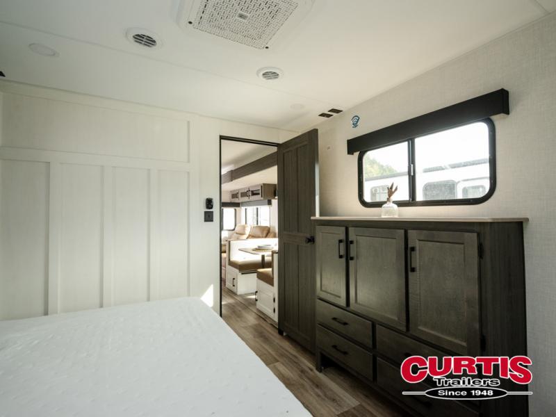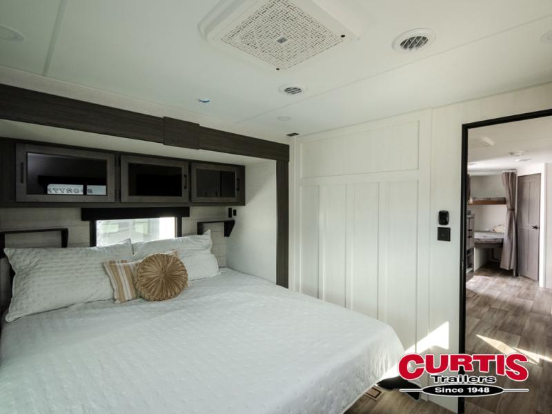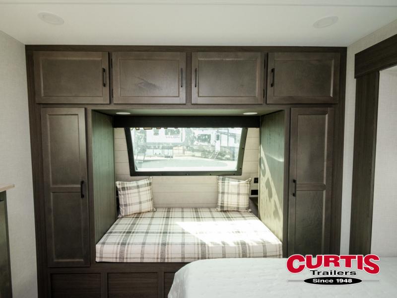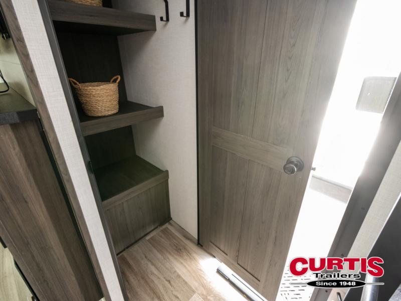 A front private bedroom with a king bed slide out is sure to make you feel at home, while your guests take the double-size bunks in the back. There is a full bath right next to the bunks for easy nighttime use, and any other guests can sleep on the 70" sofa within the large slide out. There is plenty of storage space, including a walk-in pantry with coat hooks, a bedroom dresser and closets to keep clothes organized, and an exterior pass-thru storage for camp gear! A full kitchen inside will let you cook in comfort when the weather isn't cooperating, and an exterior campfire cafe includes an outdoor refrigerator, sink, and griddle for a sunrise breakfast!