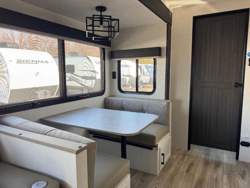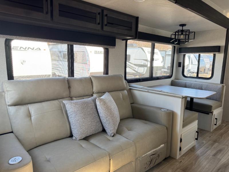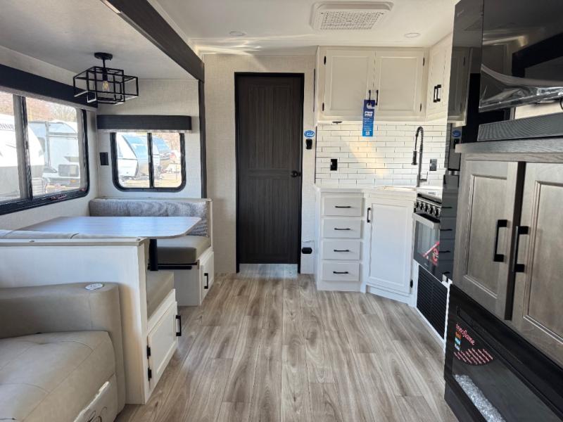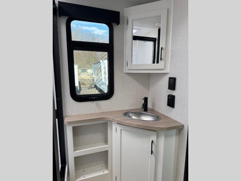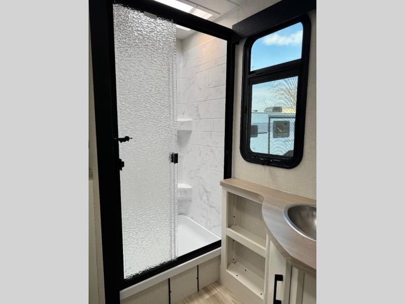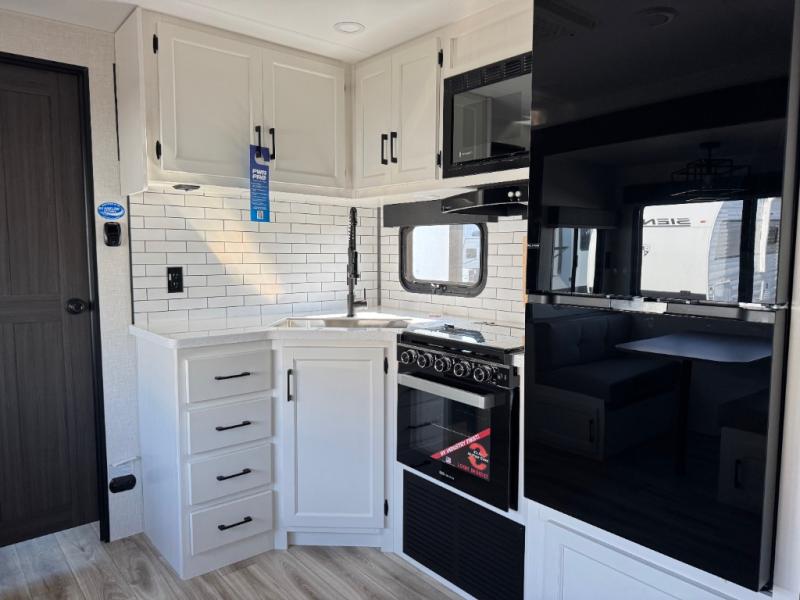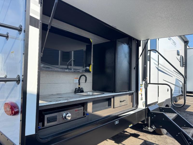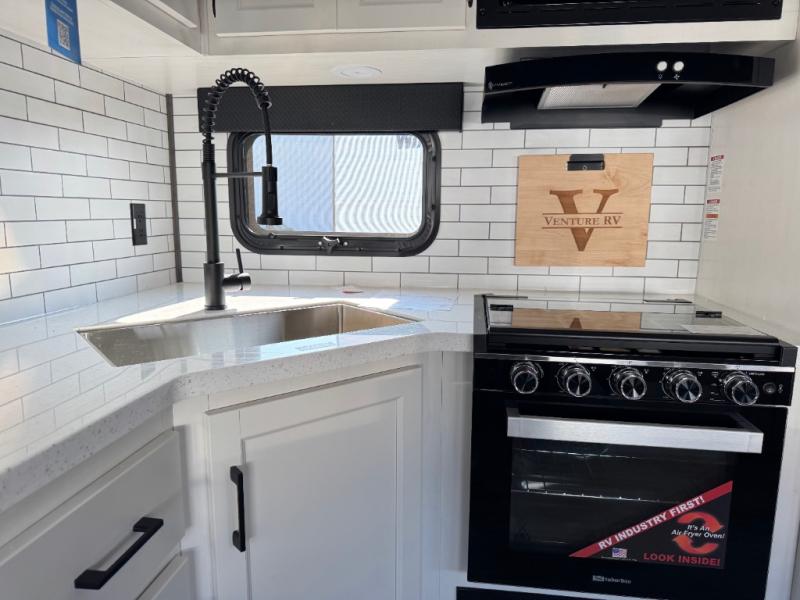 Every Venture RV SportTrek lightweight travel trailer is constructed to offer peace of mind and the comforts of home! Their purposeful residential kitchens are packed with handy features like a Furrion oven and three burner cooktop, a large stainless steel sink with a cover and dish drying rack, plus a 12V refrigerator. You will find plenty of storage throughout, including Safe-Tek hidden storage with a charging center and StorMore nightstands on either side of the bed behind the full-length closets. And the magnetic slam-latch baggage doors and spacious pass-through storage area will hold your outdoor gear in place. They even come with a hot and cold exterior shower and SporTrek's Weather Shield which includes a forced air heated and enclosed underbelly, radiant foil insulation wrapped tanks, and more features that will let you extend your camping season. You will also love the new residential upgraded furniture, Serta memory foam mattress, barn style passage doors, and many more comforts!