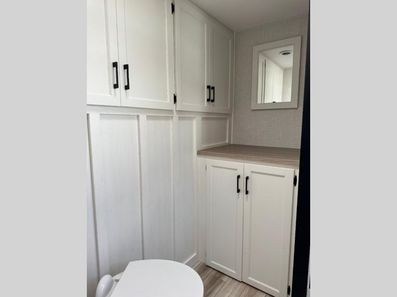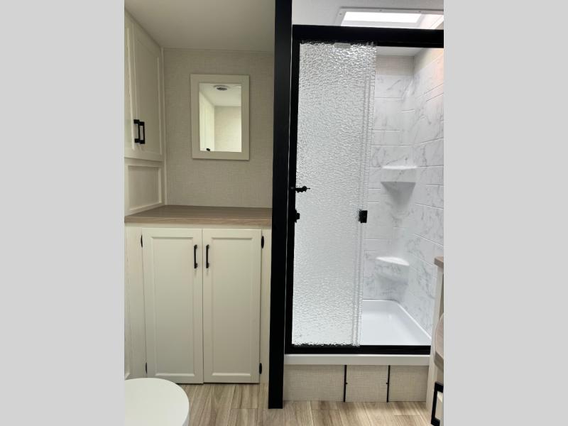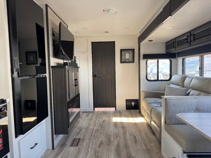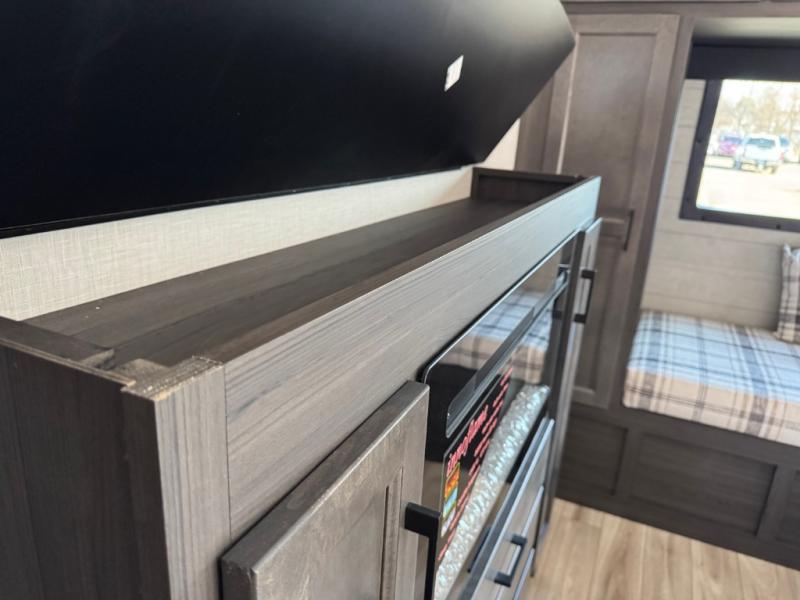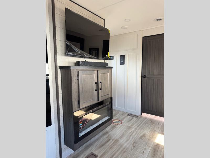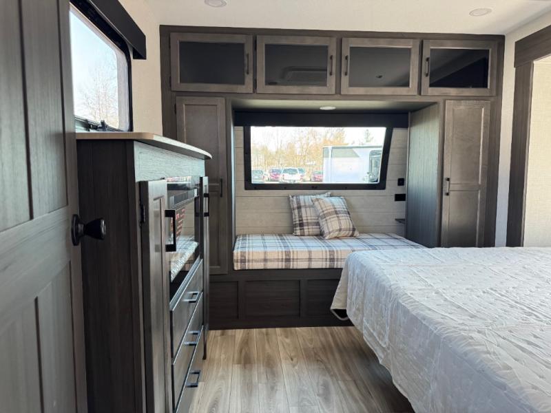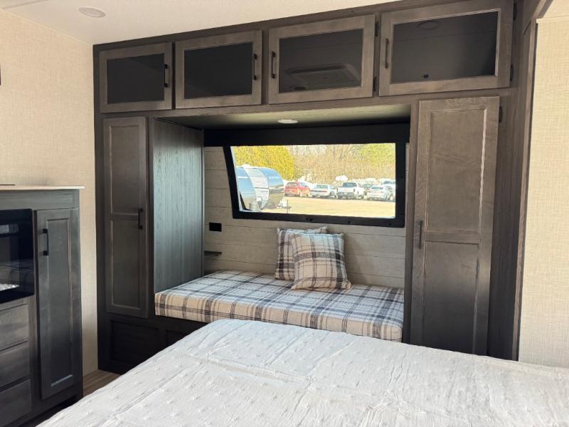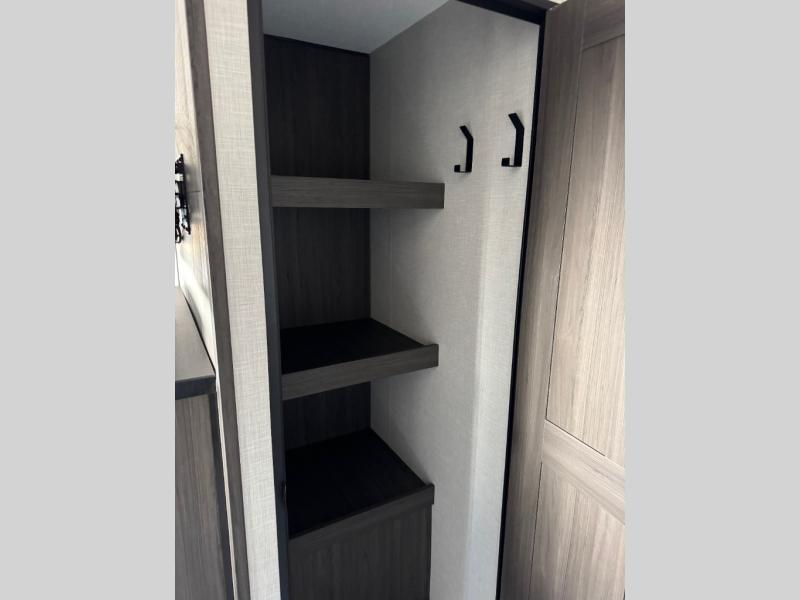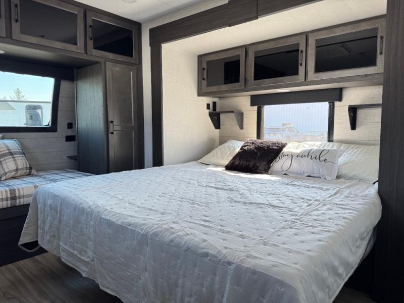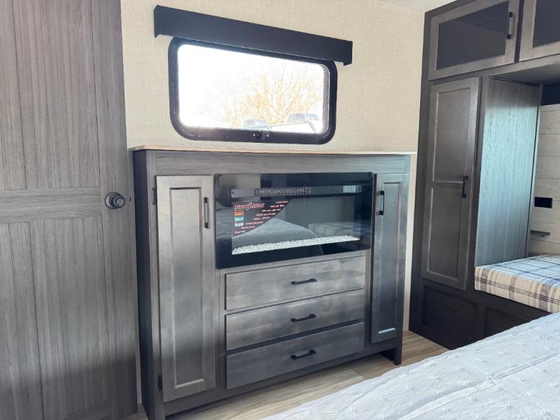 A front private bedroom with a king bed slide out is sure to make you feel at home, while your guests take the double-size bunks in the back. There is a full bath right next to the bunks for easy nighttime use, and another guest can sleep on the 70" sofa within the large slide out. There is plenty of storage space, including a walk-in pantry with coat hooks, a bedroom dresser and closets to keep clothes organized, and an exterior pass-thru storage for camp gear! A full kitchen inside will let you cook in comfort when the weather isn't cooperating, and an exterior campfire cafe includes an outdoor refrigerator, sink, and griddle for a sunrise breakfast!