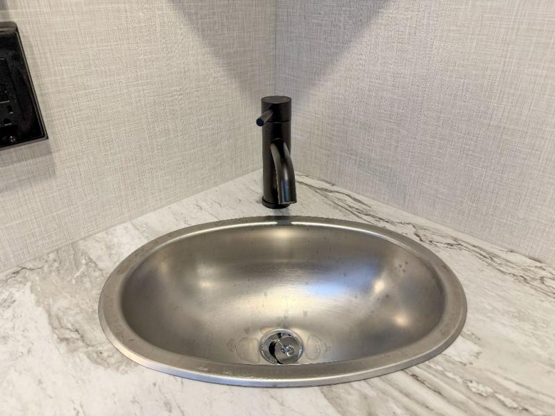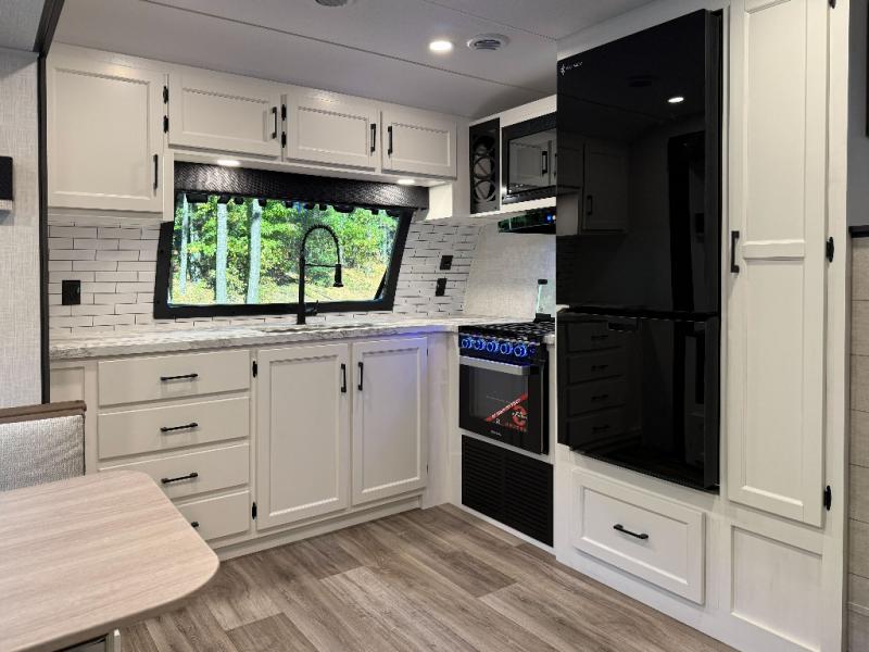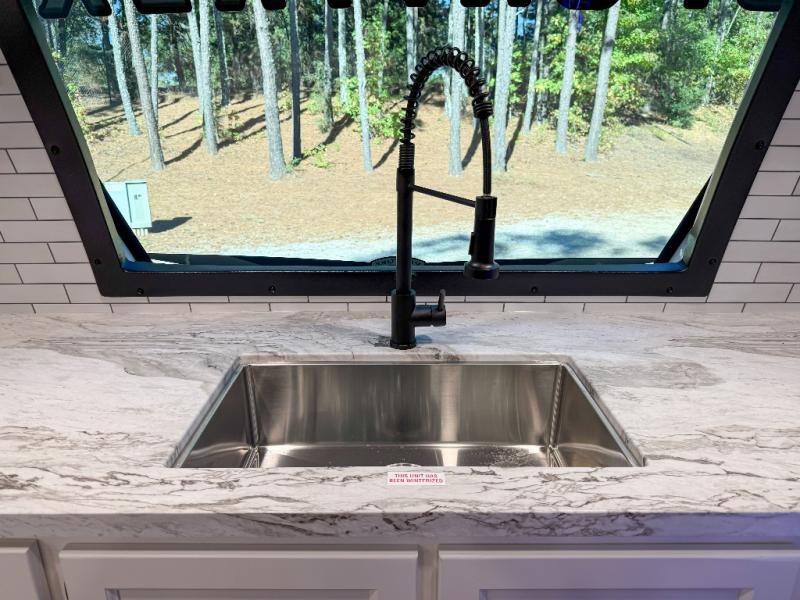 Front Residential Kitchen: Featuring a Furrion oven, 3-burner cooktop, large stainless steel undermount sink with cover and drying rack, seamless Surf(x) countertops, and abundant storage with full-extension drawers and charging center