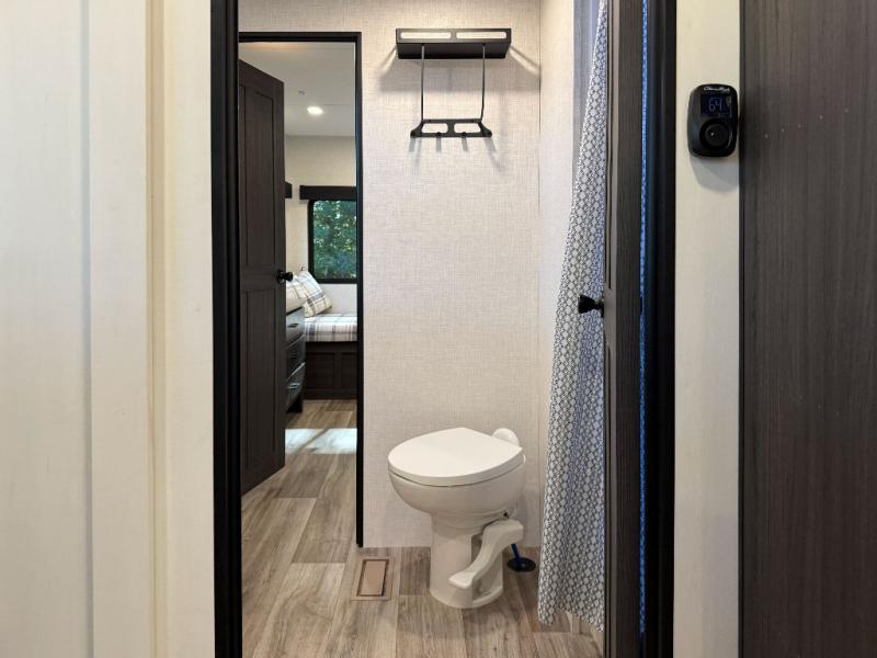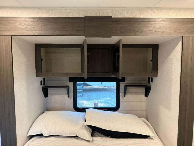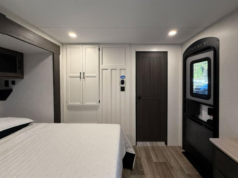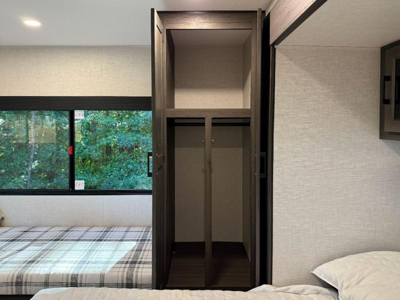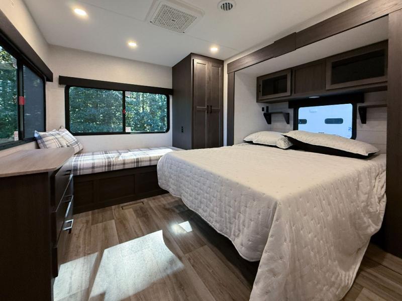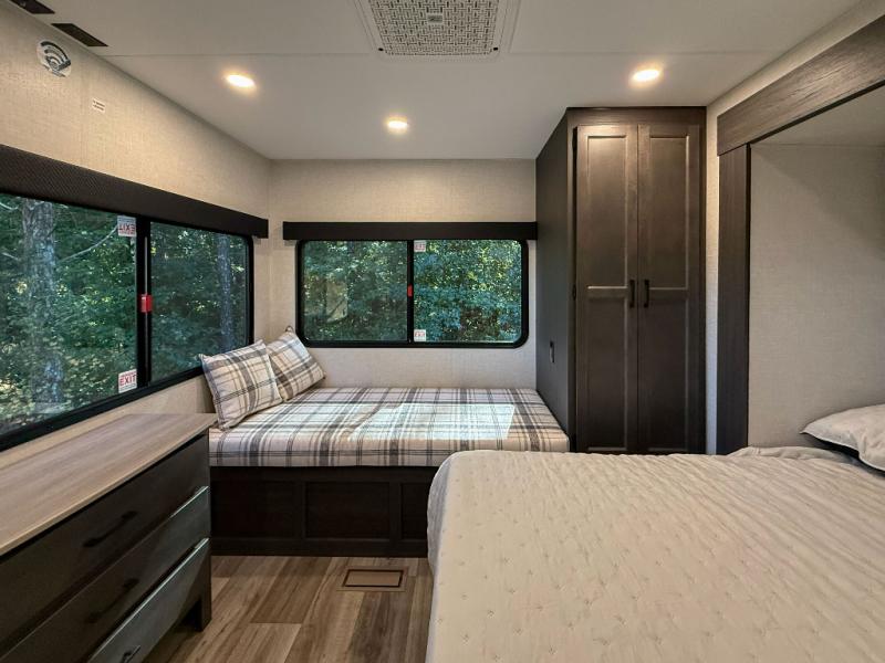 Private Rear Bedroom: A queen bed slide, Sleep-Tight mattress, dresser, dual wardrobes, and a bench provide a restful retreat with practical storage and dual entry for added convenience