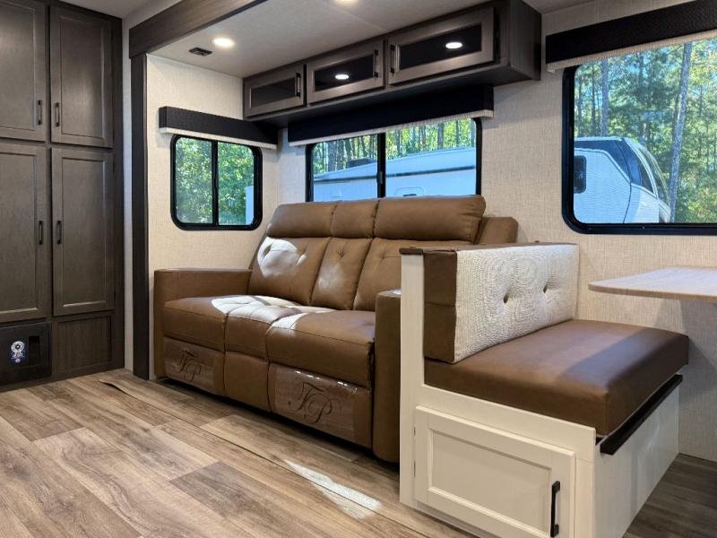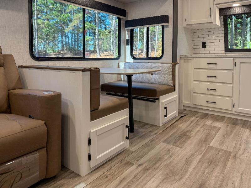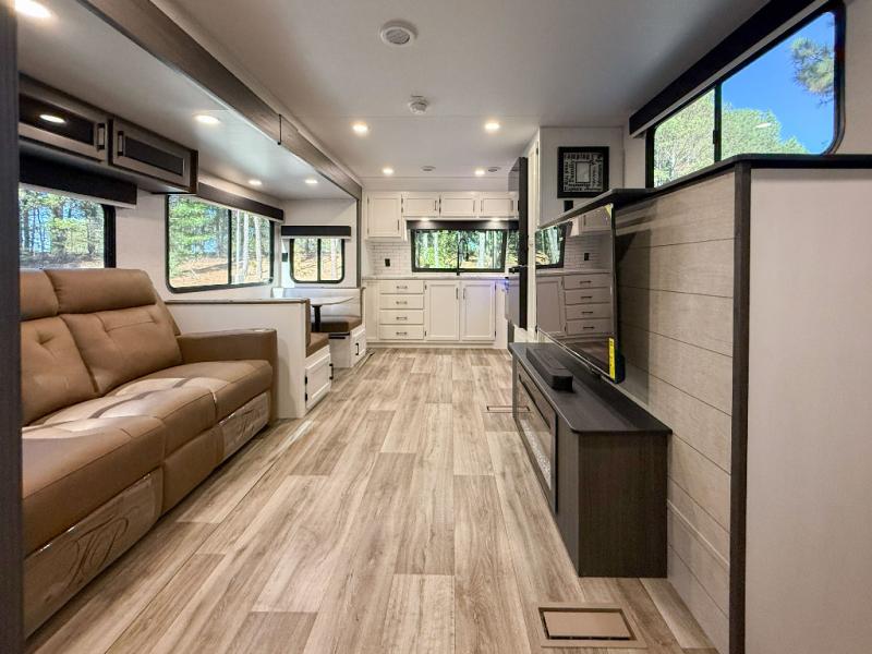 Inviting Living Space: Relax on the slide-out 70? sofa or Sit-N-Slide dinette with flipside cushions. Enjoy entertainment from the 40? TV on a swing arm paired with a frameless electric fireplace