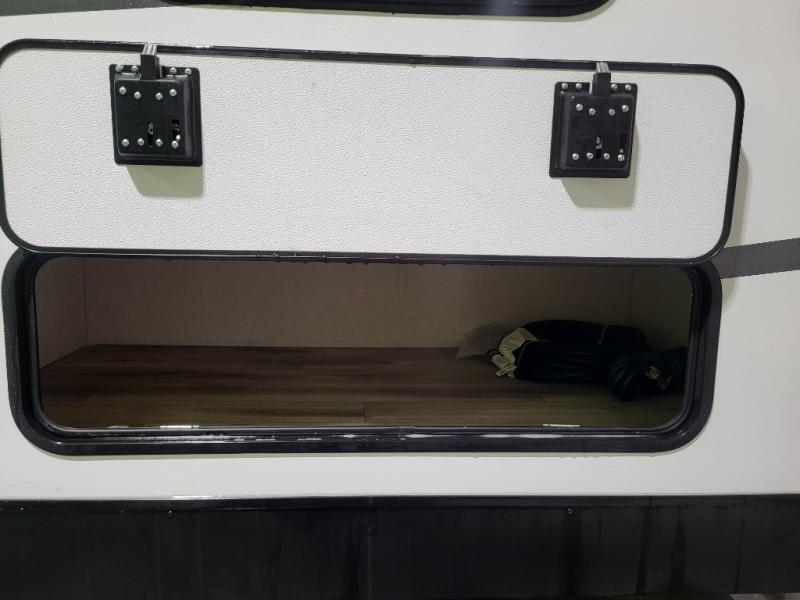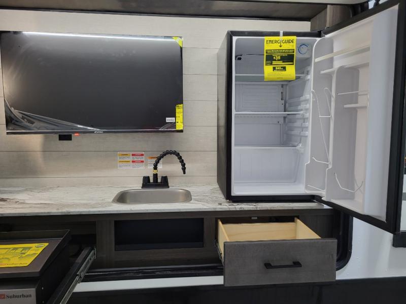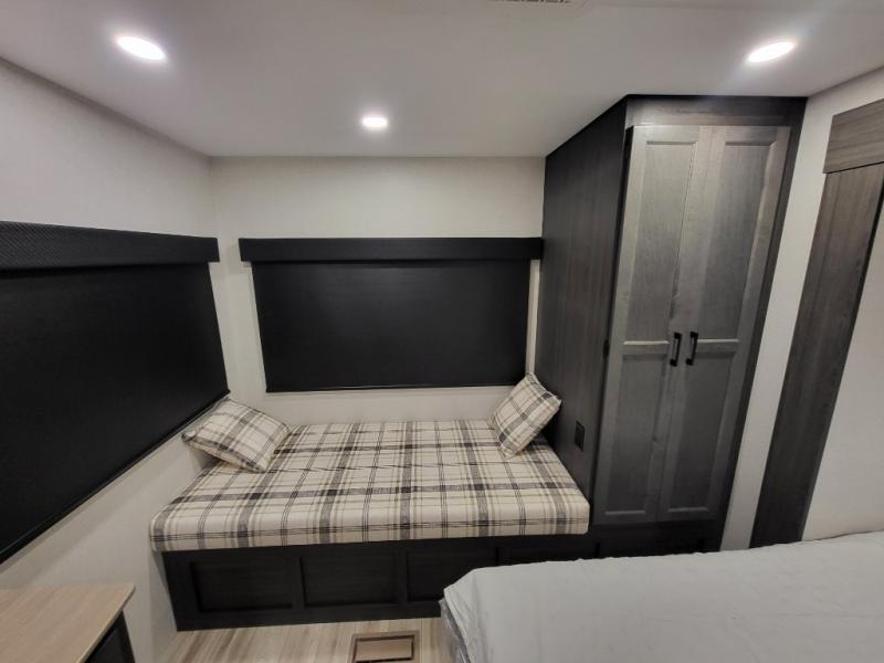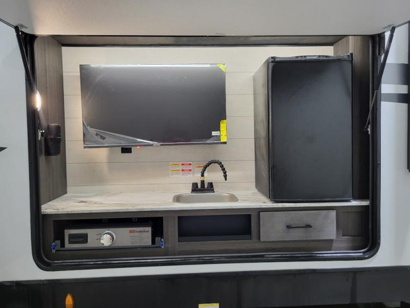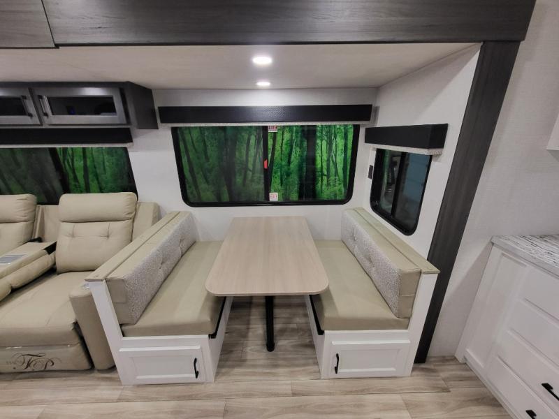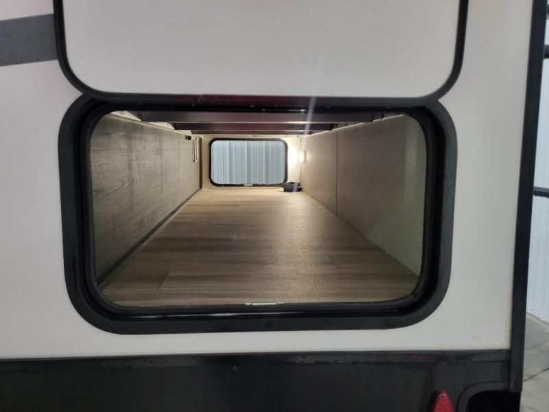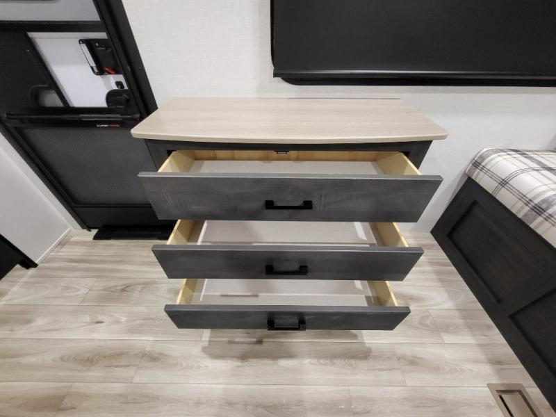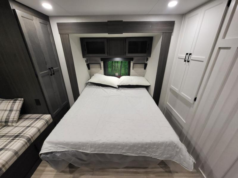 A front kitchen in this travel trailer provides more interior space! Once you have prepared your best meals with the Furrion oven and three burner cooktop, you can head to the Sit N' Slide table with flipside reversible cushions to dine. The 70" sofa also offers a comfortable place to take an afternoon nap or sit while enjoying the entertainment center with a frameless electric fireplace and 40" TV. A walk-thru bath makes it easy for all to enter and has a 30" x 36" shower to freshen up in each morning. The rear private bedroom has a Sleep Tight queen bed slide for a good night's rest, a dresser, two wardrobes, and a bench seat where you sit to put your hiking boots on. You'll also find one of the dual entry doors here for added convenience!