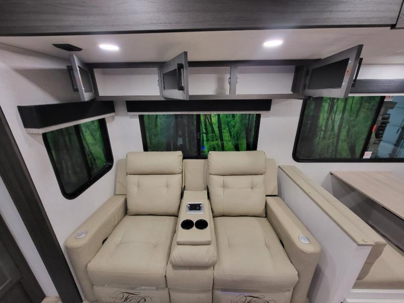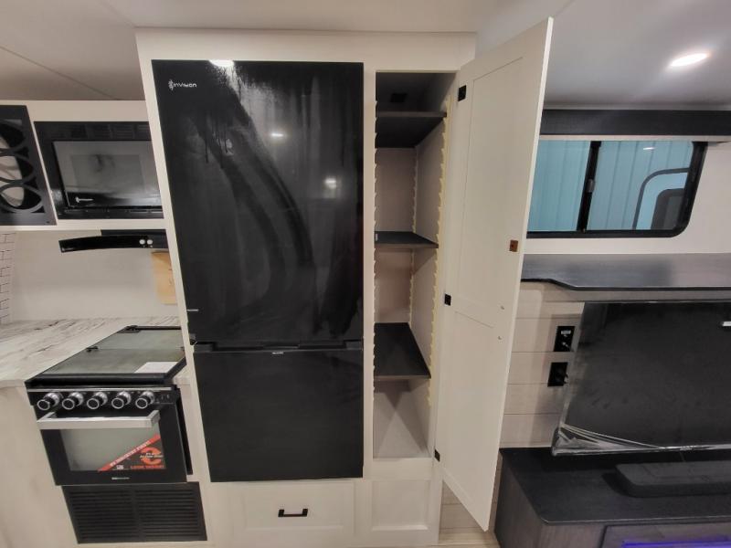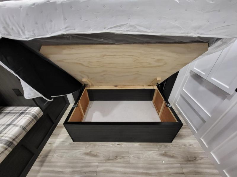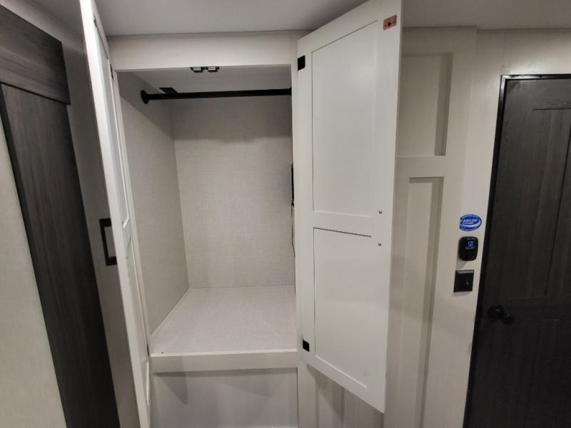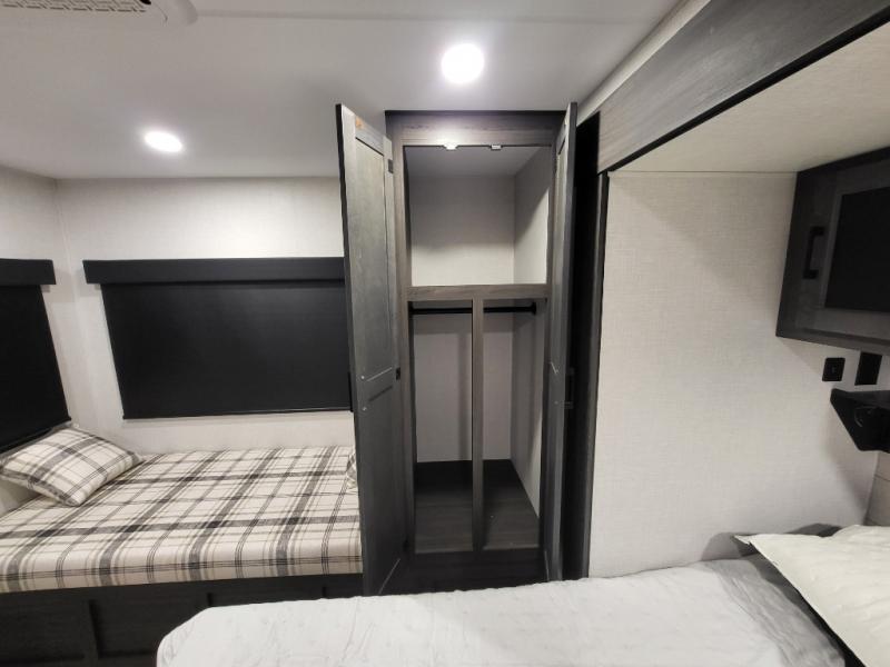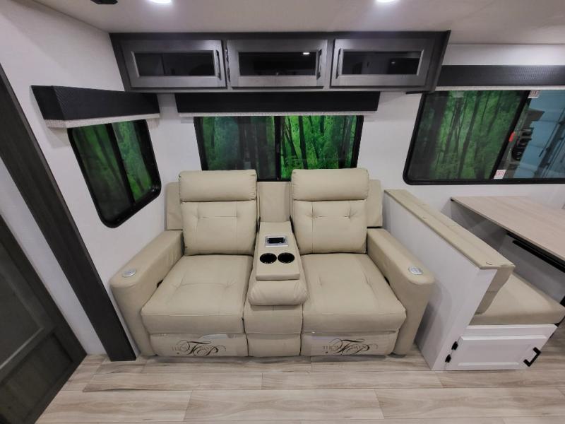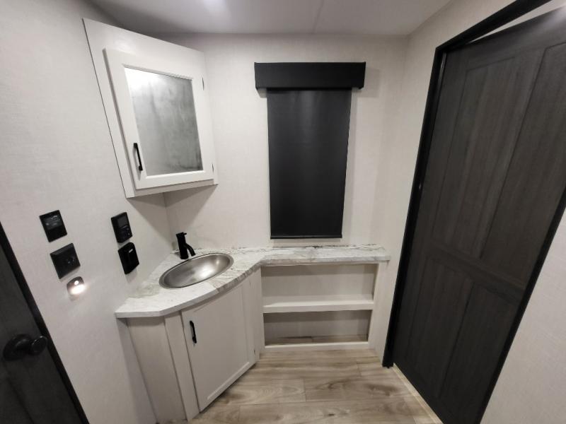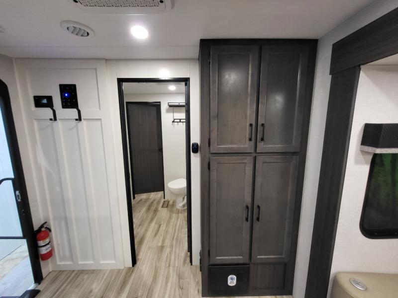 A front kitchen in this travel trailer provides more interior space! Once you have prepared your best meals with the Furrion oven and three burner cooktop, you can head to the Sit N' Slide table with flipside reversible cushions to dine. The 70" sofa also offers a comfortable place to take an afternoon nap or sit while enjoying the entertainment center with a frameless electric fireplace and 40" TV. A walk-thru bath makes it easy for all to enter and has a 30" x 36" shower to freshen up in each morning. The rear private bedroom has a Sleep Tight queen bed slide for a good night's rest, a dresser, two wardrobes, and a bench seat where you sit to put your hiking boots on. You'll also find one of the dual entry doors here for added convenience!