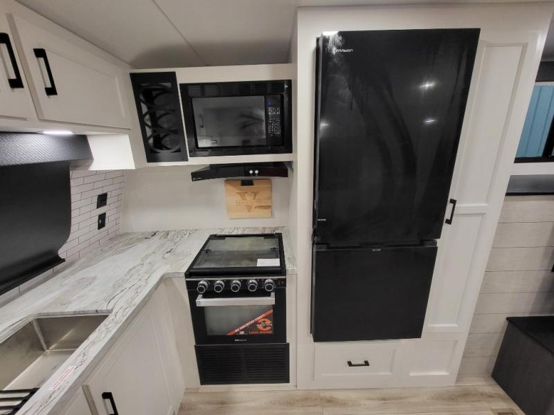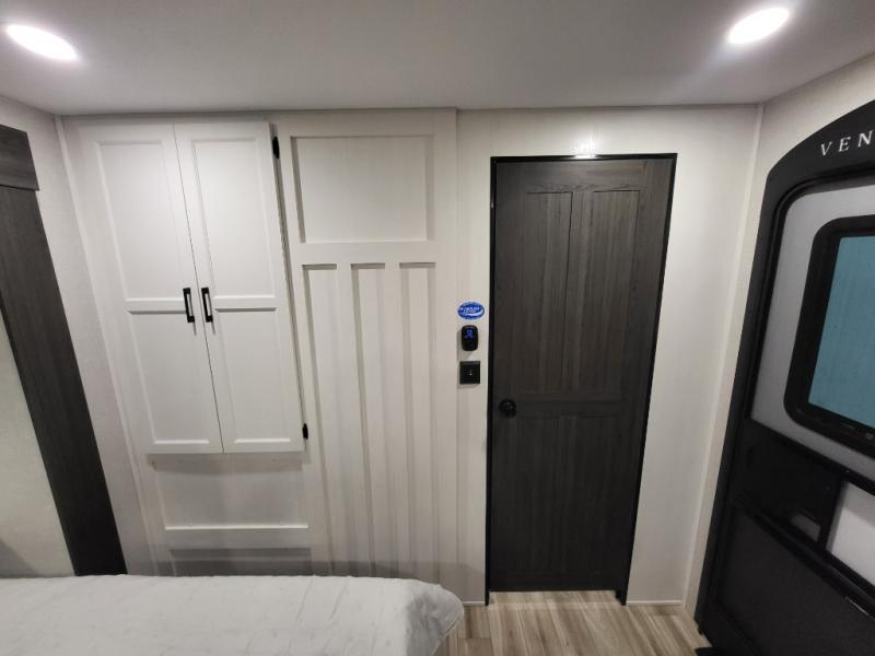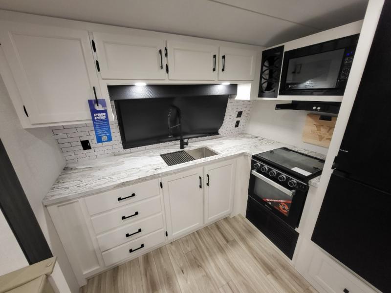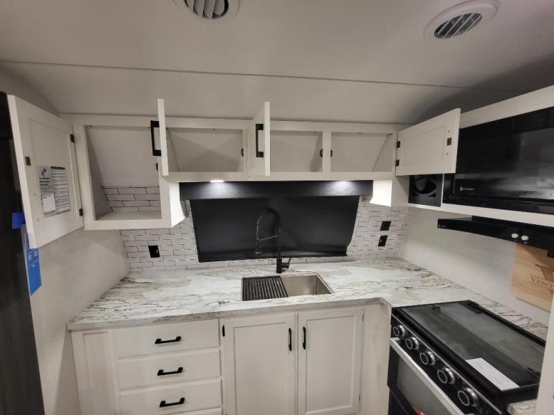 Every Venture RV SportTrek lightweight travel trailer is constructed to offer peace of mind and the comforts of home! Their purposeful residential kitchens are packed with handy features like a Furrion oven and three burner cooktop, a large stainless steel sink with a cover and dish drying rack, plus a 12V refrigerator. You will find plenty of storage throughout, including Safe-Tek hidden storage with a charging center and StorMore nightstands on either side of the bed behind the full-length closets. And the magnetic slam-latch baggage doors and spacious pass-through storage area will hold your outdoor gear in place. They even come with a hot and cold exterior shower and SporTrek's Weather Shield which includes a forced air heated and enclosed underbelly, radiant foil insulation wrapped tanks, and more features that will let you extend your camping season. You will also love the new residential upgraded furniture, Serta memory foam mattress, barn style passage doors, and many more comforts!