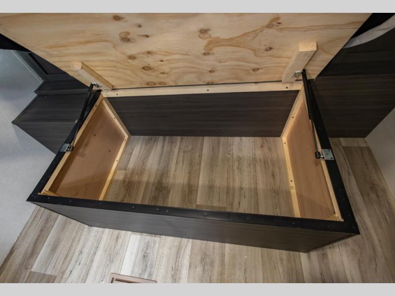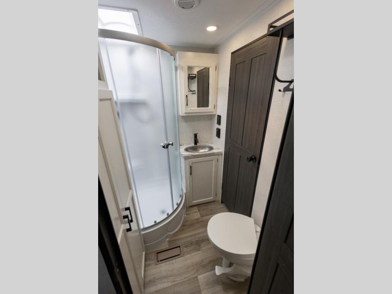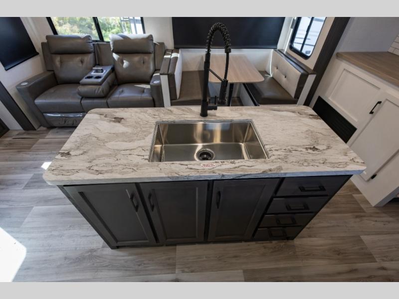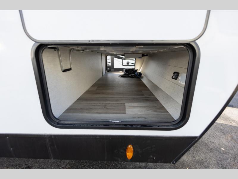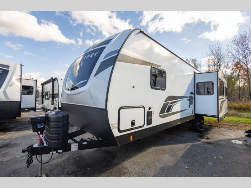 Every Venture RV SportTrek lightweight travel trailer is constructed to offer peace of mind and the comforts of home! Their purposeful residential kitchens are packed with handy features like a Furrion oven and three burner cooktop, a large stainless steel sink with a cover and dish drying rack, plus a 12V refrigerator. You will find plenty of storage throughout, including Safe-Tek hidden storage with a charging center and StorMore nightstands on either side of the bed behind the full-length closets. And the magnetic slam-latch baggage doors and spacious pass-through storage area will hold your outdoor gear in place. They even come with a hot and cold exterior shower and SporTrek's Weather Shield which includes a forced air heated and enclosed underbelly, high output A/C ducting, and more features that will let you extend your camping season. You will also love the new residential upgraded furniture, Serta memory foam mattress, barn style passage doors, and many more comforts!