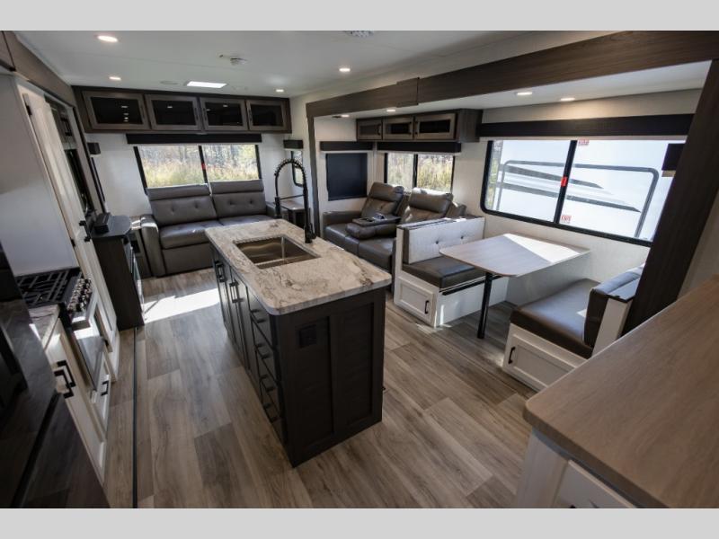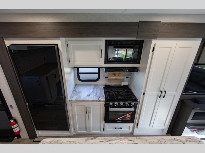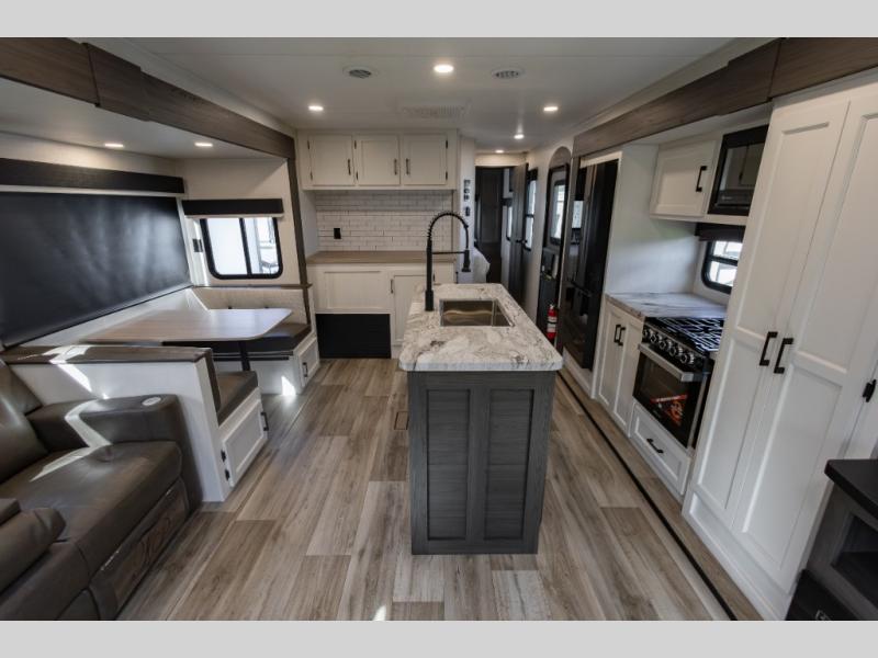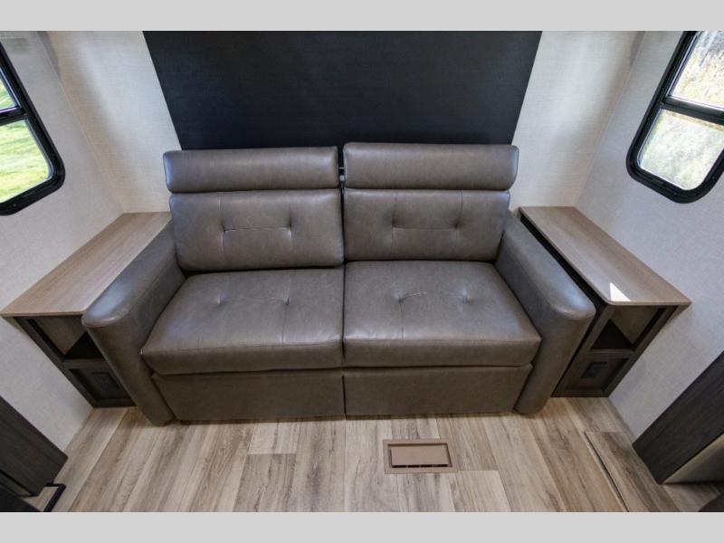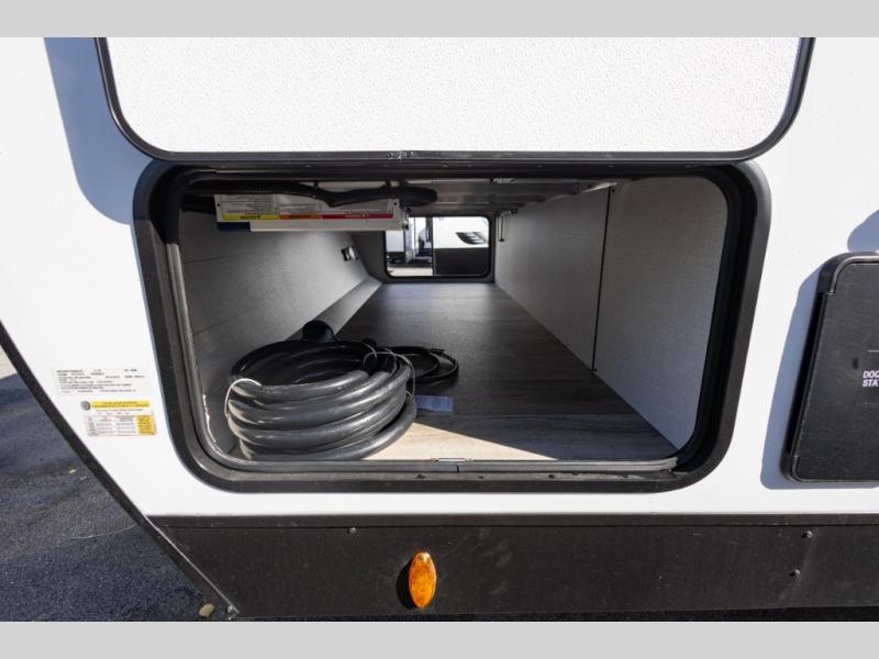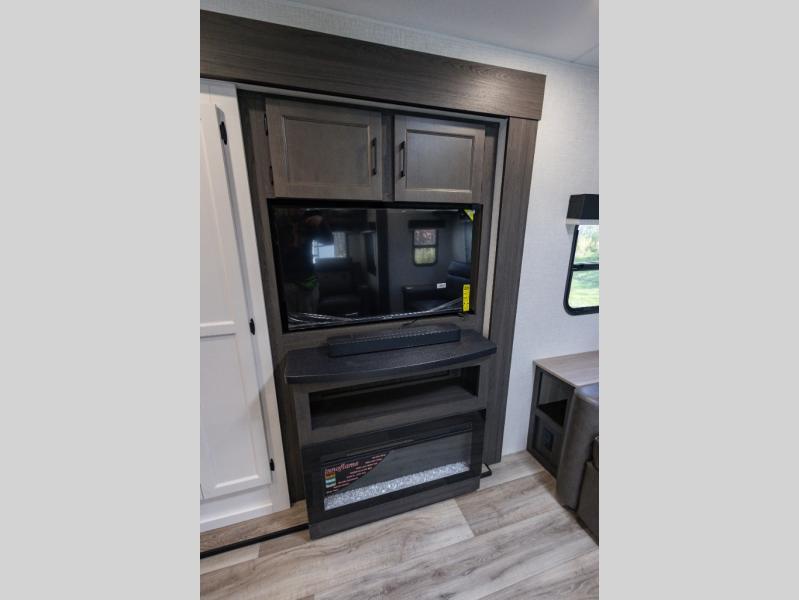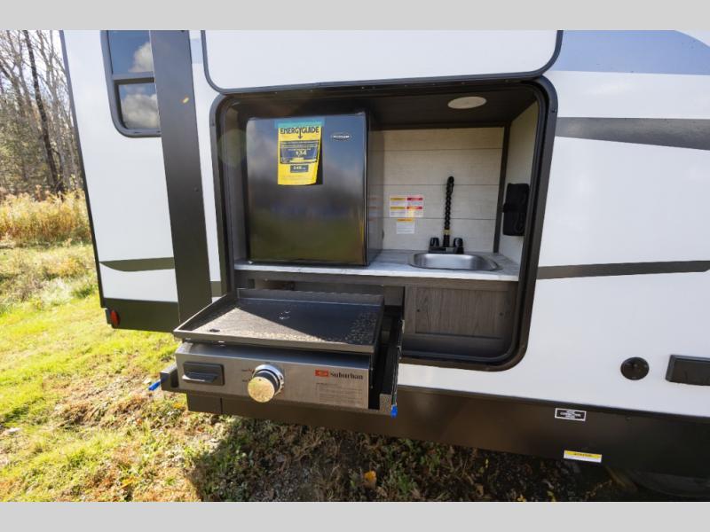 You will feel right at home camping in this travel trailer! From the front private bedroom with a Sleep Tight queen bed to the rear living area with a 70" sofa. The living area also has theater seating with USB ports across from the entertainment center that has a 40" TV for all to see, even those preparing dinner at the kitchen island. Breathe in some fresh air and enjoy a sunrise breakfast as you cook pancakes on the griddle at the outside campfire café. You can store your dishes in the hutch and play games at the Sit N' Slide table with flipside reversible cushions. After a fun day at the beach, head to the dual entry bathroom to rinse the sand out of your hair in the 34" radius shower and grab your towel from the convenient linen closet!