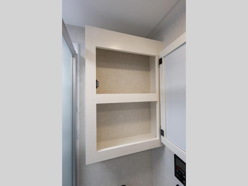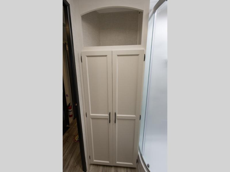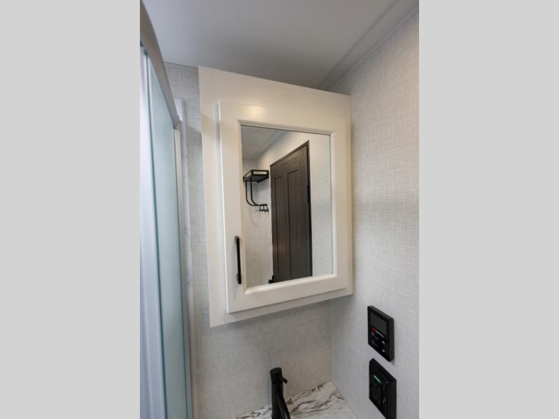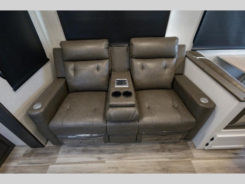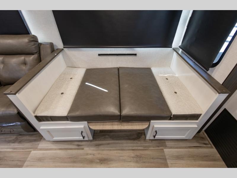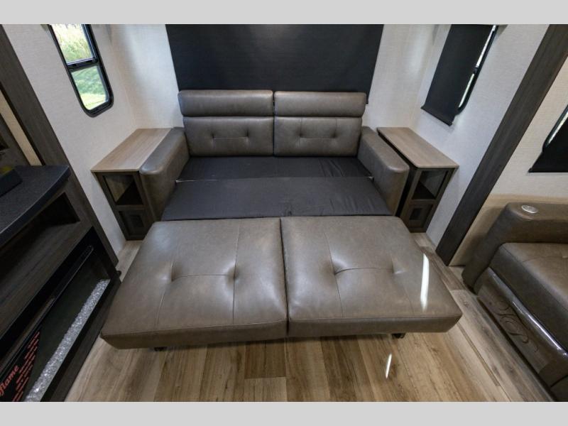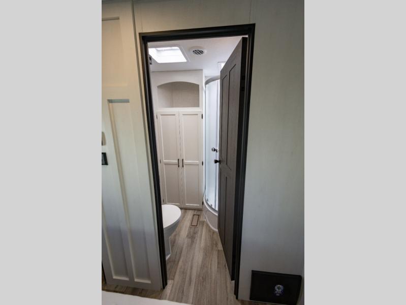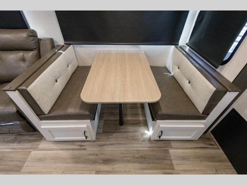 You will feel right at home camping in this travel trailer! From the front private bedroom with a Sleep Tight queen bed to the rear living area with a 70" sofa. The living area also has theater seating with USB ports across from the entertainment center that has a 40" TV for all to see, even those preparing dinner at the kitchen island. Breathe in some fresh air and enjoy a sunrise breakfast as you cook pancakes on the griddle at the outside campfire café. You can store your dishes in the hutch and play games at the Sit N' Slide table with flipside reversible cushions. After a fun day at the beach, head to the dual entry bathroom to rinse the sand out of your hair in the 34" radius shower and grab your towel from the convenient linen closet!