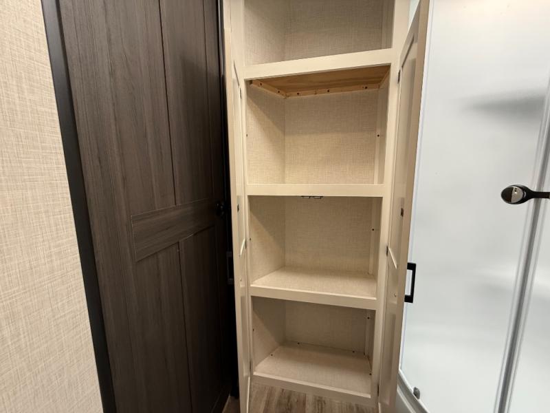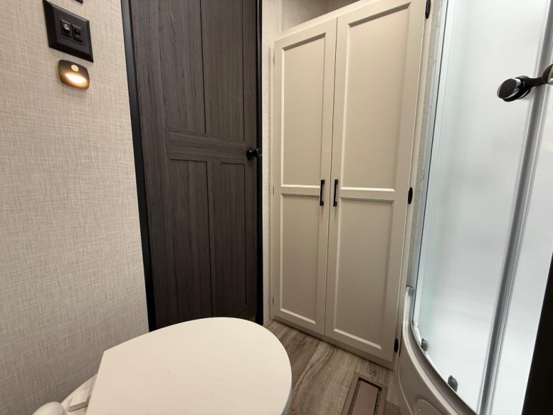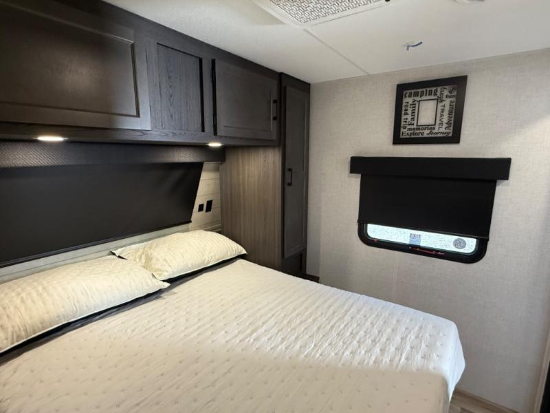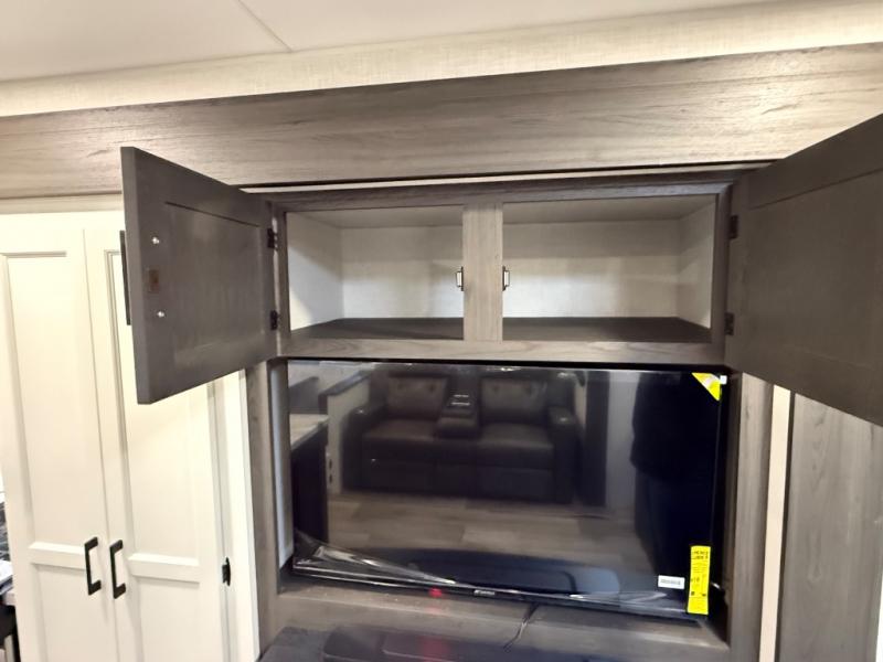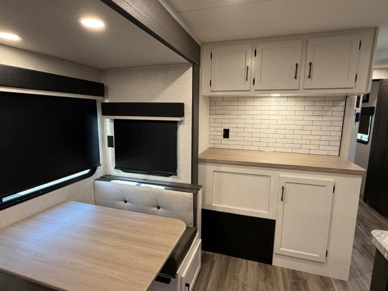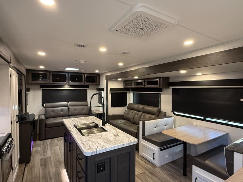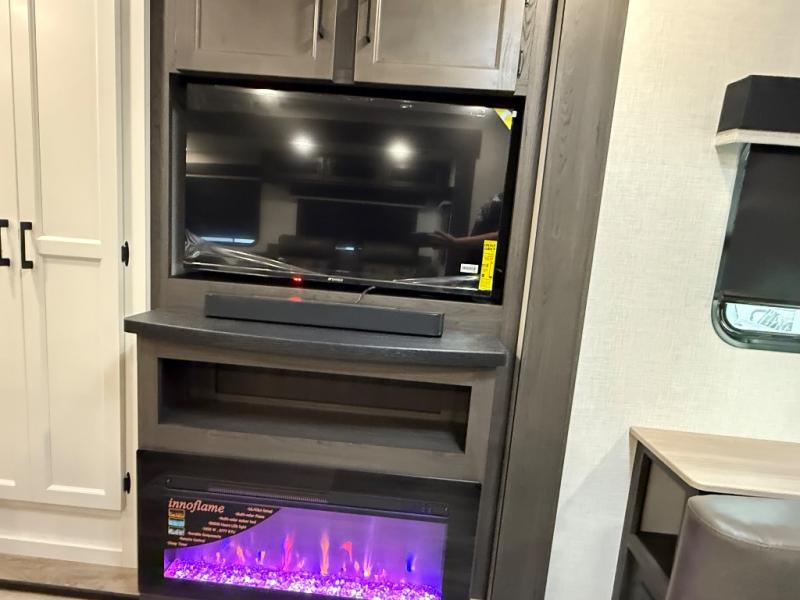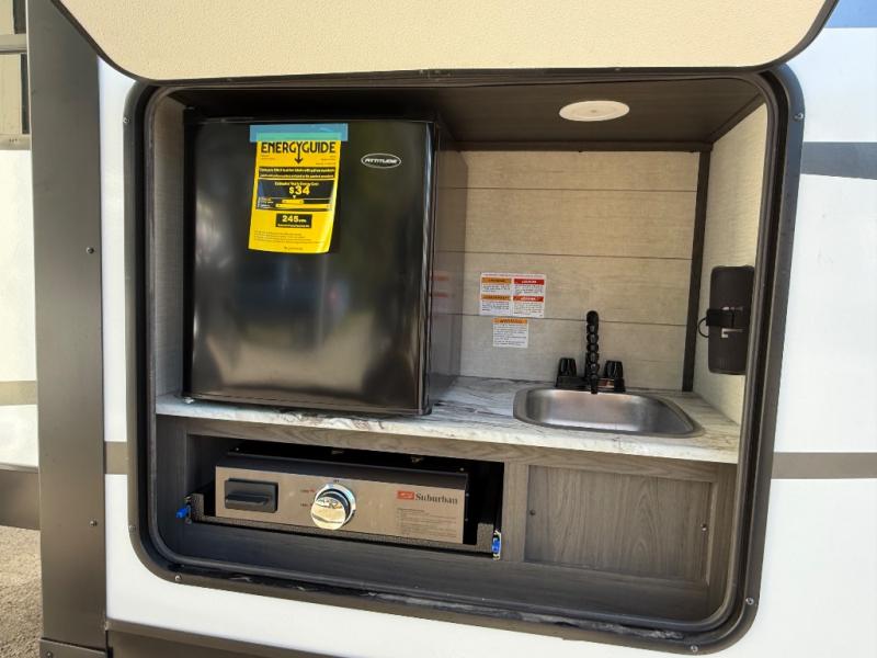 You will feel right at home camping in this travel trailer! From the front private bedroom with a Sleep Tight queen bed to the rear living area with a 70" sofa. The living area also has theater seating with USB ports across from the entertainment center that has a 40" TV for all to see, even those preparing dinner at the kitchen island. Breathe in some fresh air and enjoy a sunrise breakfast as you cook pancakes on the griddle at the outside campfire café. You can store your dishes in the hutch and play games at the Sit N' Slide table with flipside reversible cushions. After a fun day at the beach, head to the dual entry bathroom to rinse the sand out of your hair in the 34" radius shower and grab your towel from the convenient linen closet!
