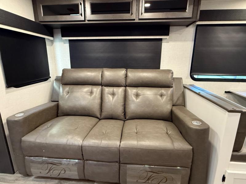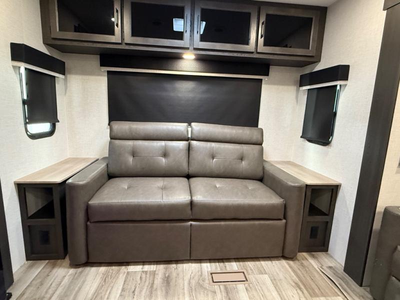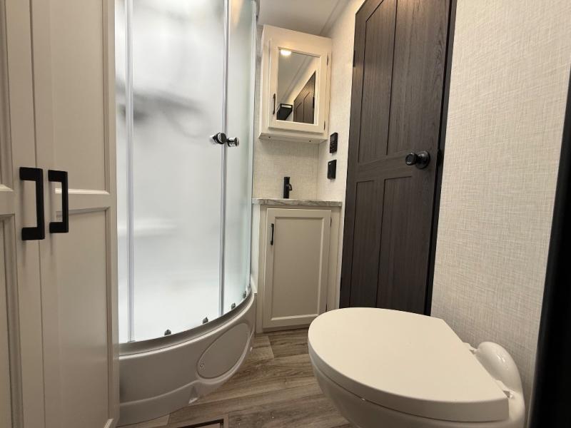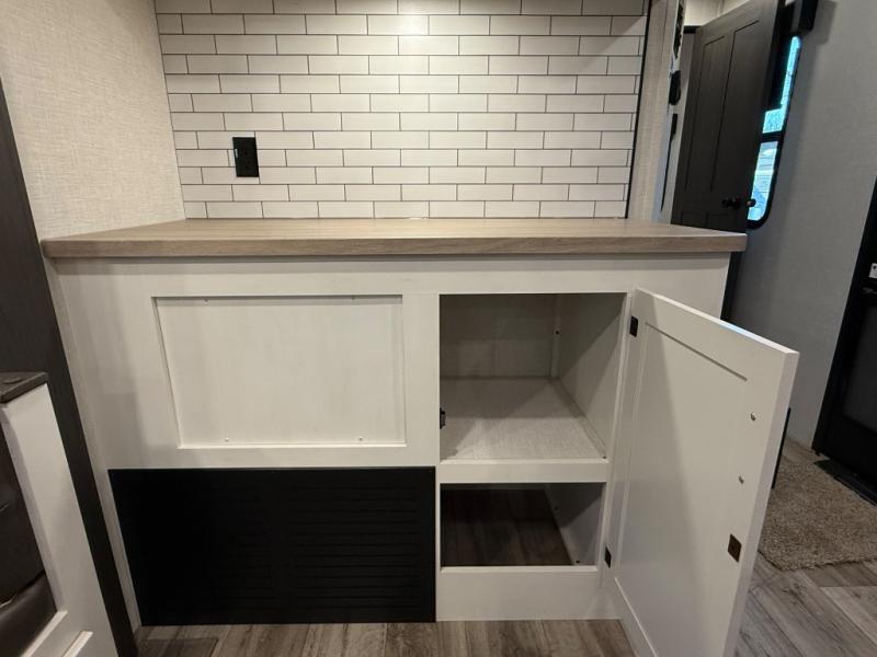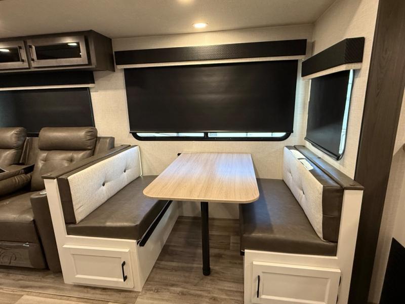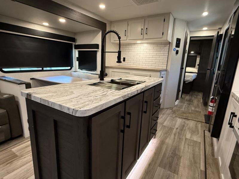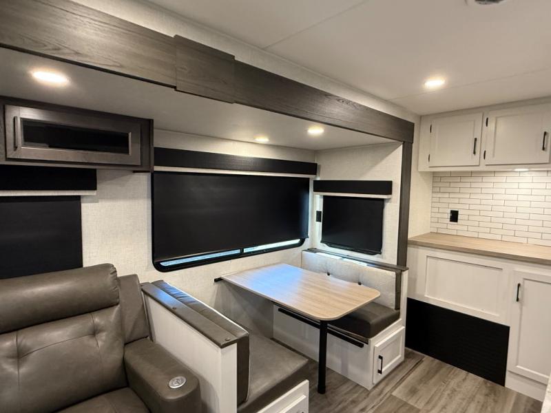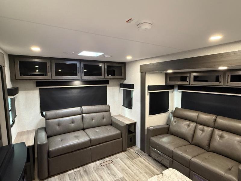 You will feel right at home camping in this travel trailer! From the front private bedroom with a Sleep Tight queen bed to the rear living area with a 70" sofa. The living area also has theater seating with USB ports across from the entertainment center that has a 40" TV for all to see, even those preparing dinner at the kitchen island. Breathe in some fresh air and enjoy a sunrise breakfast as you cook pancakes on the griddle at the outside campfire café. You can store your dishes in the hutch and play games at the Sit N' Slide table with flipside reversible cushions. After a fun day at the beach, head to the dual entry bathroom to rinse the sand out of your hair in the 34" radius shower and grab your towel from the convenient linen closet!