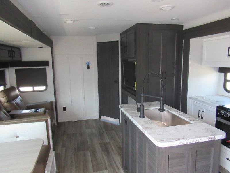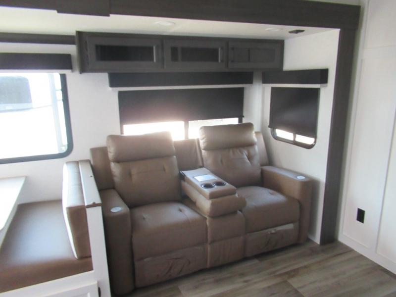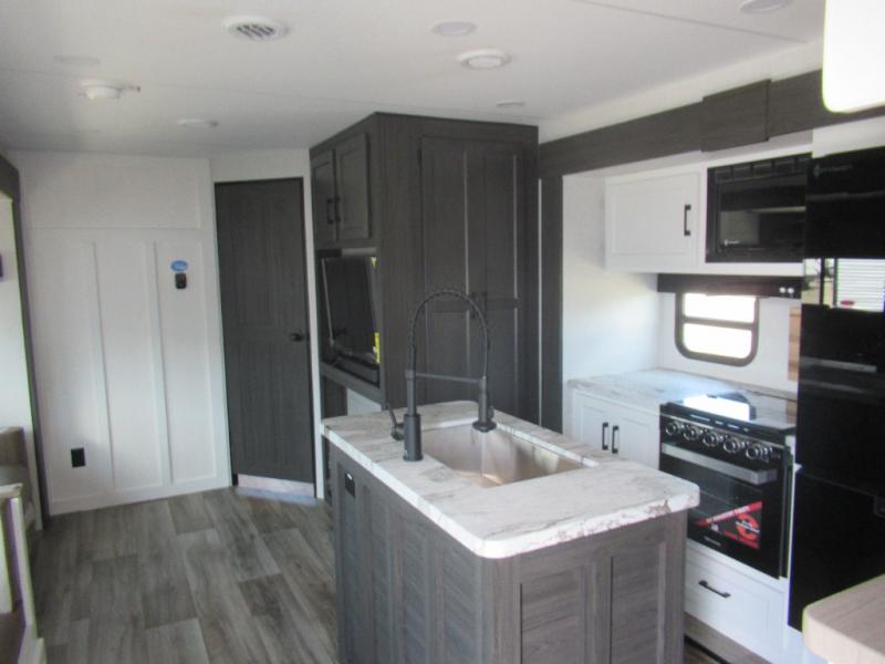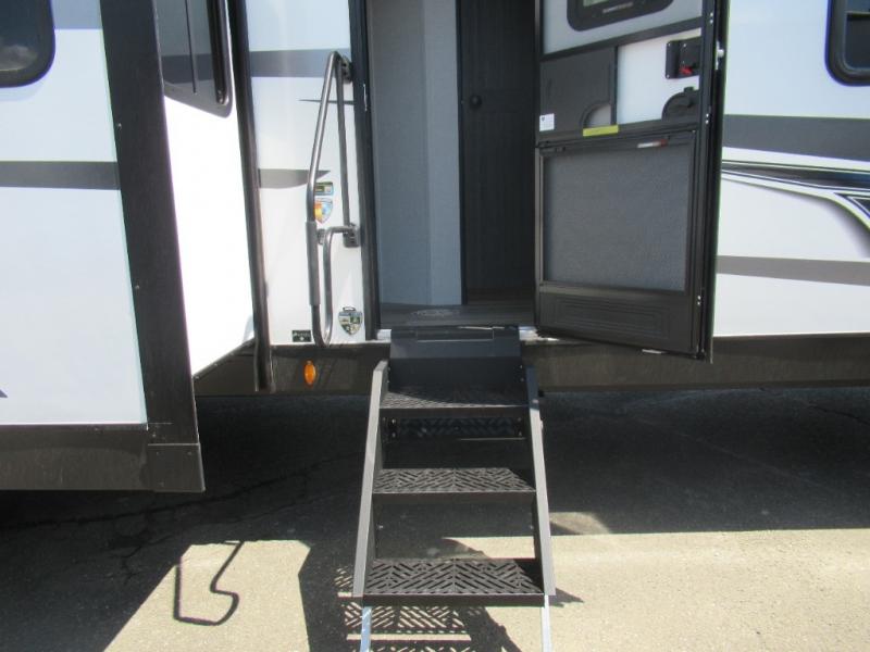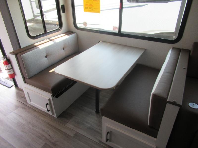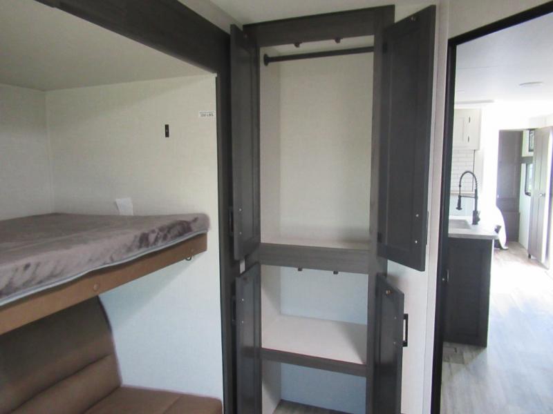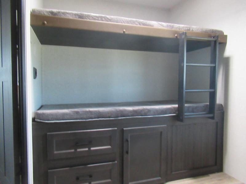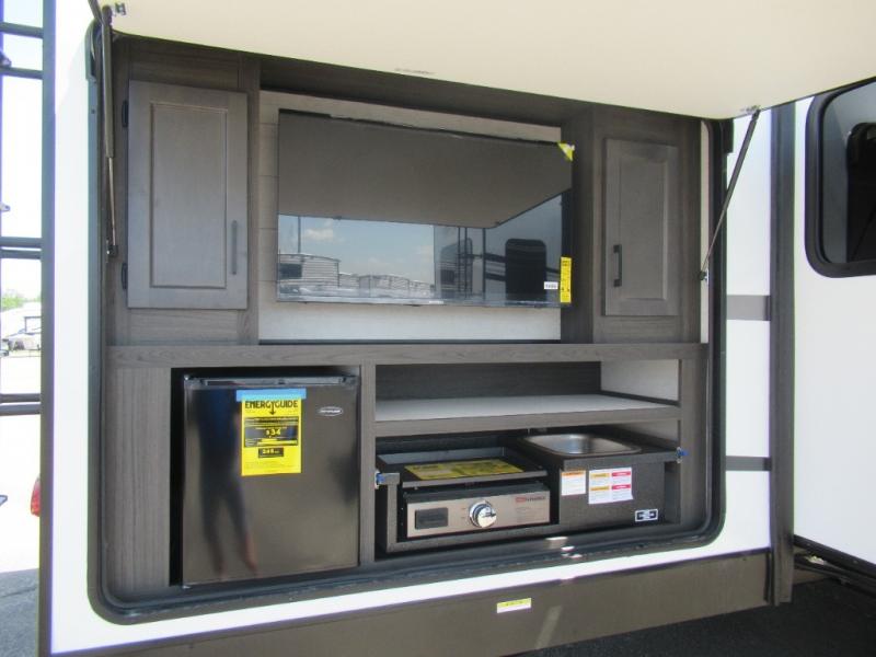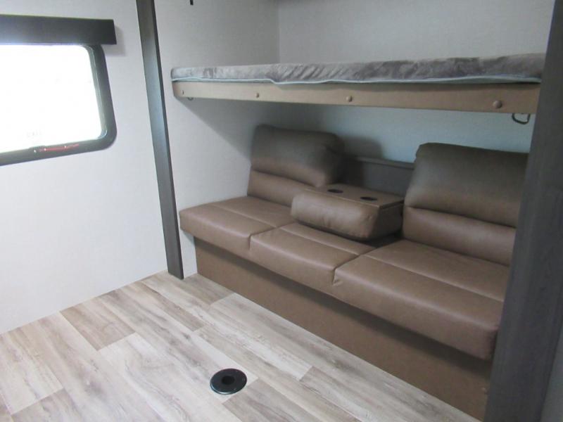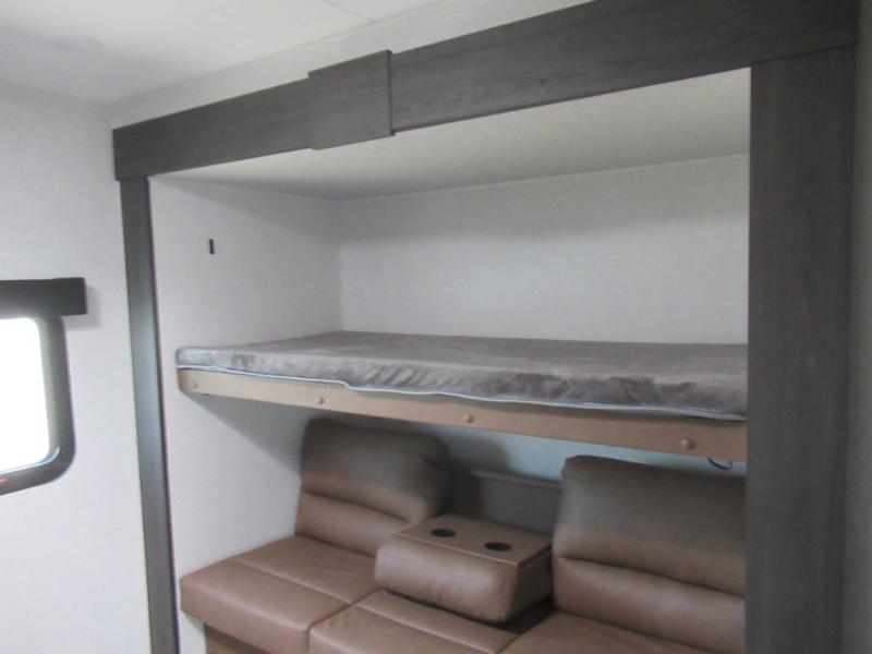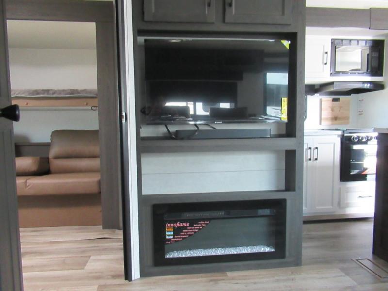 Stay protected rain or shine with the two 10' legless awnings with wind sensors on this travel trailer! Some other exterior features you will enjoy include a campfire café with a 40" TV to watch the big game while you grill steaks on the griddle, and the pass-through storage area with slam latch baggage doors will keep your gear in place. Inside, there is a rear private bunkhouse with a closet, a 32" x 70" flip-up bunk above a 70" sofa with a table, and a 28" x 70" bunk above a 40" x 70" bottom bunk. The living area has a sofa across from an entertainment center with a frameless fireplace and a 40" TV with a swing arm so others can watch it from the Sit N' Slide table. The dual entry bathroom has a 34" radius shower to freshen up in, and is easy to access, especially those staying in the front private bedroom!