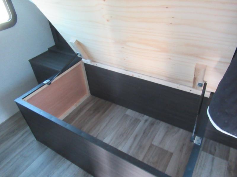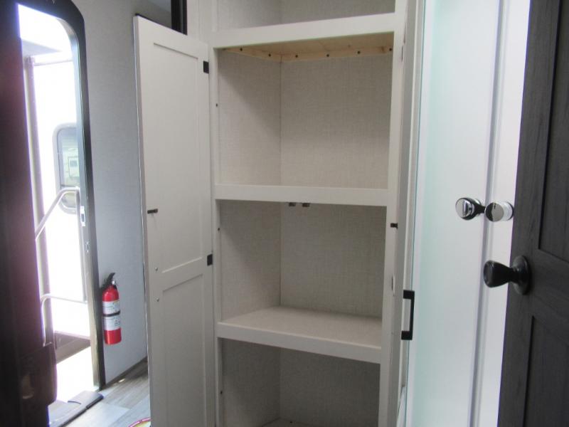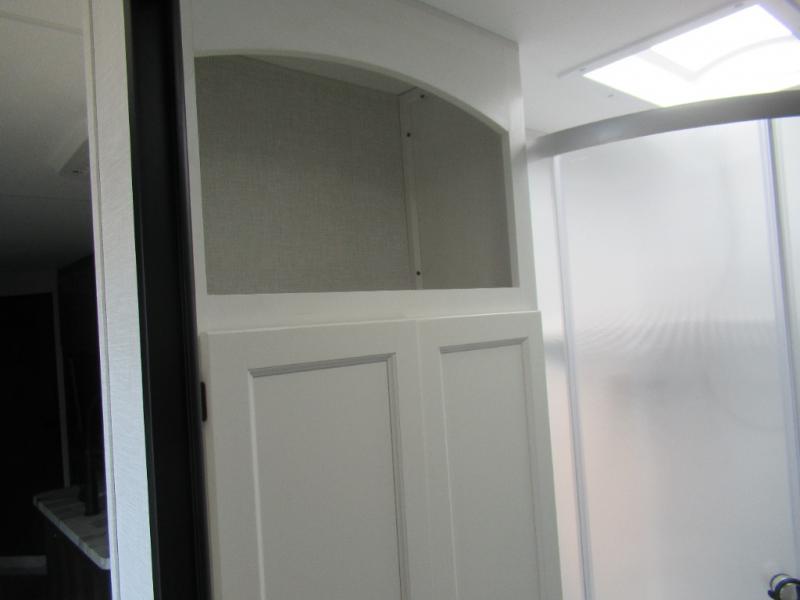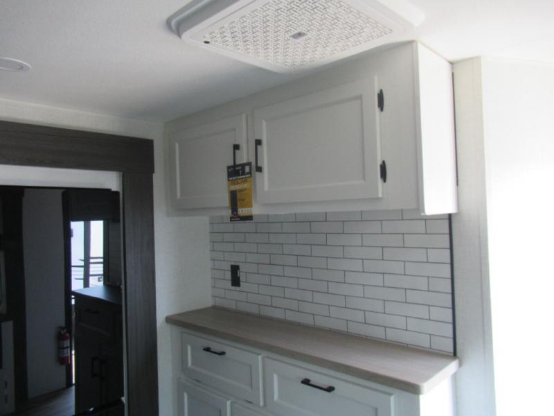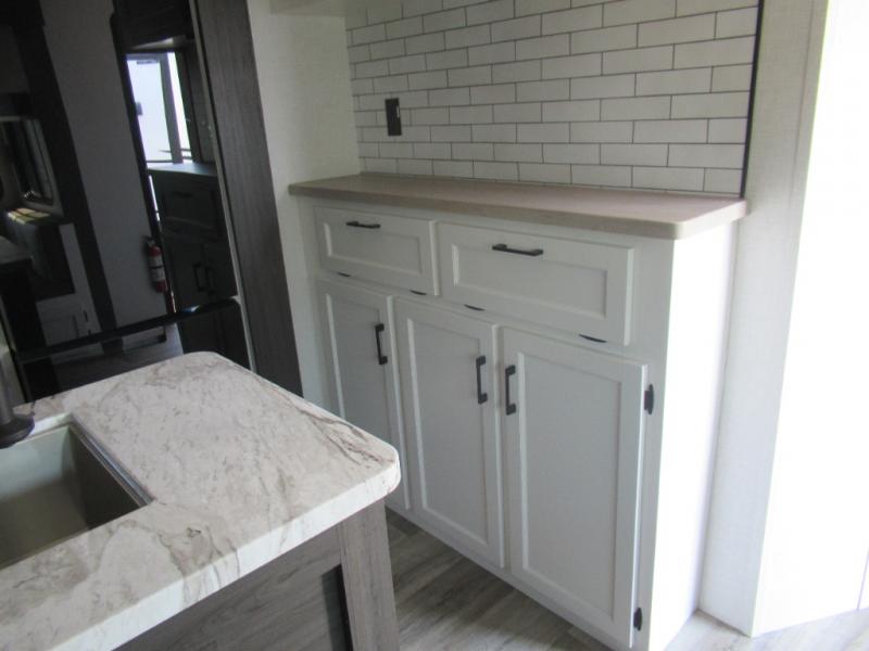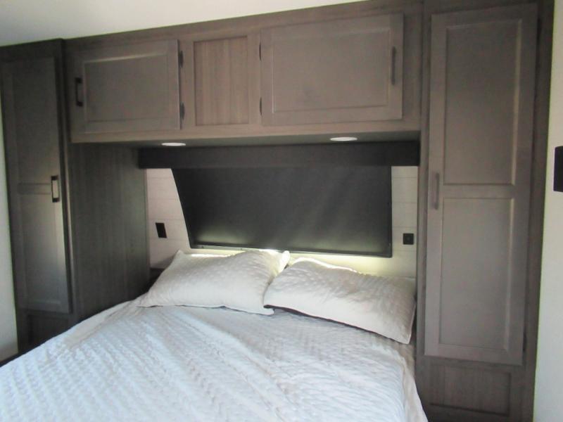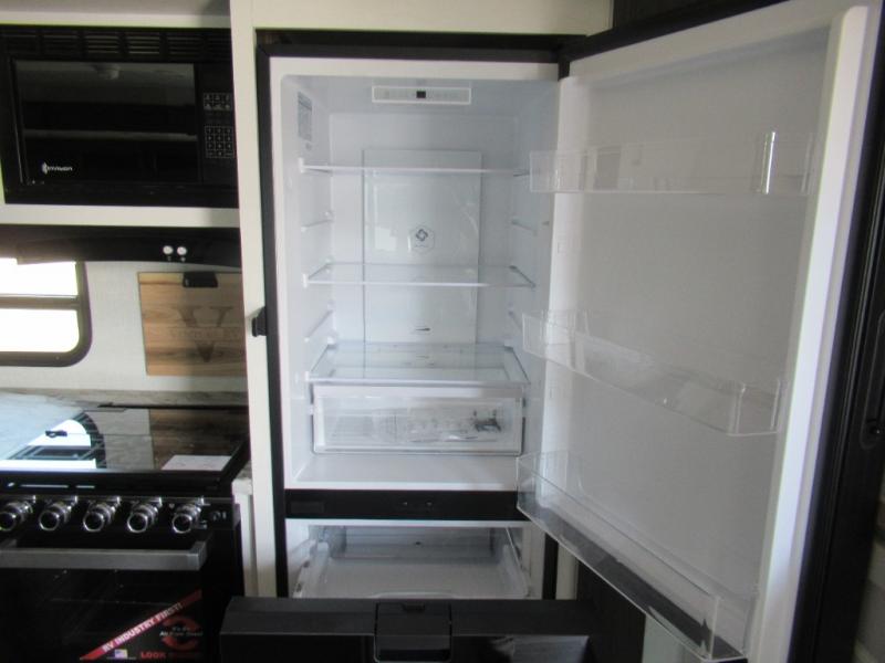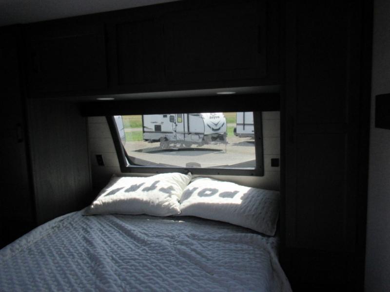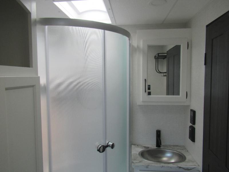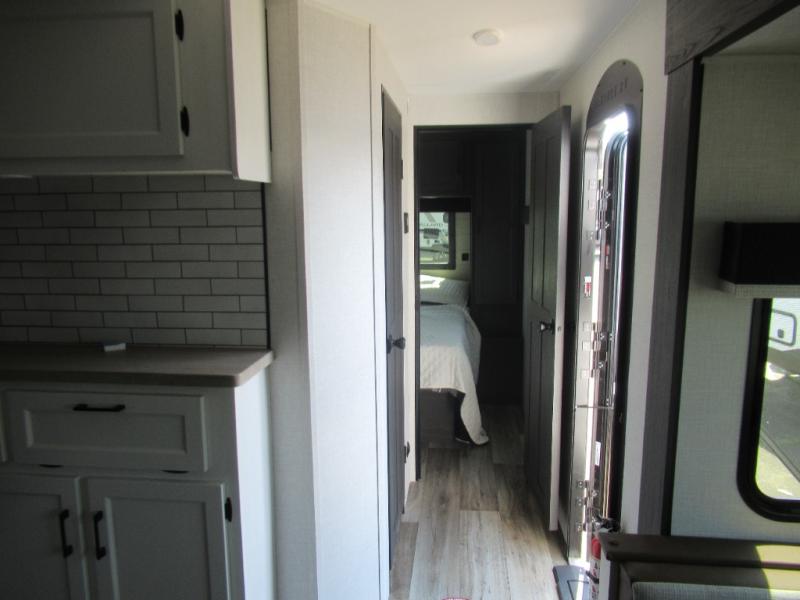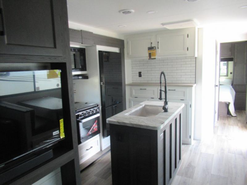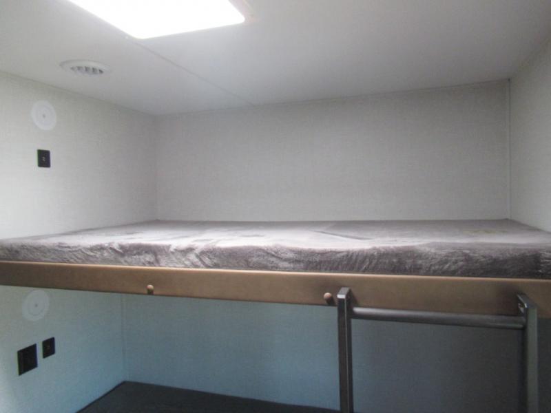 Stay protected rain or shine with the two 10' legless awnings with wind sensors on this travel trailer! Some other exterior features you will enjoy include a campfire café with a 40" TV to watch the big game while you grill steaks on the griddle, and the pass-through storage area with slam latch baggage doors will keep your gear in place. Inside, there is a rear private bunkhouse with a closet, a 32" x 70" flip-up bunk above a 70" sofa with a table, and a 28" x 70" bunk above a 40" x 70" bottom bunk. The living area has a sofa across from an entertainment center with a frameless fireplace and a 40" TV with a swing arm so others can watch it from the Sit N' Slide table. The dual entry bathroom has a 34" radius shower to freshen up in, and is easy to access, especially those staying in the front private bedroom!