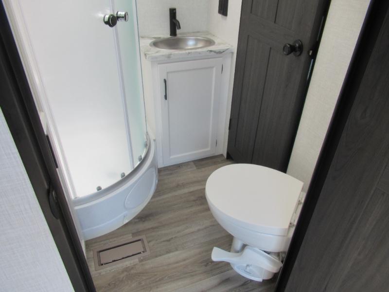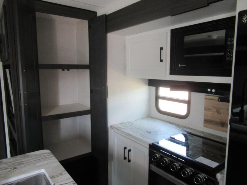 Every Venture RV SportTrek lightweight travel trailer is constructed to offer peace of mind and the comforts of home! Their purposeful residential kitchens are packed with handy features like a Furrion oven and three burner cooktop, a large stainless steel sink with a cover and dish drying rack, plus a 12V refrigerator. You will find plenty of storage throughout, including Safe-Tek hidden storage with a charging center and StorMore nightstands on either side of the bed behind the full-length closets. And the magnetic slam-latch baggage doors and spacious pass-through storage area will hold your outdoor gear in place. They even come with a hot and cold exterior shower and SporTrek's Weather Shield which includes a forced air heated and enclosed underbelly, high output A/C ducting, and more features that will let you extend your camping season. You will also love the new residential upgraded furniture, Serta memory foam mattress, barn style passage doors, and many more comforts!