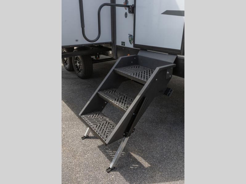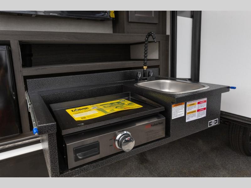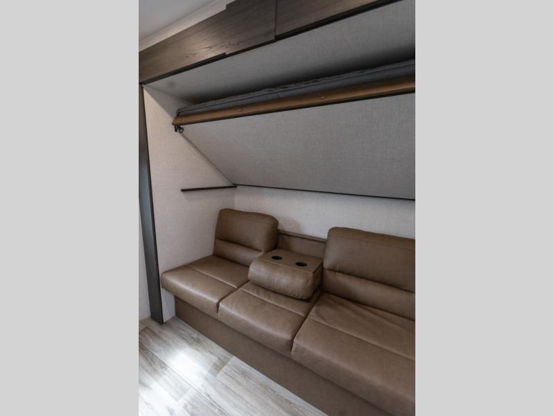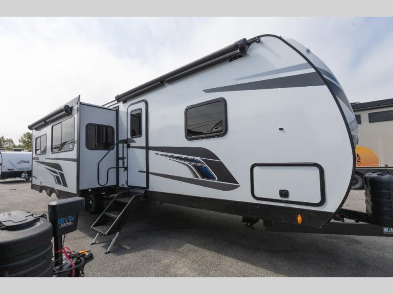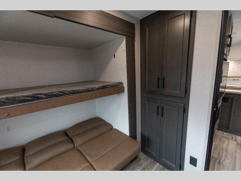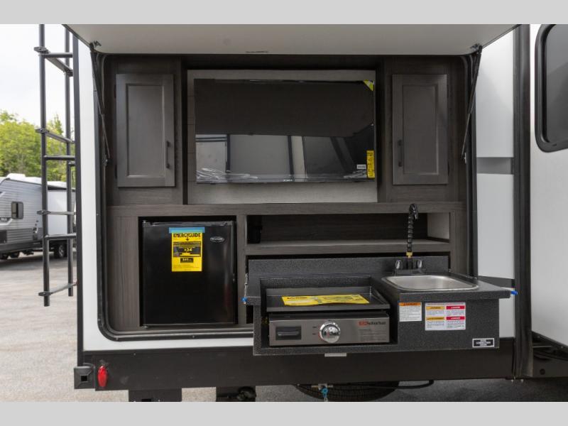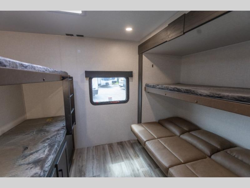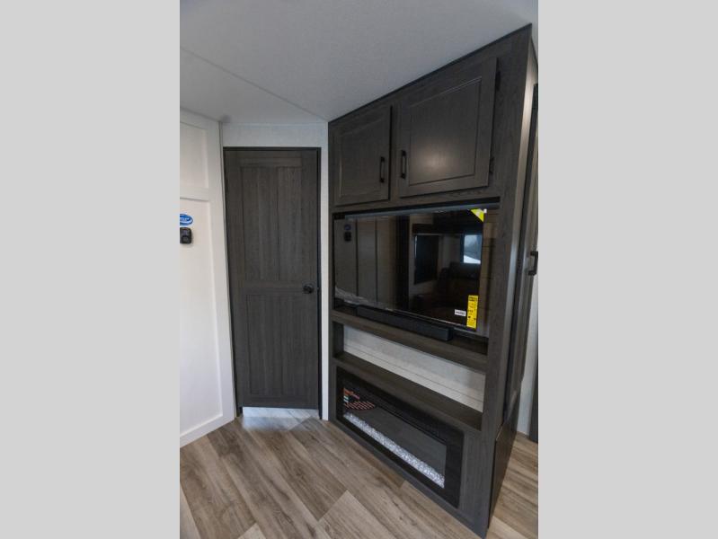 Stay protected rain or shine with the two 10' legless awnings with wind sensors on this travel trailer! Some other exterior features you will enjoy include a campfire café with a 40" TV to watch the big game while you grill steaks on the griddle, and the pass-through storage area with slam latch baggage doors will keep your gear in place. Inside, there is a rear private bunkhouse with a closet, a 32" x 70" flip-up bunk above a 70" sofa with a table, and a 28" x 70" bunk above a 40" x 70" bottom bunk. The living area has a sofa across from an entertainment center with a frameless fireplace and a 40" TV with a swing arm so others can watch it from the Sit N' Slide table. The dual entry bathroom has a 34" radius shower to freshen up in, and is easy to access, especially those staying in the front private bedroom!