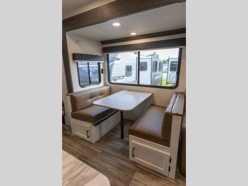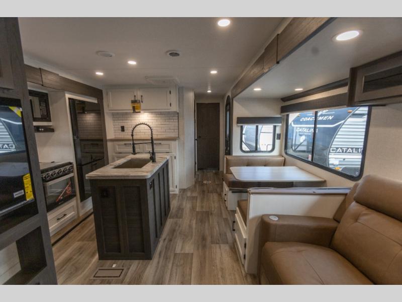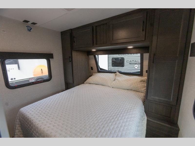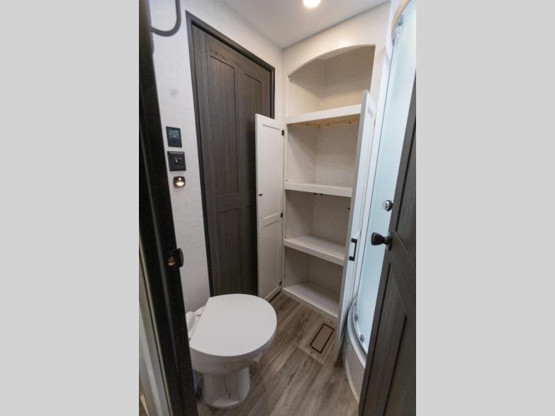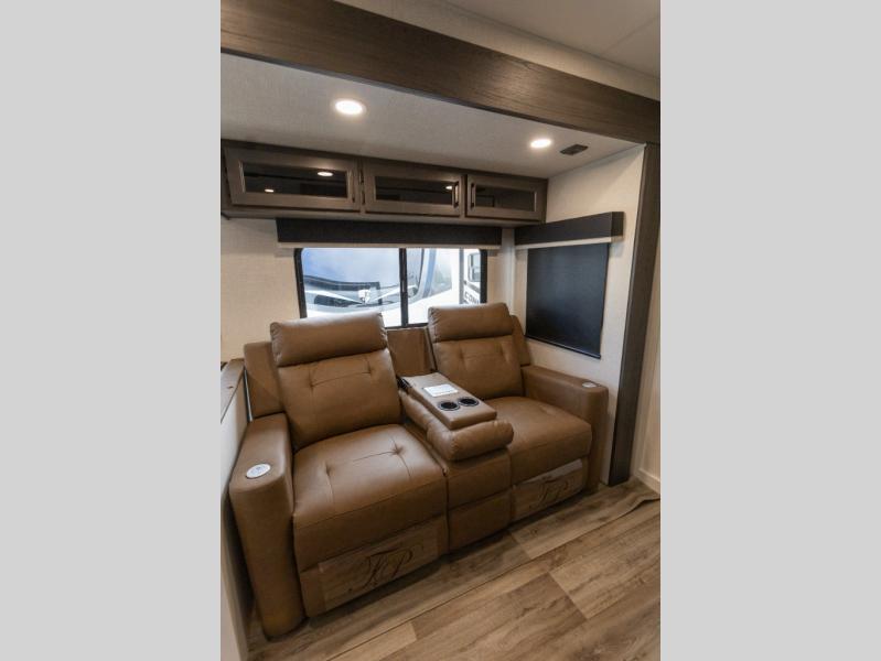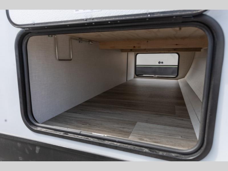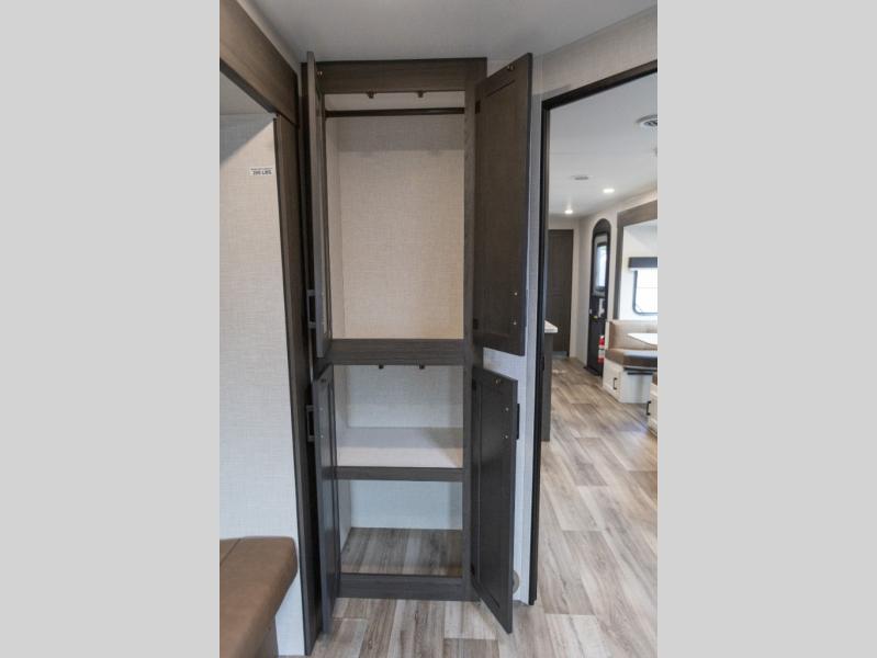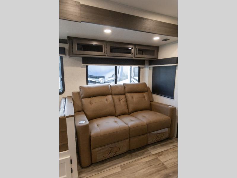Stay protected rain or shine with the two 10' legless awnings with wind sensors on this travel trailer! Some other exterior features you will enjoy include a campfire café with a 40" TV to watch the big game while you grill steaks on the griddle, and the pass-through storage area with slam latch baggage doors will keep your gear in place. Inside, there is a rear private bunkhouse with a closet, a 32" x 70" flip-up bunk above a 70" sofa with a table, and a 28" x 70" bunk above a 40" x 70" bottom bunk. The living area has a sofa across from an entertainment center with a frameless fireplace and a 40" TV with a swing arm so others can watch it from the Sit N' Slide table. The dual entry bathroom has a 34" radius shower to freshen up in, and is easy to access, especially those staying in the front private bedroom!