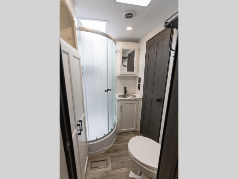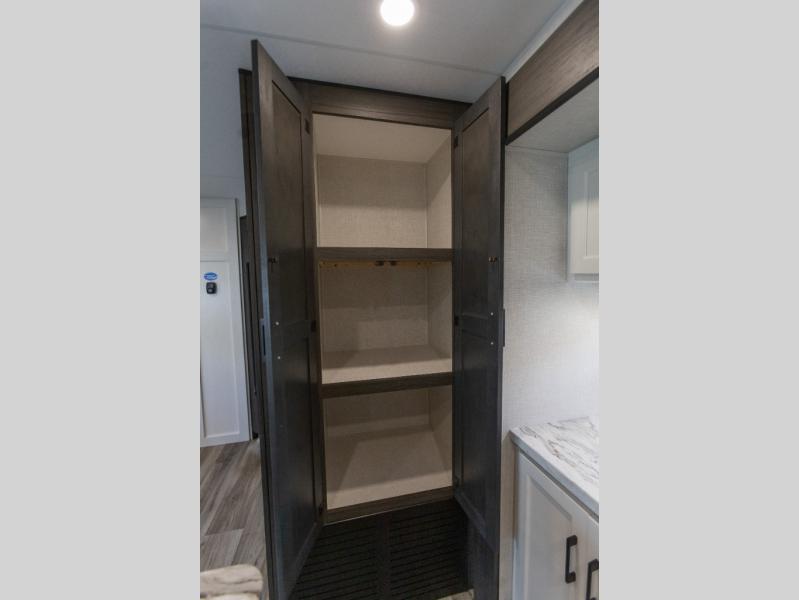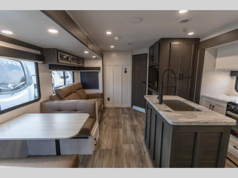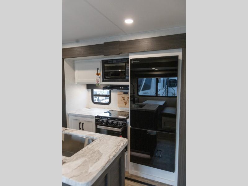 Every Venture RV SportTrek lightweight travel trailer is constructed to offer peace of mind and the comforts of home! Their purposeful residential kitchens are packed with handy features like a Furrion oven and three burner cooktop, a large stainless steel sink with a cover and dish drying rack, plus a 12V refrigerator. You will find plenty of storage throughout, including Safe-Tek hidden storage with a charging center and StorMore nightstands on either side of the bed behind the full-length closets. And the magnetic slam-latch baggage doors and spacious pass-through storage area will hold your outdoor gear in place. They even come with a hot and cold exterior shower and SporTrek's Weather Shield which includes a forced air heated and enclosed underbelly, high output A/C ducting, and more features that will let you extend your camping season. You will also love the new residential upgraded furniture, Serta memory foam mattress, barn style passage doors, and many more comforts!