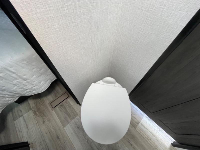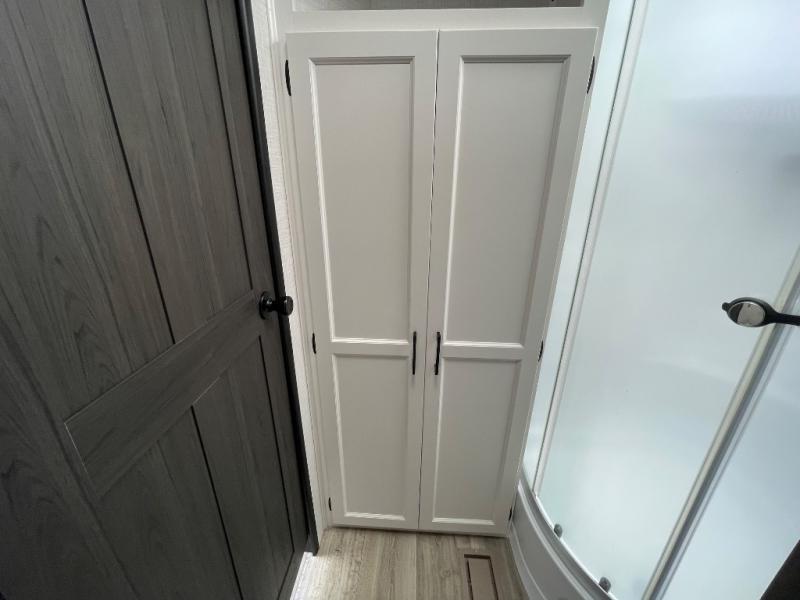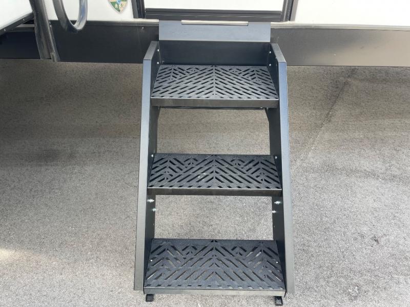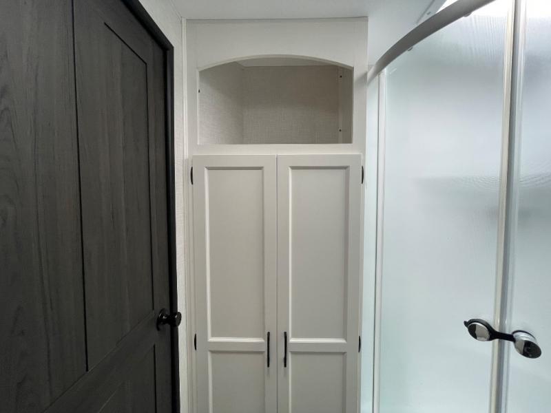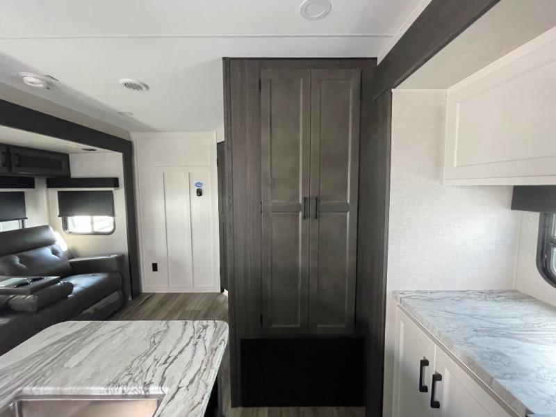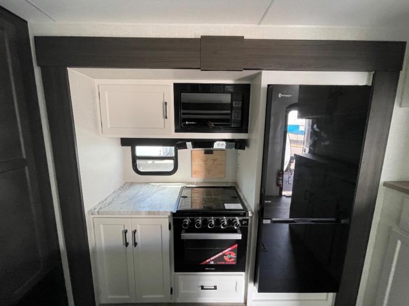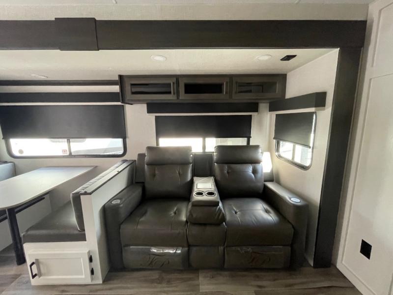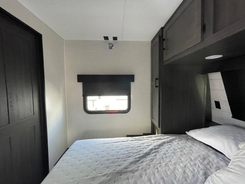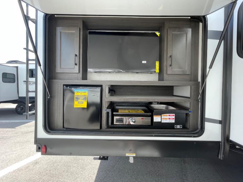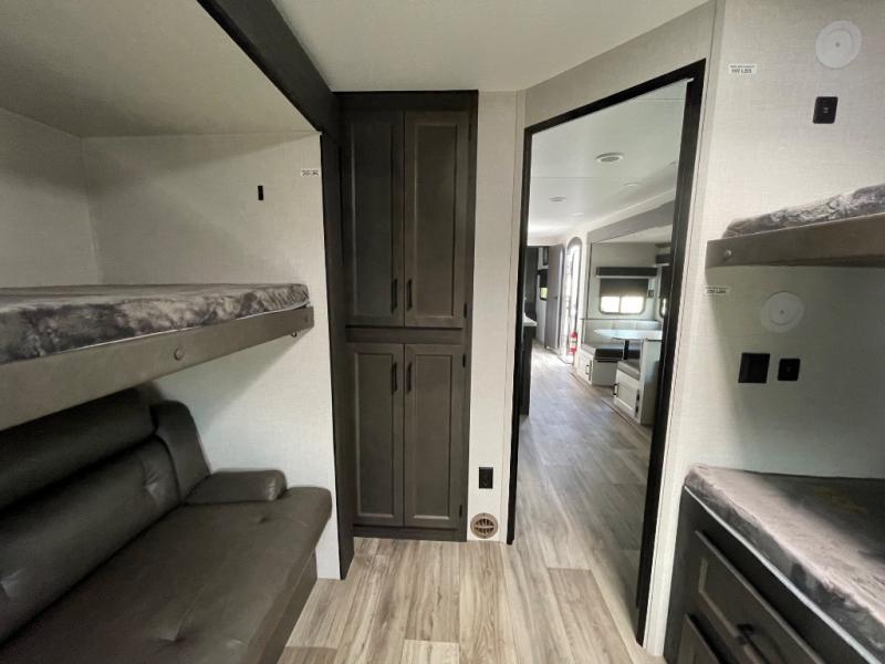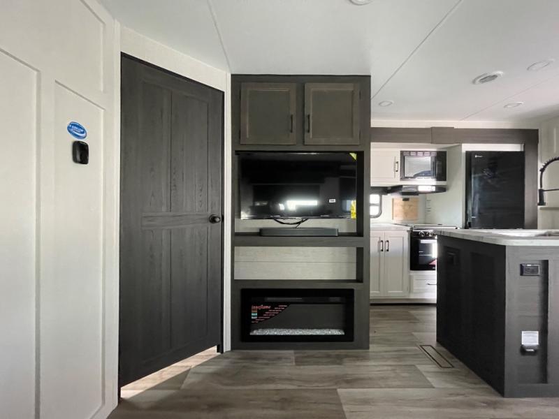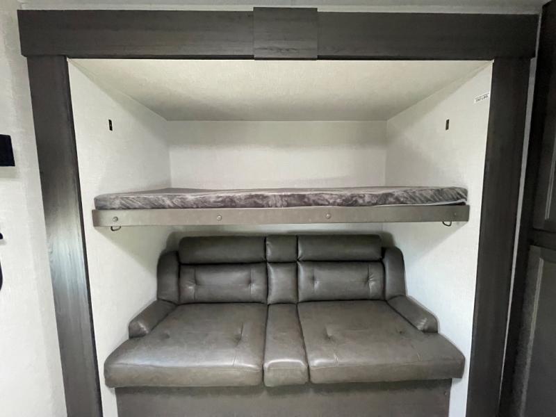Stay protected rain or shine with the two 10' legless awnings with wind sensors on this travel trailer! Some other exterior features you will enjoy include a campfire café with a 40" TV to watch the big game while you grill steaks on the griddle, and the pass-through storage area with slam latch baggage doors will keep your gear in place. Inside, there is a rear private bunkhouse with a closet, a 32" x 70" flip-up bunk above a 70" sofa with a table, and a 28" x 70" bunk above a 40" x 70" bottom bunk. The living area has a sofa across from an entertainment center with a frameless fireplace and a 40" TV with a swing arm so others can watch it from the Sit N' Slide table. The dual entry bathroom has a 34" radius shower to freshen up in, and is easy to access, especially those staying in the front private bedroom!