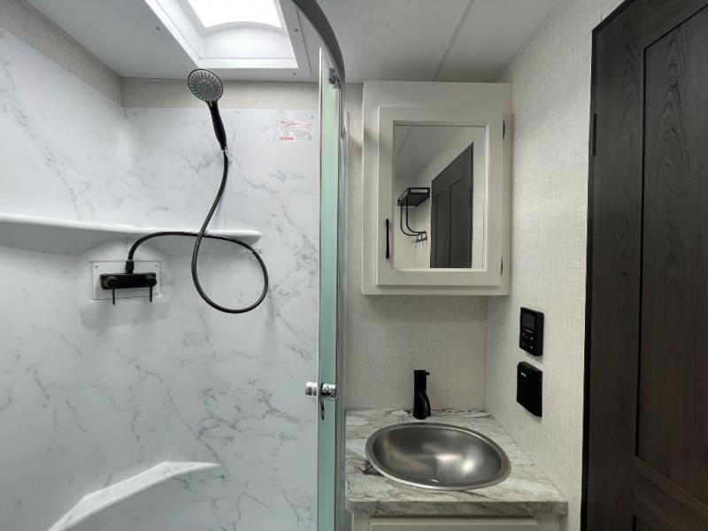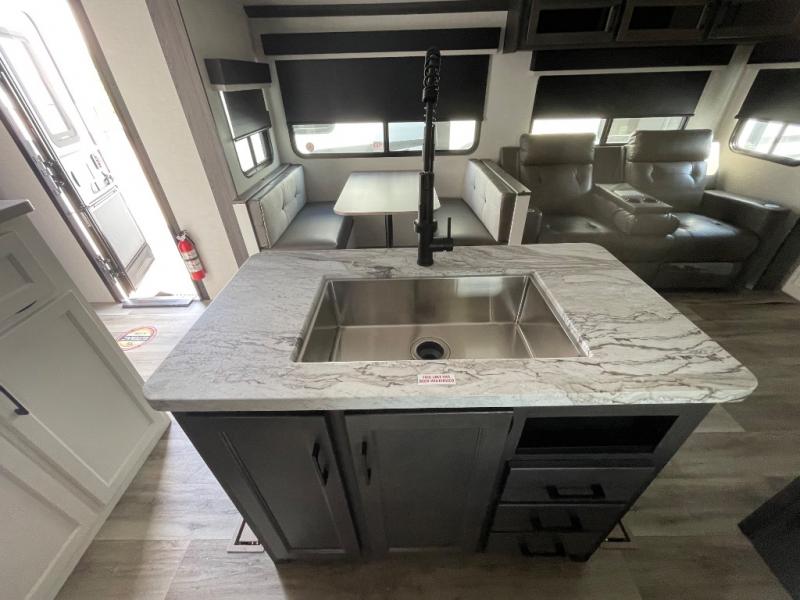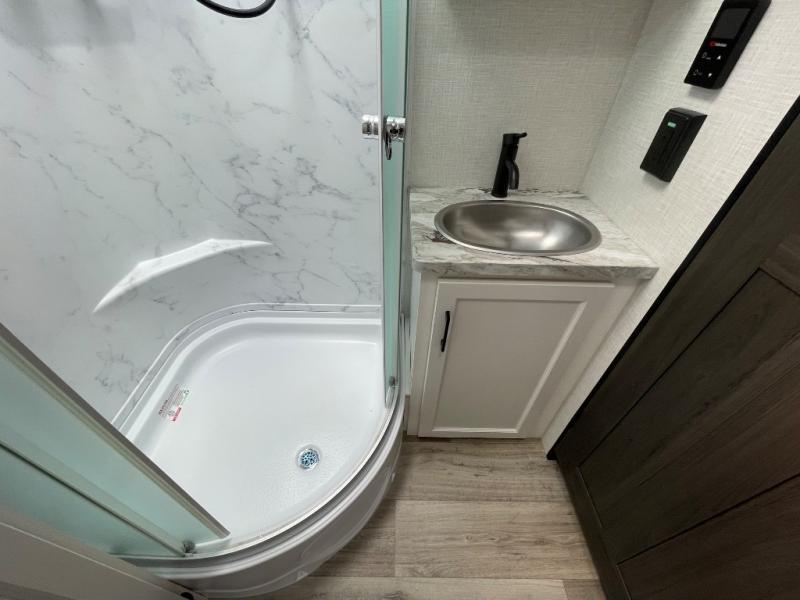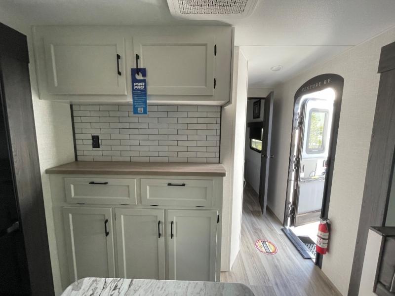 Every Venture RV SportTrek lightweight travel trailer is constructed to offer peace of mind and the comforts of home! Their purposeful residential kitchens are packed with handy features like a Furrion oven and three burner cooktop, a large stainless steel sink with a cover and dish drying rack, plus a 12V refrigerator. You will find plenty of storage throughout, including Safe-Tek hidden storage with a charging center and StorMore nightstands on either side of the bed behind the full-length closets. And the magnetic slam-latch baggage doors and spacious pass-through storage area will hold your outdoor gear in place. They even come with a hot and cold exterior shower and SporTrek's Weather Shield which includes a forced air heated and enclosed underbelly, high output A/C ducting, and more features that will let you extend your camping season. You will also love the new residential upgraded furniture, Serta memory foam mattress, barn style passage doors, and many more comforts!