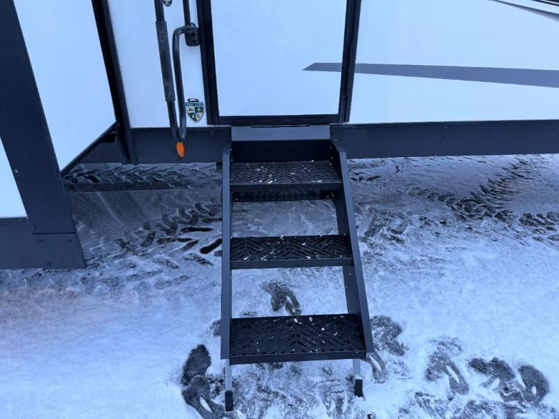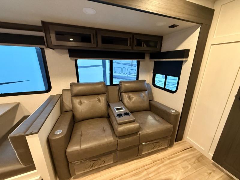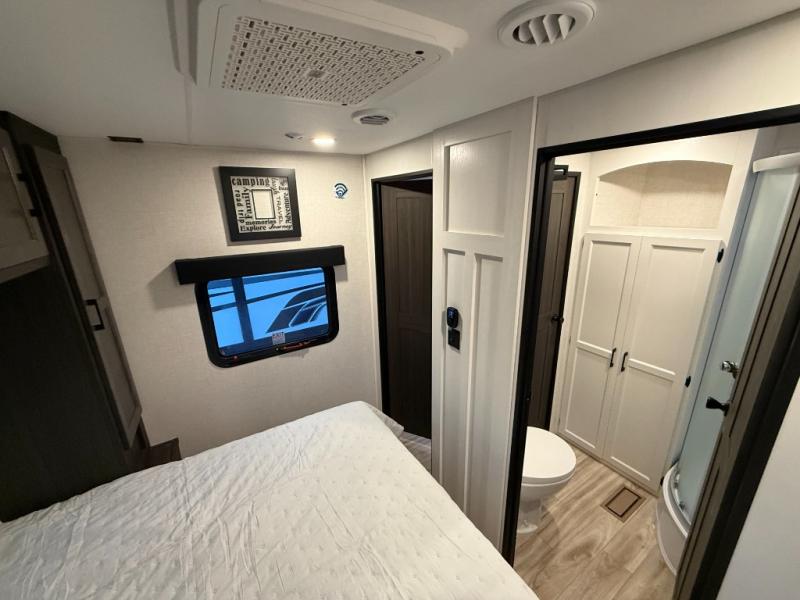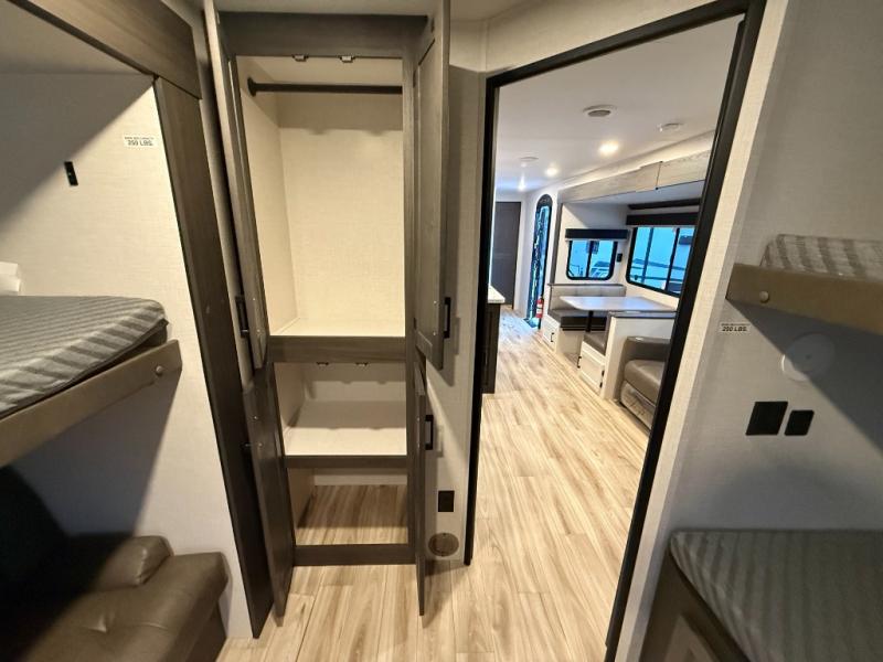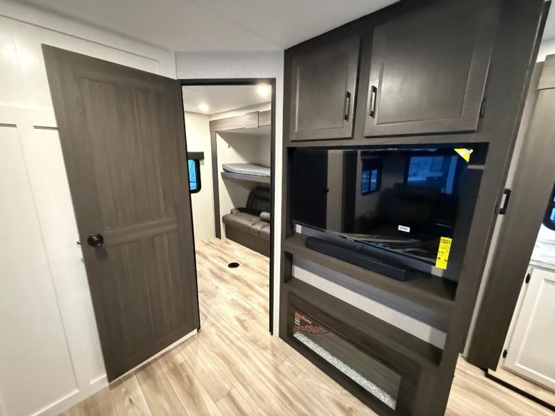 Stay protected rain or shine with the two 10' legless awnings with wind sensors on this travel trailer! Some other exterior features you will enjoy include a campfire café with a 40" TV to watch the big game while you grill steaks on the griddle, and the pass-through storage area with slam latch baggage doors will keep your gear in place. Inside, there is a rear private bunkhouse with a closet, a 32" x 70" flip-up bunk above a 70" sofa with a table, and a 28" x 70" bunk above a 40" x 70" bottom bunk. The living area has a sofa across from an entertainment center with a frameless fireplace and a 40" TV with a swing arm so others can watch it from the Sit N' Slide table. The dual entry bathroom has a 34" radius shower to freshen up in, and is easy to access, especially those staying in the front private bedroom!