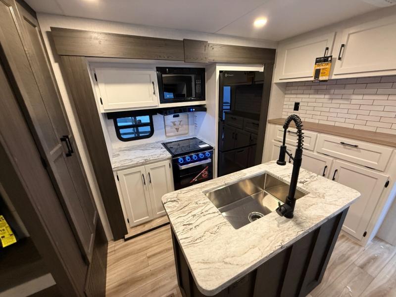 Every Venture RV SportTrek lightweight travel trailer is constructed to offer peace of mind and the comforts of home! Their purposeful residential kitchens are packed with handy features like a Furrion oven and three burner cooktop, a large stainless steel sink with a cover and dish drying rack, plus a 12V refrigerator. You will find plenty of storage throughout, including Safe-Tek hidden storage with a charging center and StorMore nightstands on either side of the bed behind the full-length closets. And the magnetic slam-latch baggage doors and spacious pass-through storage area will hold your outdoor gear in place. They even come with a hot and cold exterior shower and SporTrek's Weather Shield which includes a forced air heated and enclosed underbelly, radiant foil insulation wrapped tanks, and more features that will let you extend your camping season. You will also love the new residential upgraded furniture, Serta memory foam mattress, barn style passage doors, and many more comforts!