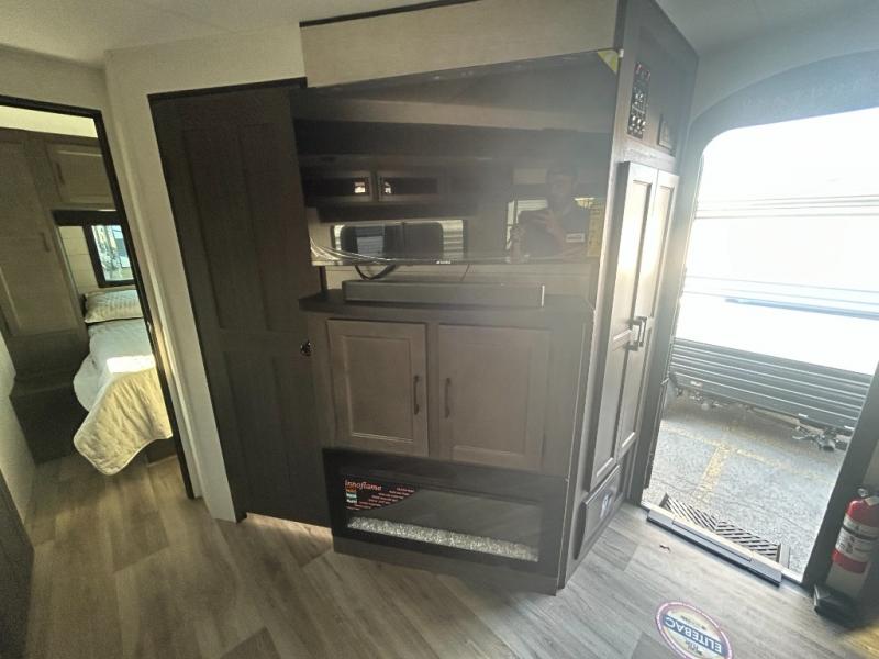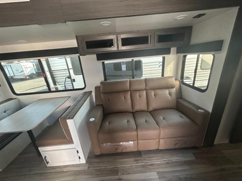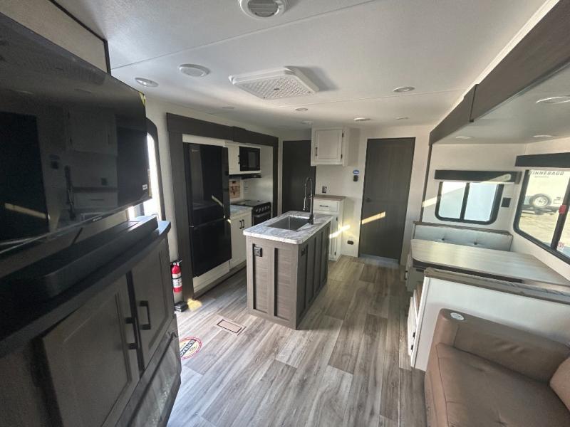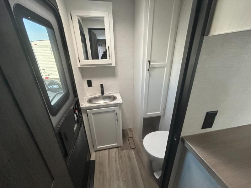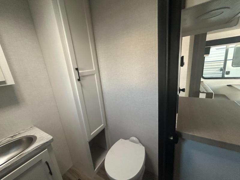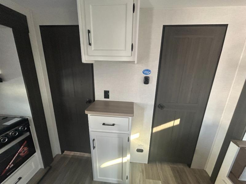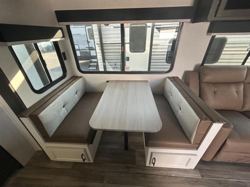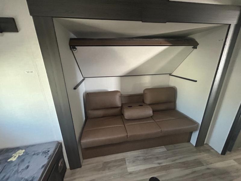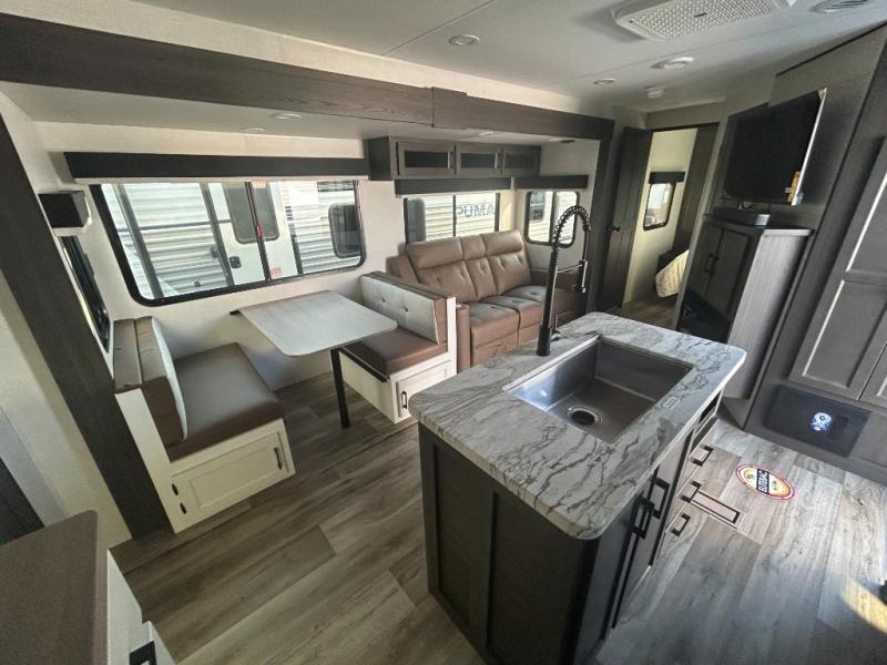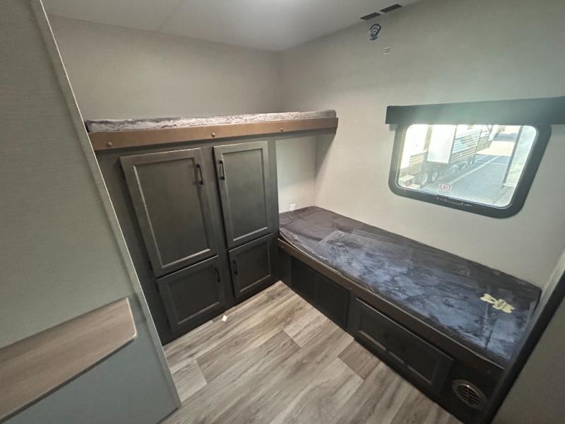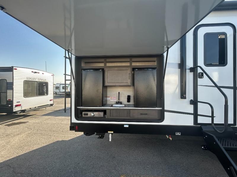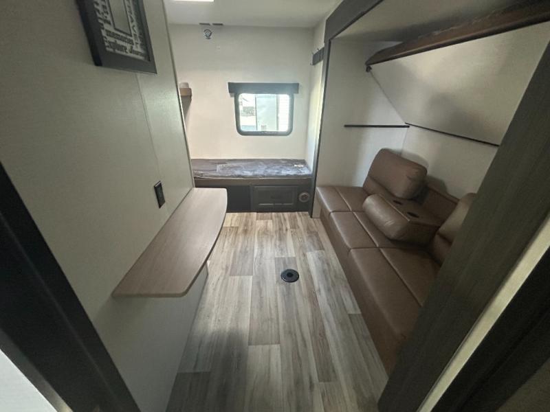 It's a clean decision with a bath and a half to take this travel trailer on your next camping trip! The rear private bunkhouse is decked out with a 28" x 70" bunk bed, a 32" x 70" top bunk, a 28" x 73" flip-up bunk above a 72" sofa with table, and a flip desk to do some school work. The half bathroom has an entry/exit door so you can get back to cooking at the outdoor campfire café which has two outdoor 3 cu. ft. refrigerators, a sink, griddle, and storage. Your clean up will be a breeze thanks to the kitchen island with a large sink and dish drying rack. If you need extra sleeping space then simply convert the 70" sofa at night. There is also a Sit N' Slide table with flipside reversible cushions. Those staying in the front private bedroom will enjoy a good night's rest on the Sleep Tight queen bed and have the convenience of accessing the dual entry bathroom!