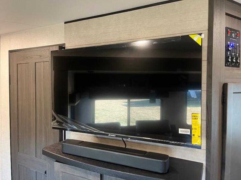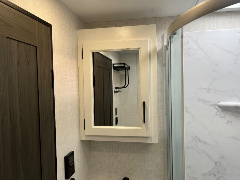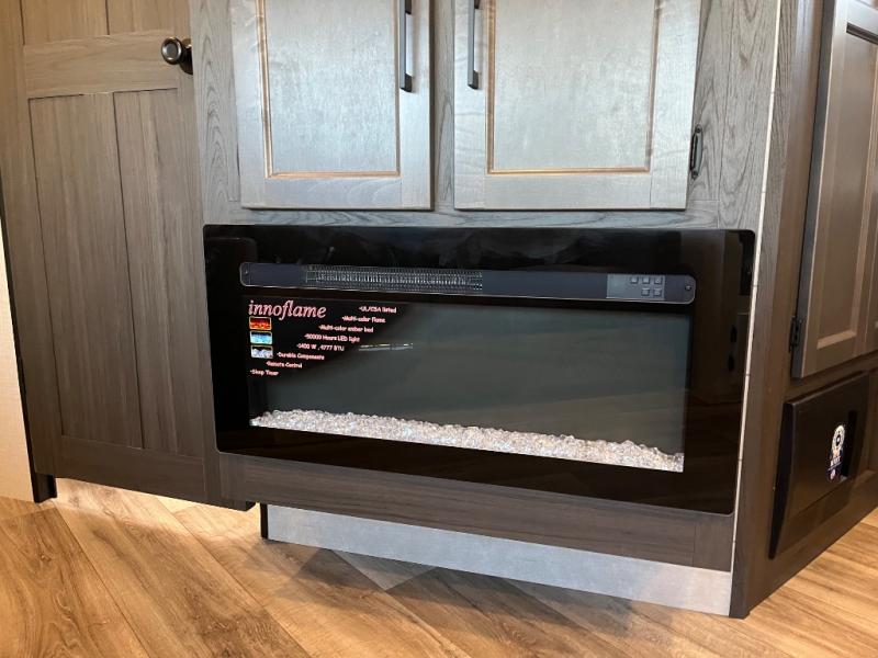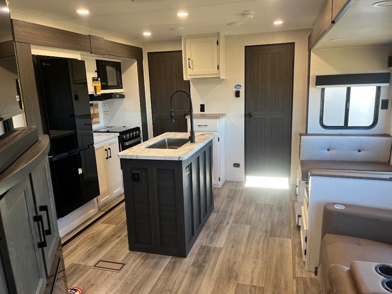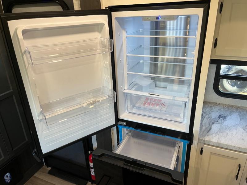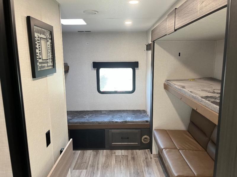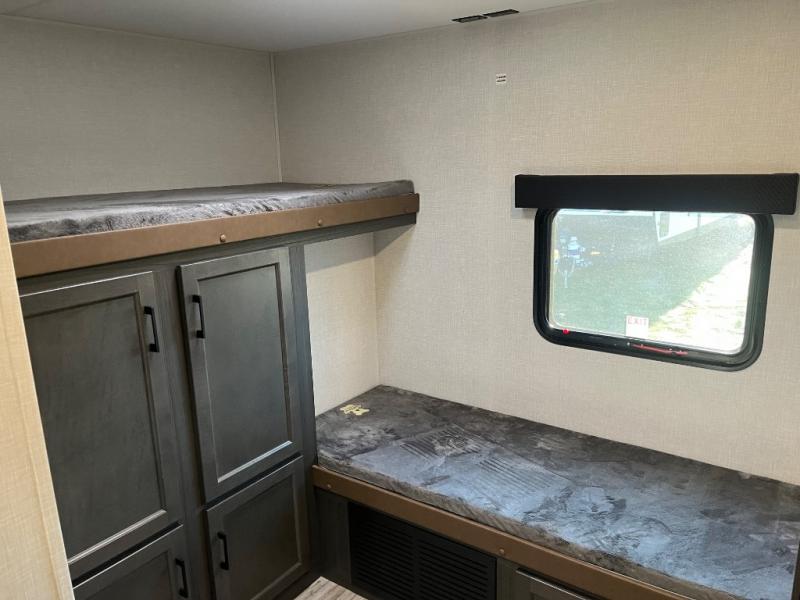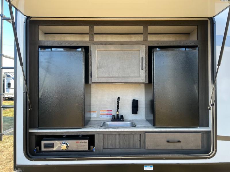 It's a clean decision with a bath and a half to take this travel trailer on your next camping trip! The rear private bunkhouse is decked out with a 28" x 70" bunk bed, a 32" x 70" top bunk, a 28" x 73" flip-up bunk above a 72" sofa with table, and a flip desk to do some school work. The half bathroom has an entry/exit door so you can get back to cooking at the outdoor campfire café which has two outdoor 3 cu. ft. refrigerators, a sink, griddle, and storage. Your clean up will be a breeze thanks to the kitchen island with a large sink and dish drying rack. If you need extra sleeping space then simply convert the 70" sofa at night. There is also a Sit N' Slide table with flipside reversible cushions. Those staying in the front private bedroom will enjoy a good night's rest on the Sleep Tight queen bed and have the convenience of accessing the dual entry bathroom!