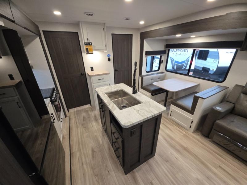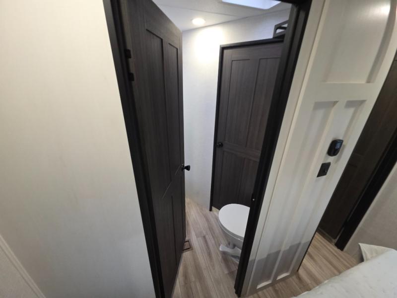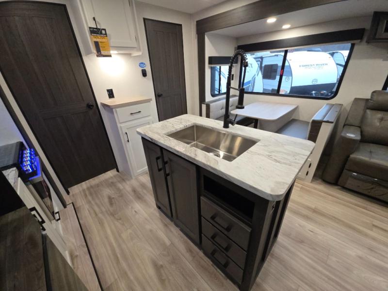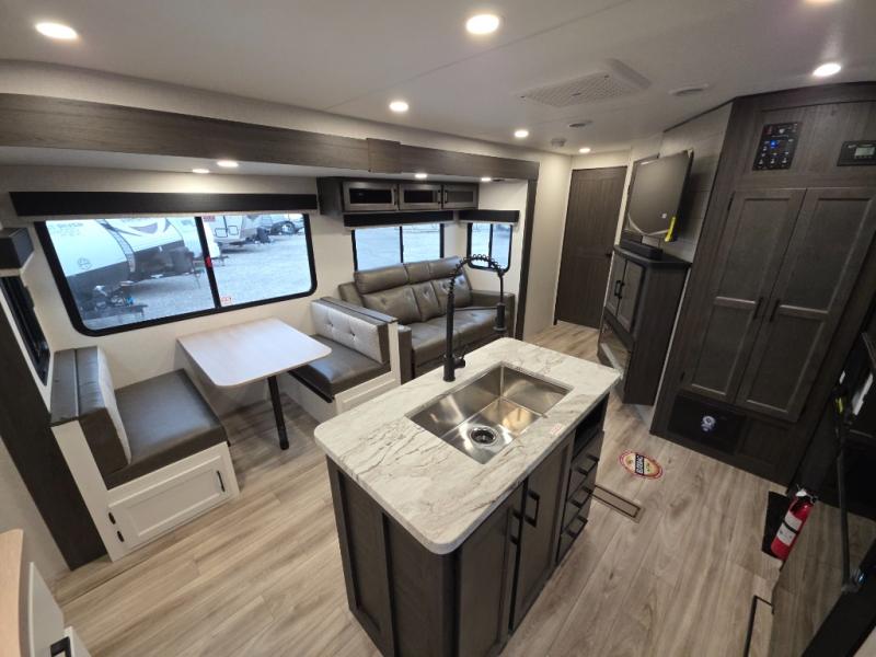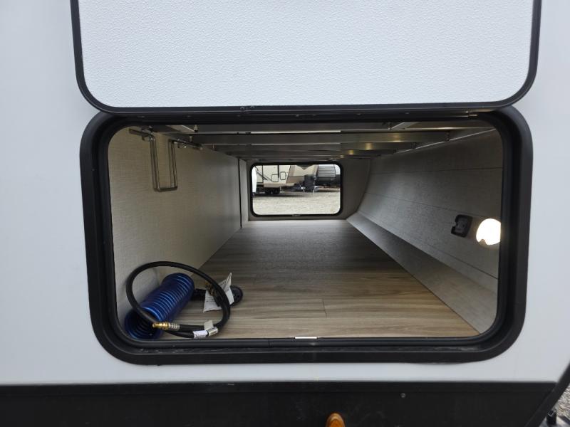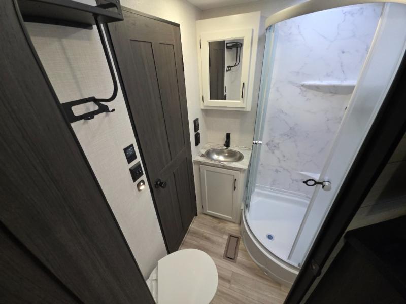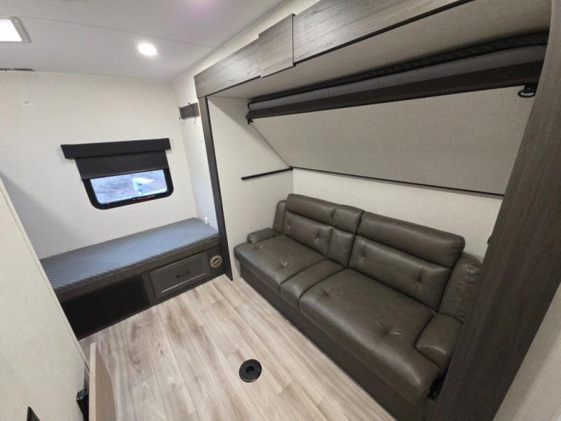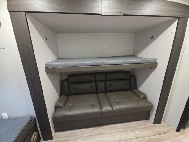 It's a clean decision with a bath and a half to take this travel trailer on your next camping trip! The rear private bunkhouse is decked out with a 28" x 70" bunk bed, a 32" x 70" top bunk, a 28" x 73" flip-up bunk above a 72" sofa with table, and a flip desk to do some school work. The half bathroom has an entry/exit door so you can get back to cooking at the outdoor campfire café which has two outdoor 3 cu. ft. refrigerators, a sink, griddle, and storage. Your clean up will be a breeze thanks to the kitchen island with a large sink and dish drying rack. If you need extra sleeping space then simply convert the 70" sofa at night. There is also a Sit N' Slide table with flipside reversible cushions. Those staying in the front private bedroom will enjoy a good night's rest on the Sleep Tight queen bed and have the convenience of accessing the dual entry bathroom!
