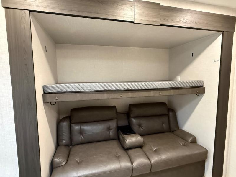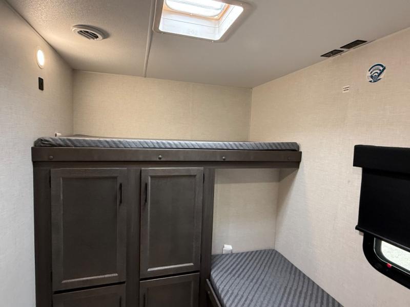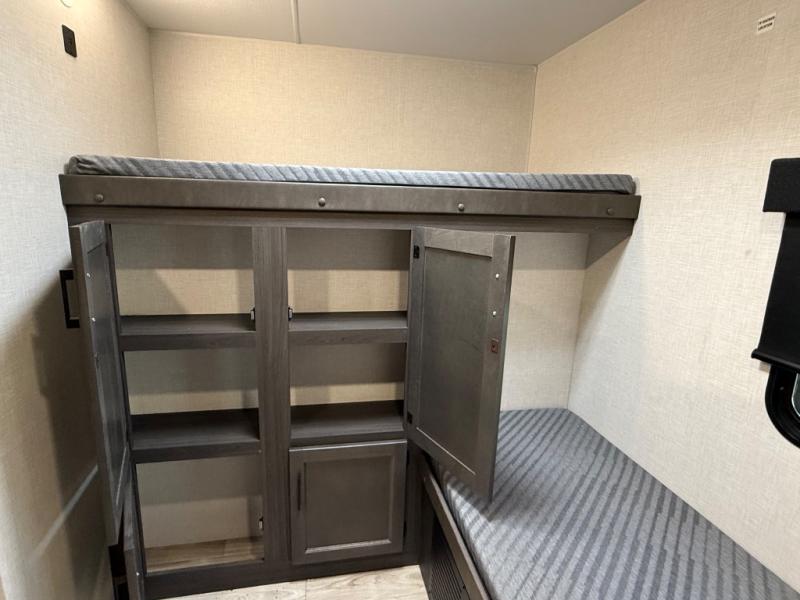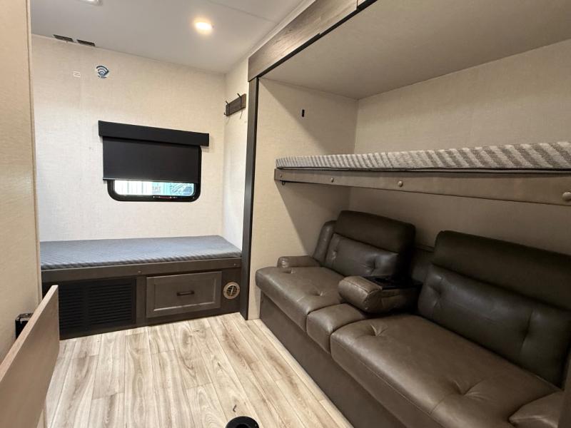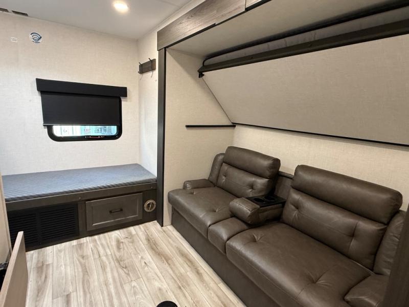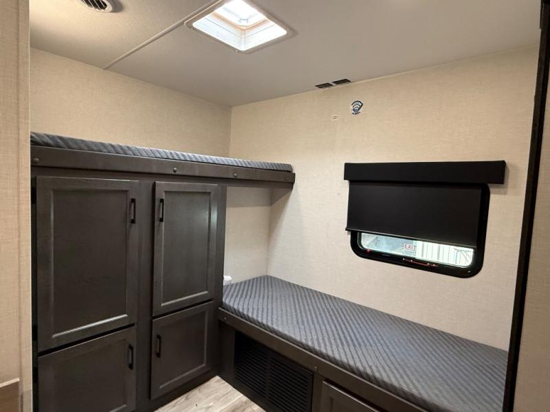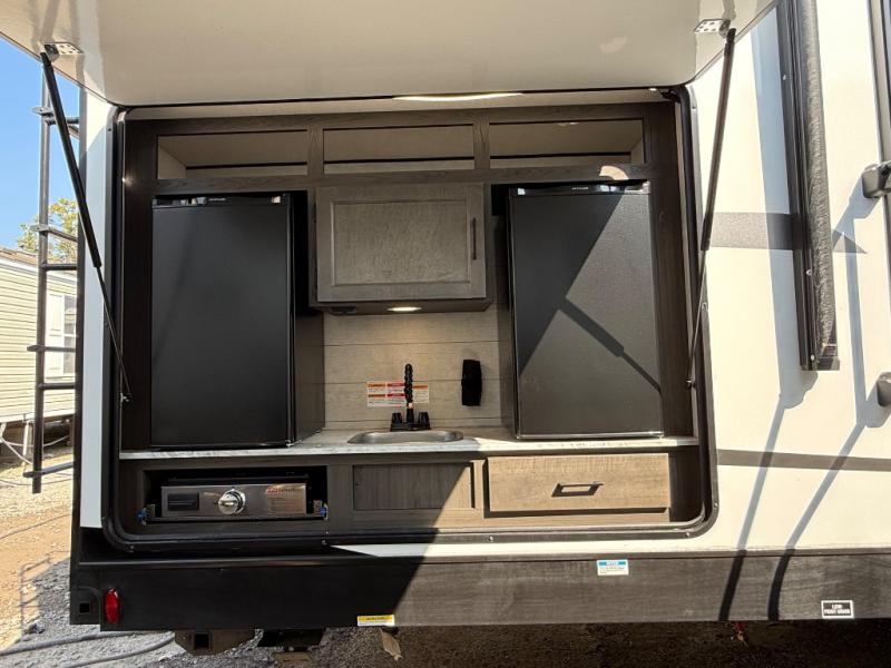 It's a clean decision with a bath and a half to take this travel trailer on your next camping trip! The rear private bunkhouse is decked out with a 28" x 70" bunk bed, a 32" x 70" top bunk, a 28" x 73" flip-up bunk above a 72" sofa with table, and a flip desk to do some school work. The half bathroom has an entry/exit door so you can get back to cooking at the outdoor campfire café which has two outdoor 3 cu. ft. refrigerators, a sink, griddle, and storage. Your clean up will be a breeze thanks to the kitchen island with a large sink and dish drying rack. If you need extra sleeping space then simply convert the 70" sofa at night. There is also a Sit N' Slide table with flipside reversible cushions. Those staying in the front private bedroom will enjoy a good night's rest on the Sleep Tight queen bed and have the convenience of accessing the dual entry bathroom!