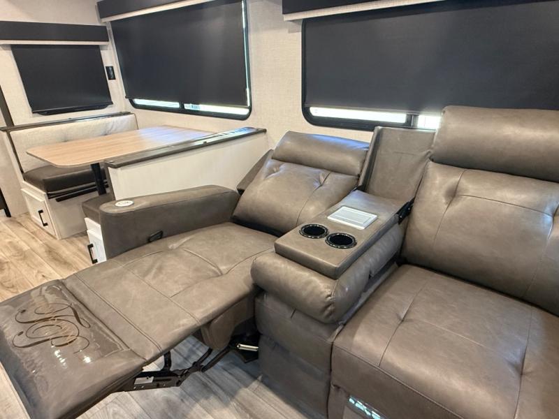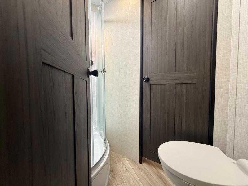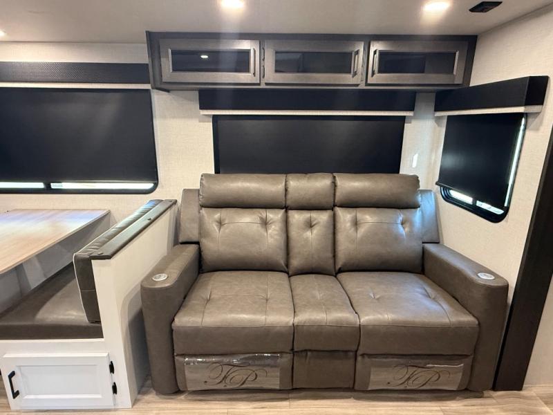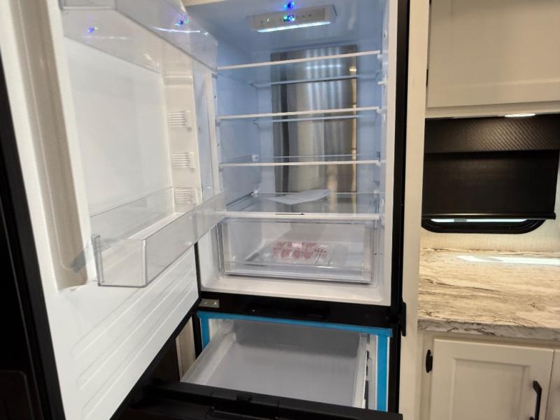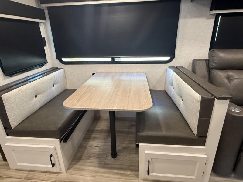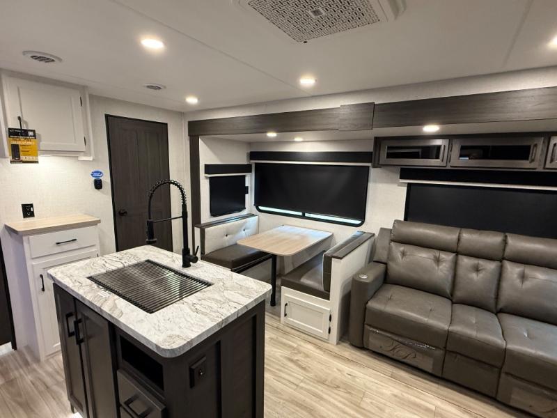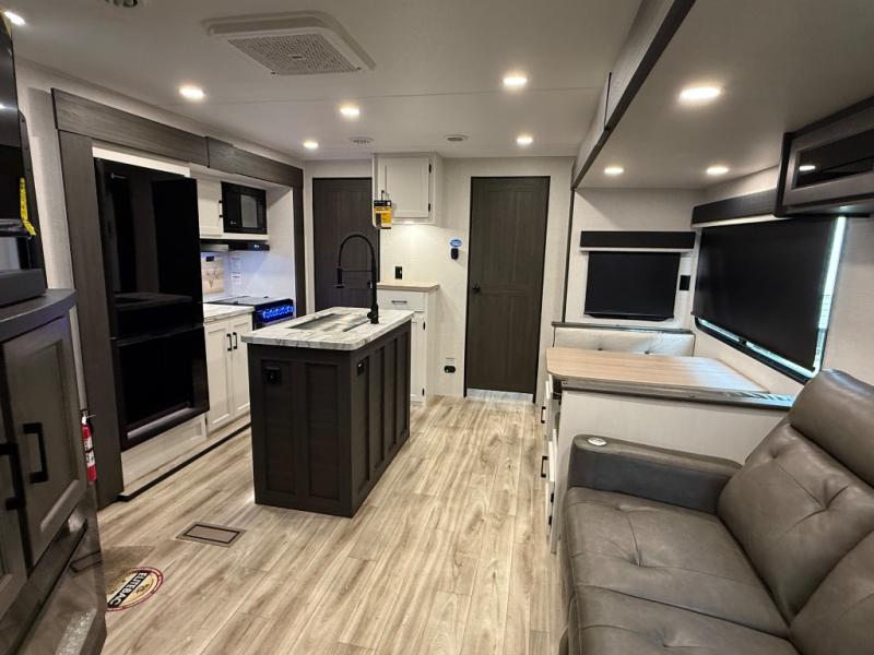 It's a clean decision with a bath and a half to take this travel trailer on your next camping trip! The rear private bunkhouse is decked out with a 28" x 70" bunk bed, a 32" x 70" top bunk, a 28" x 73" flip-up bunk above a 72" sofa with table, and a flip desk to do some school work. The half bathroom has an entry/exit door so you can get back to cooking at the outdoor campfire café which has two outdoor 3 cu. ft. refrigerators, a sink, griddle, and storage. Your clean up will be a breeze thanks to the kitchen island with a large sink and dish drying rack. If you need extra sleeping space then simply convert the 70" sofa at night. There is also a Sit N' Slide table with flipside reversible cushions. Those staying in the front private bedroom will enjoy a good night's rest on the Sleep Tight queen bed and have the convenience of accessing the dual entry bathroom!