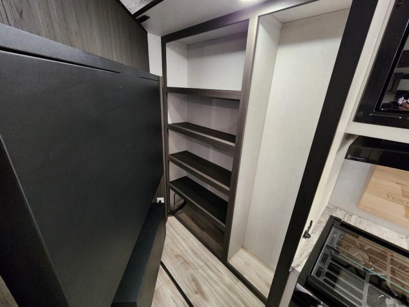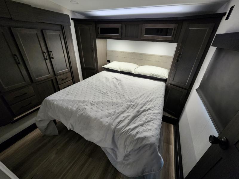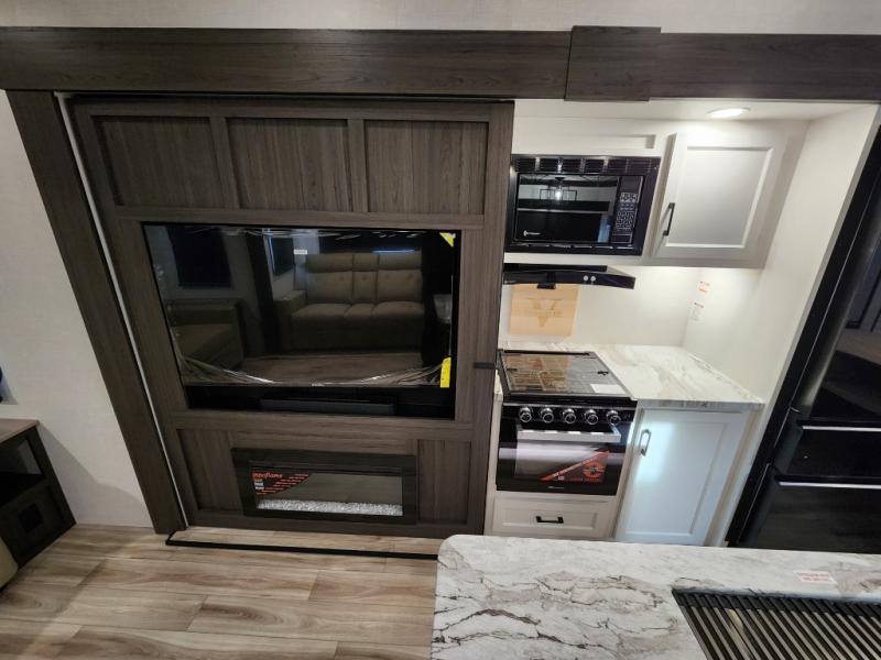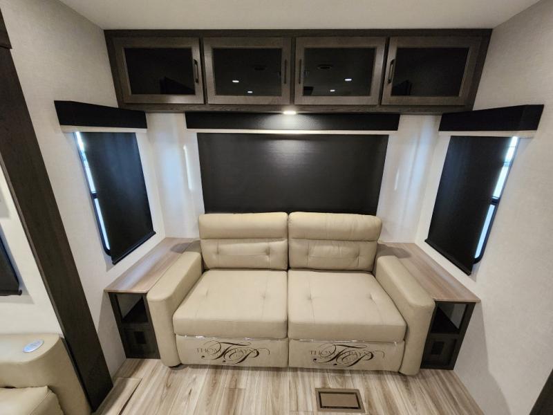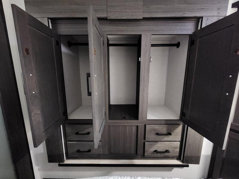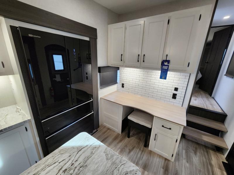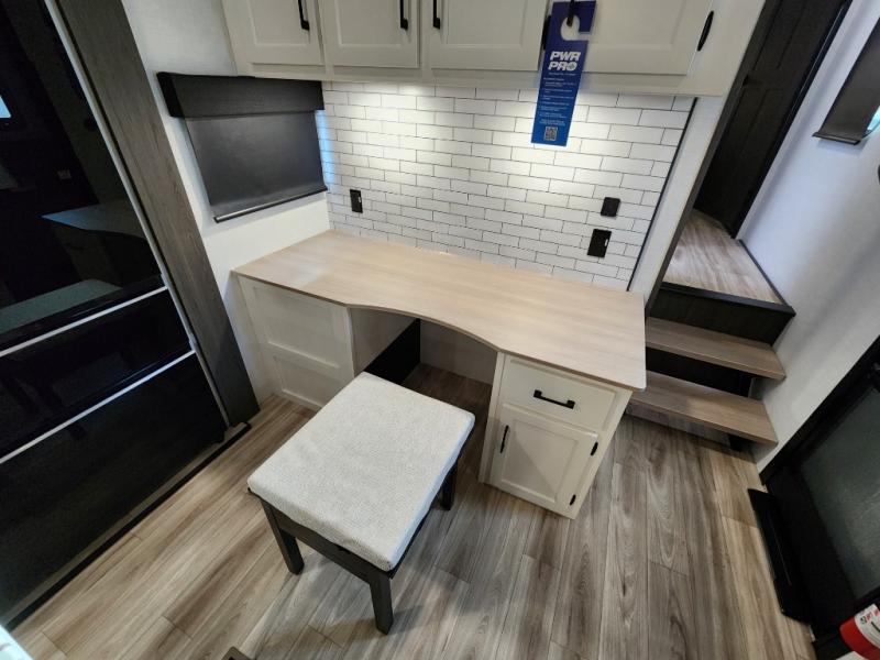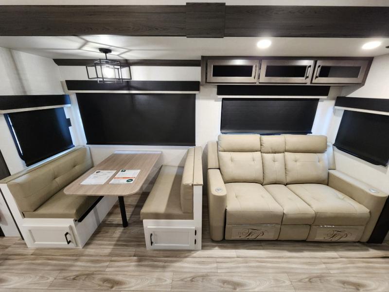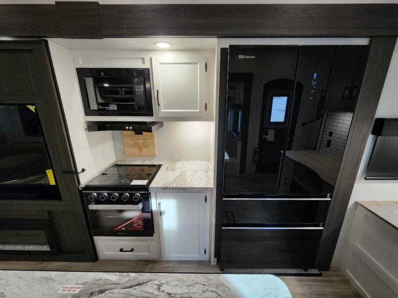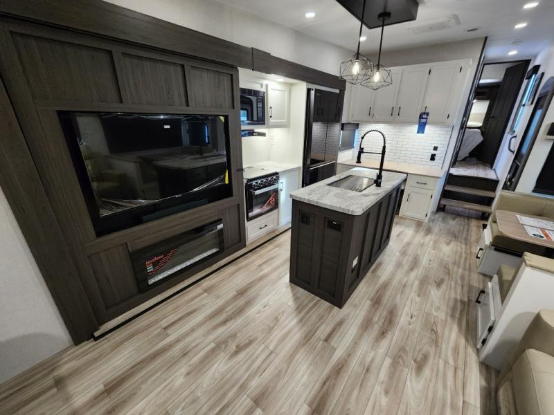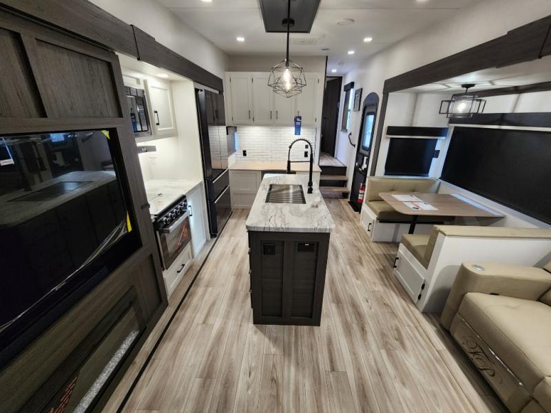 At the front of the fifth wheel, you’ll find a private bedroom designed for rest and relaxation, featuring a 60" x 80" Sleep Tight queen bed and a spacious slide-out wardrobe, with additional wardrobes on each side for all your clothing and essentials. Down the hall, the full bathroom offers residential comfort with a 30" x 36" shower with glass slider door, a porcelain foot-flush toilet, and an oval stainless-steel sink. In the center and rear, the open living and kitchen area features dual opposing slides for generous floor space. The fully equipped kitchen includes a pantry, three-burner range with flush-mount glass cover, 21" oven with air fryer, microwave, and a large 18 cu. ft. refrigerator, plus a center island with sink and added counter space. Nearby, a desk and hutch provide versatility for work or storage, while the table with chairs and Versa benches and theater seating make it easy to dine or relax. At the rear, a 70" tri-fold sofa offers the perfect spot to unwind and easily converts into extra-sleeping space when needed.