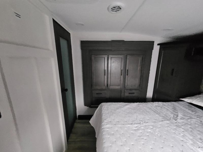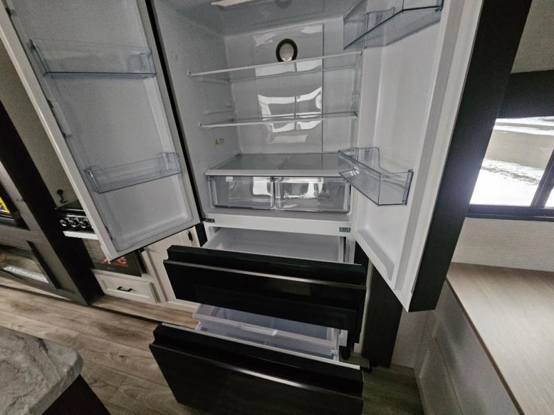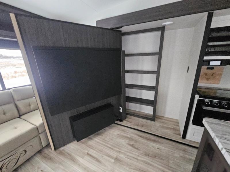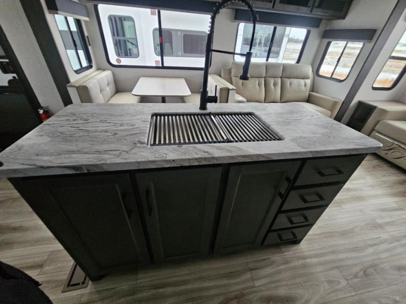 At the front of the fifth wheel, you’ll find a private bedroom designed for rest and relaxation, featuring a 60" x 80" Sleep Tight queen bed and a spacious slide-out wardrobe, with additional wardrobes on each side for all your clothing and essentials. Down the hall, the full bathroom offers residential comfort with a 30" x 36" shower with glass slider door, a porcelain foot-flush toilet, and an oval stainless-steel sink. In the center and rear, the open living and kitchen area features dual opposing slides for generous floor space. The fully equipped kitchen includes a pantry, three-burner range with flush-mount glass cover, 21" oven with air fryer, microwave, and a large 18 cu. ft. refrigerator, plus a center island with sink and added counter space. Nearby, a desk and hutch provide versatility for work or storage, while the table with chairs and Versa benches and theater seating make it easy to dine or relax. At the rear, a 70" tri-fold sofa offers the perfect spot to unwind and easily converts into extra-sleeping space when needed.