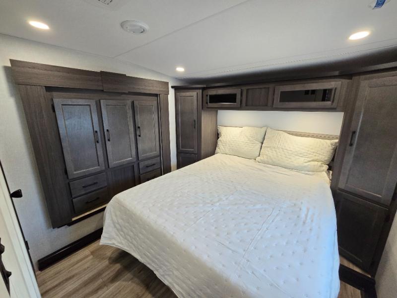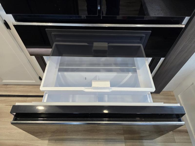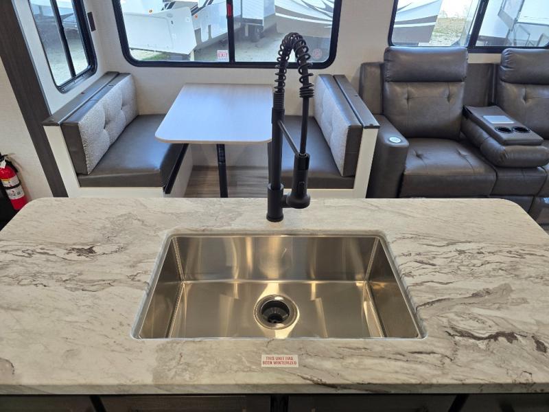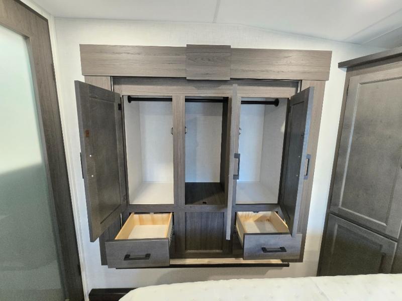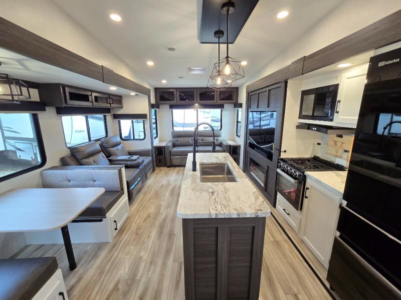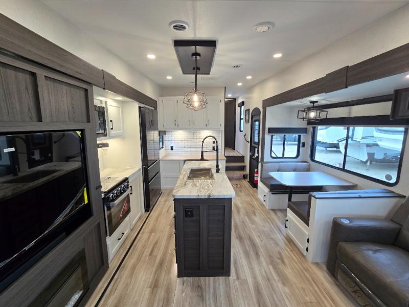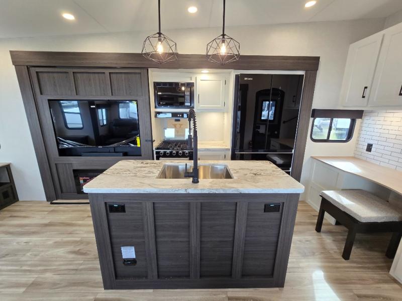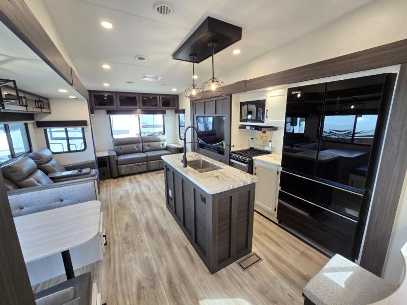At the front of the fifth wheel, you’ll find a private bedroom designed for rest and relaxation, featuring a 60" x 80" Sleep Tight queen bed and a spacious slide-out wardrobe, with additional wardrobes on each side for all your clothing and essentials. Down the hall, the full bathroom offers residential comfort with a 30" x 36" shower with glass slider door, a porcelain foot-flush toilet, and an oval stainless-steel sink. In the center and rear, the open living and kitchen area features dual opposing slides for generous floor space. The fully equipped kitchen includes a pantry, three-burner range with flush-mount glass cover, 21" oven with air fryer, microwave, and a large 18 cu. ft. refrigerator, plus a center island with sink and added counter space. Nearby, a desk and hutch provide versatility for work or storage, while the table with chairs and Versa benches and theater seating make it easy to dine or relax. At the rear, a 70" tri-fold sofa offers the perfect spot to unwind and easily converts into extra-sleeping space when needed.