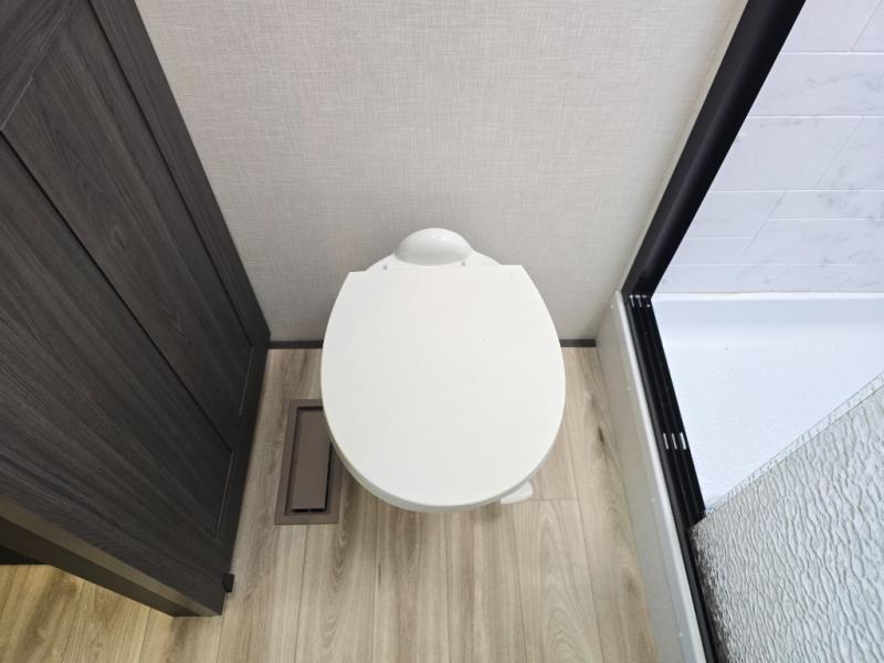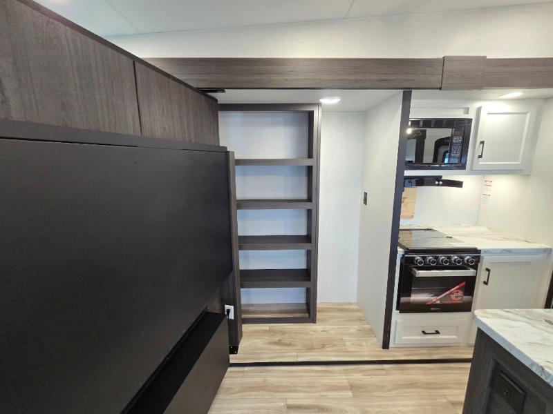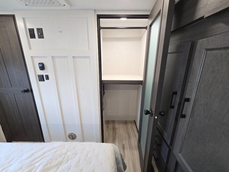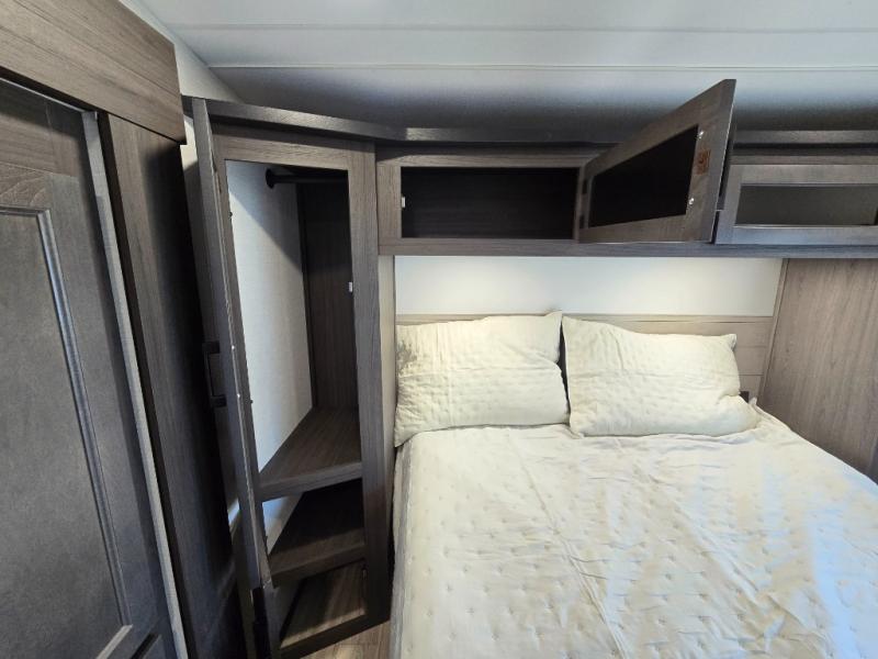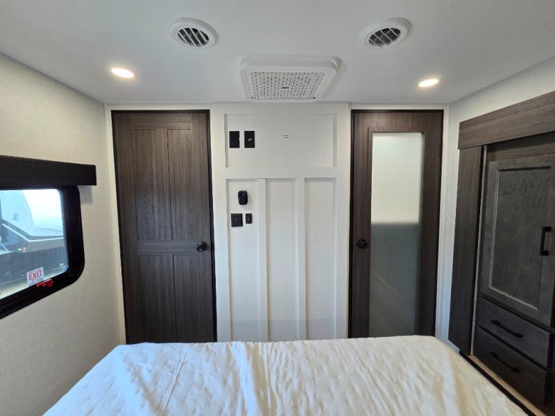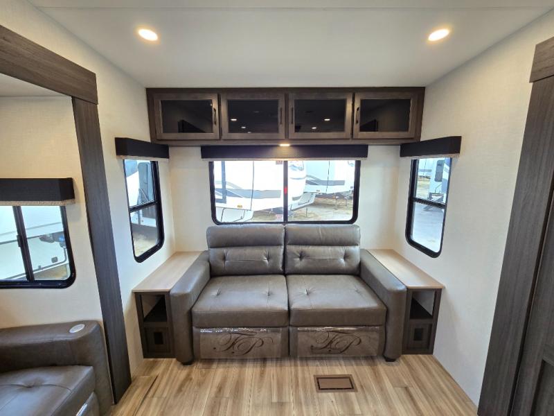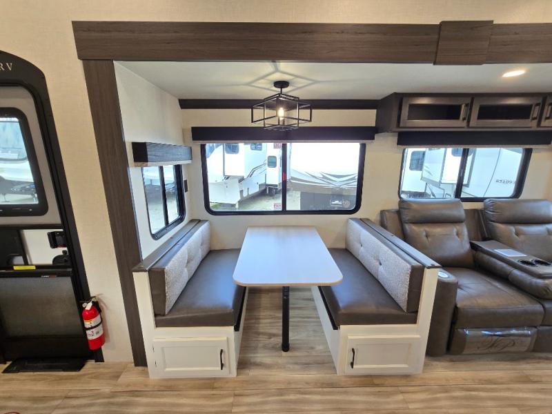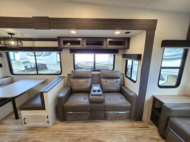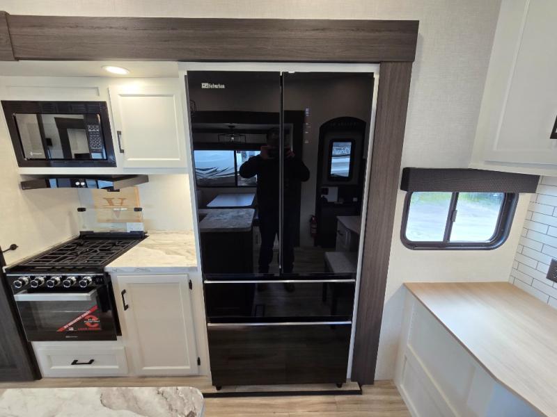 At the front of the fifth wheel, you’ll find a private bedroom designed for rest and relaxation, featuring a 60" x 80" Sleep Tight queen bed and a spacious slide-out wardrobe, with additional wardrobes on each side for all your clothing and essentials. Down the hall, the full bathroom offers residential comfort with a 30" x 36" shower with glass slider door, a porcelain foot-flush toilet, and an oval stainless-steel sink. In the center and rear, the open living and kitchen area features dual opposing slides for generous floor space. The fully equipped kitchen includes a pantry, three-burner range with flush-mount glass cover, 21" oven with air fryer, microwave, and a large 18 cu. ft. refrigerator, plus a center island with sink and added counter space. Nearby, a desk and hutch provide versatility for work or storage, while the table with chairs and Versa benches and theater seating make it easy to dine or relax. At the rear, a 70" tri-fold sofa offers the perfect spot to unwind and easily converts into extra-sleeping space when needed.